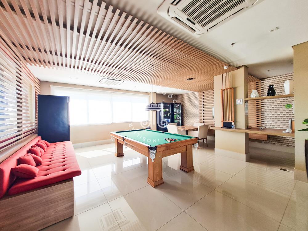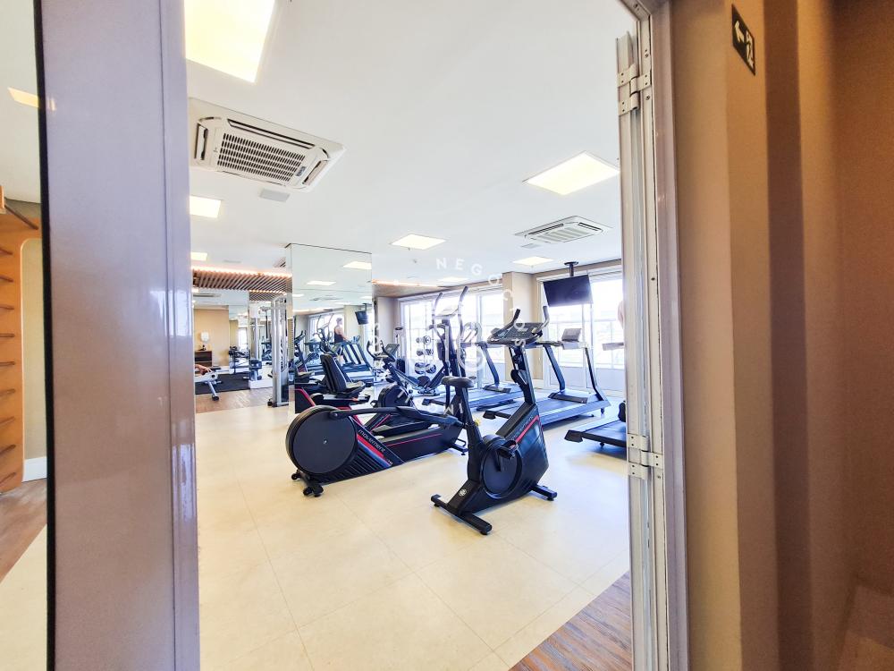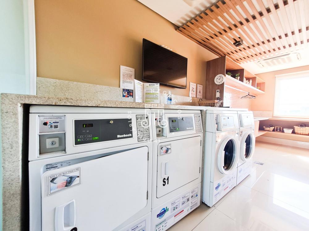 O imóvel conta com uma suíte com armários planejados, cama box tamanho queen, mesa de escritório e ar-condicionado. A cozinha planejada está equipada com fogão, geladeira Electrolux três portas, exaustor, forno elétrico e forno micro-ondas. Há mesa de jantar para quatro lugares, sala integrada à cozinha com ar-condicionado 18.000 BTUs, lavabo e varanda com vista livre.