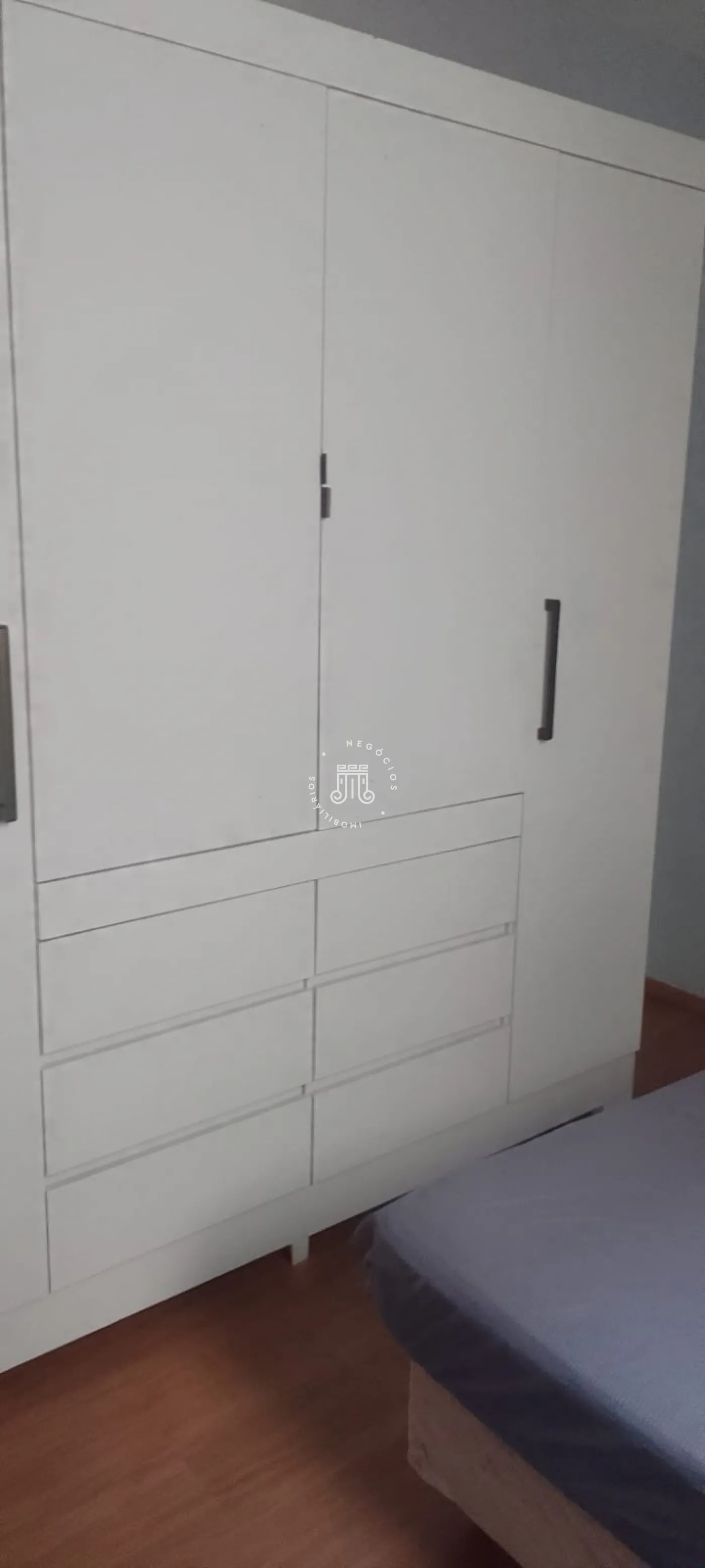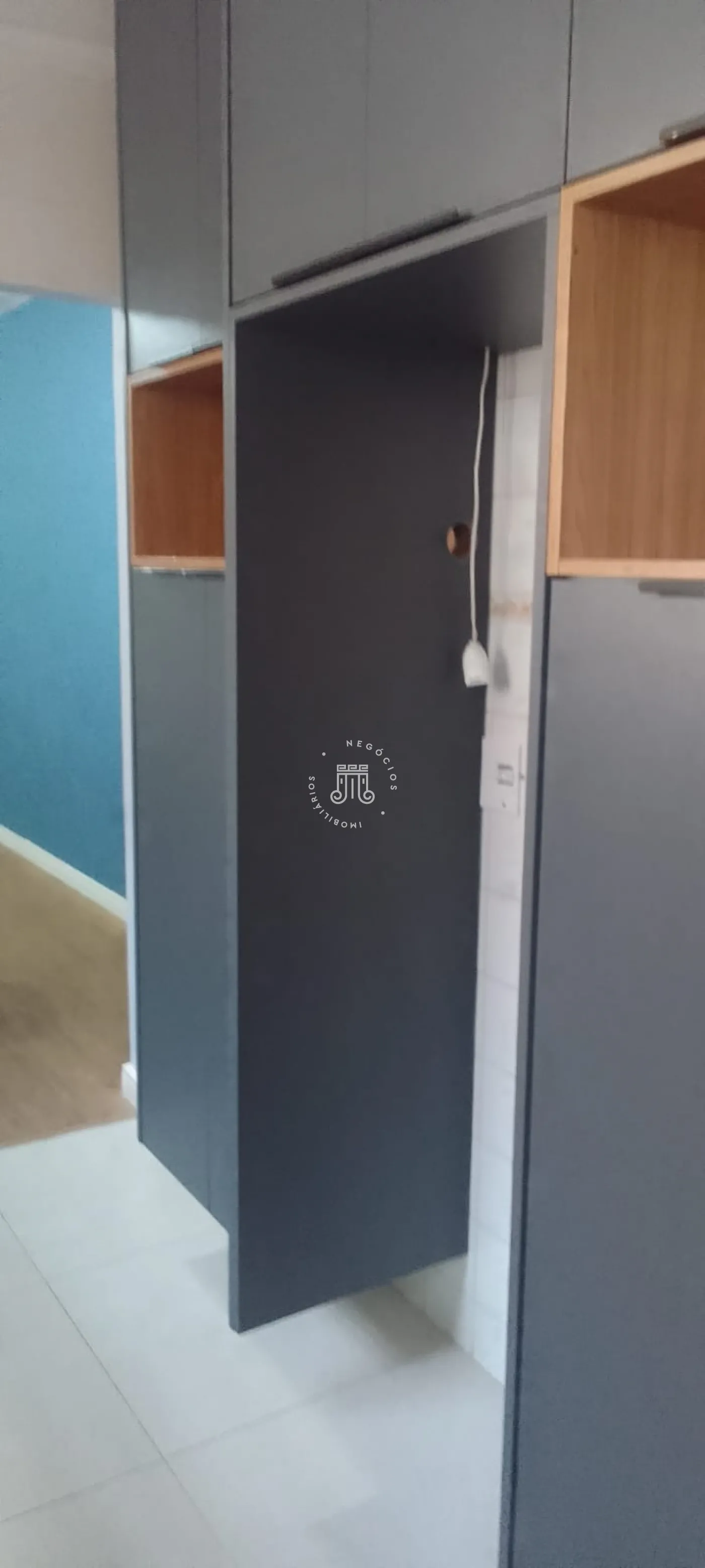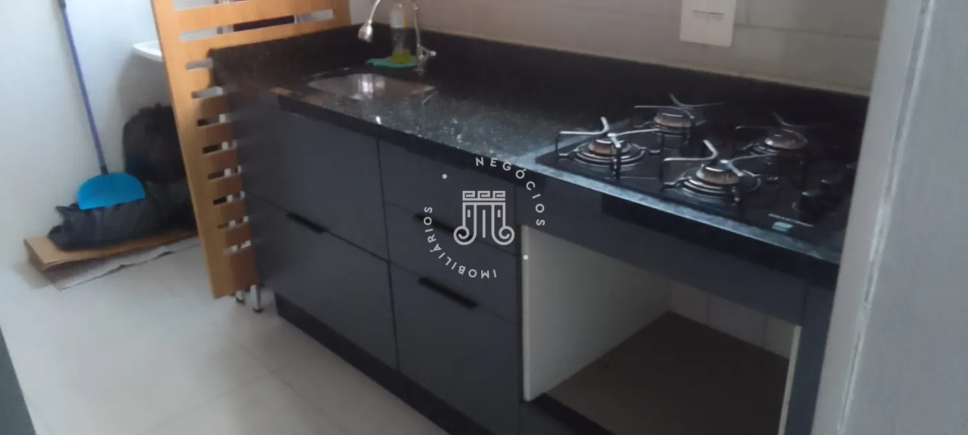 Apartamento com dois quartos com guarda-roupas, sala com painel para TV, cozinha com móveis planejados e fogão cooktop, lavanderia e banheiro social com box blindex.