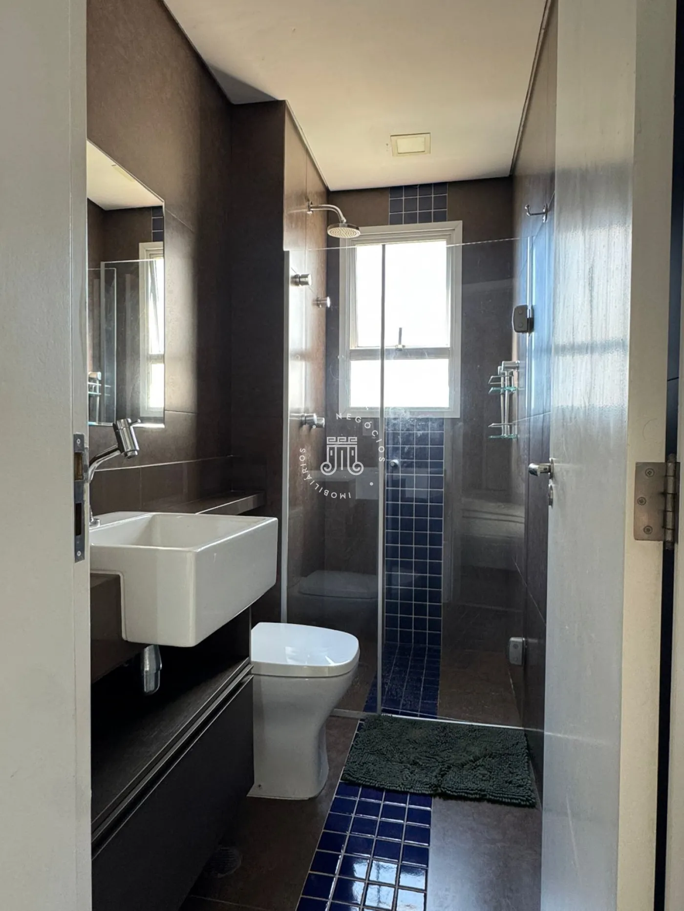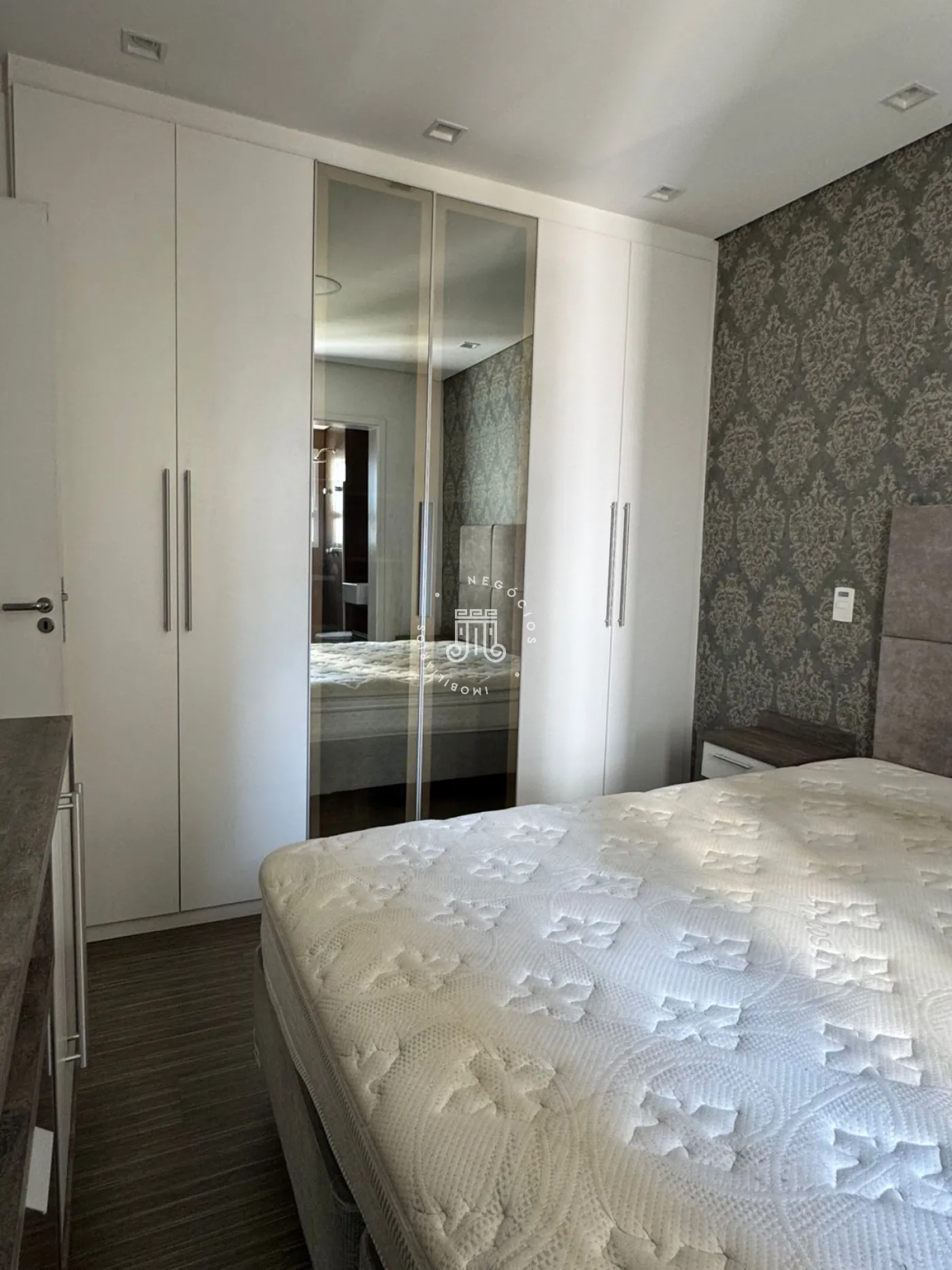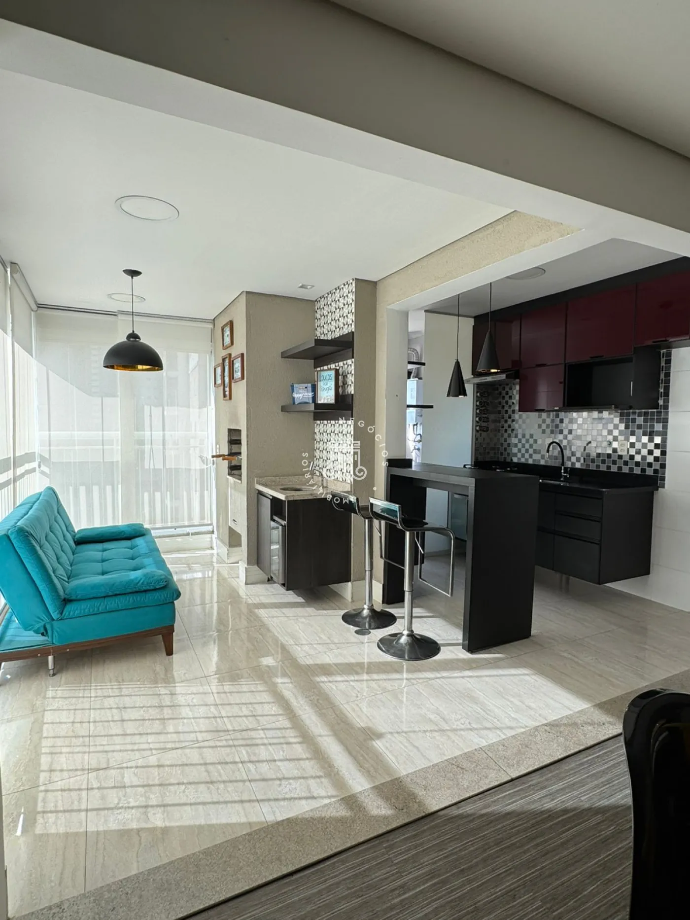 Imóvel com 70 m², 1 dormitório (suíte) com cama e guarda-roupa planejado, sala de estar e jantar estendida e mobiliada com mesa para seis cadeiras, aparador, sofá retrátil, painel de TV e cortina, sacada gourmet integrada com churrasqueira a carvão e sofá-cama, além de cozinha funcional equipada com cooktop, forno, exaustor e bancada com duas banquetas.