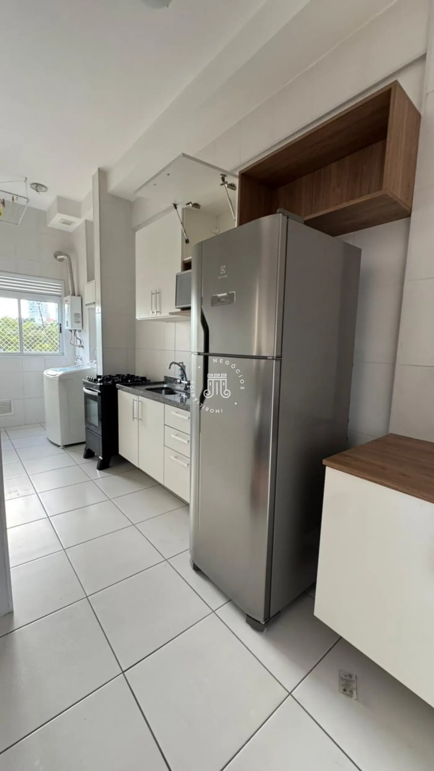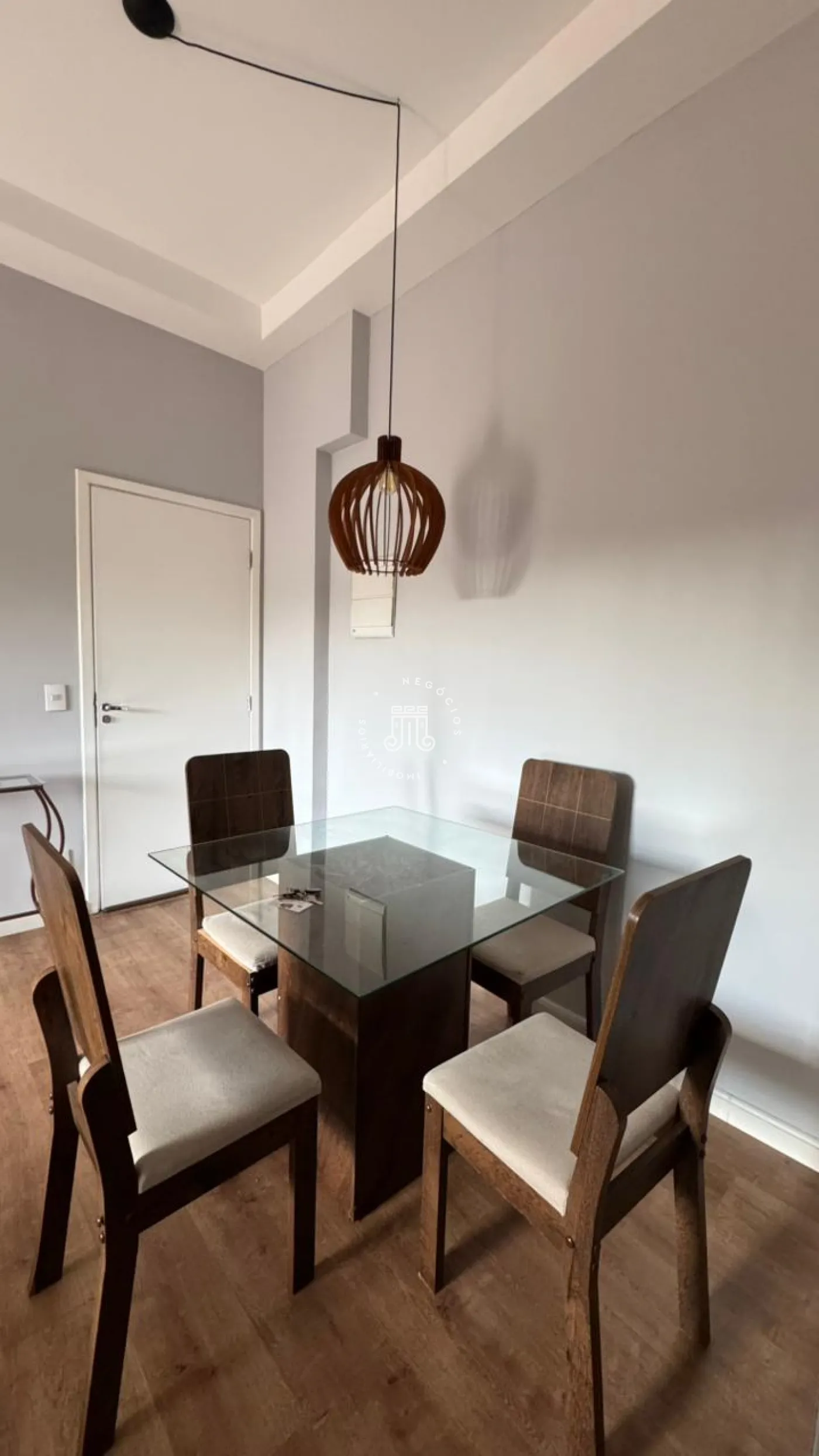 Apartamento de 67 m² com 2 dormitórios mobiliados, armários planejados na cozinha, quartos e banheiro, sala com sofá e mesa de jantar, sacada com móveis, vaga de garagem coberta e equipado com geladeira e fogão, pronto para morar.