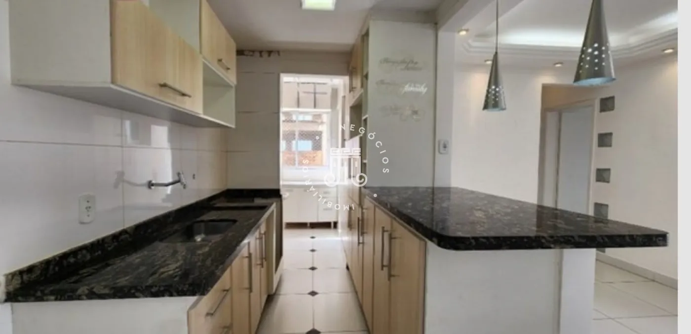 O imóvel possui três dormitórios, sendo um deles suíte, todos com armários planejados, sala com dois ambientes e sacada, cozinha com móveis planejados, banheiro social, área de serviço e uma vaga de garagem.