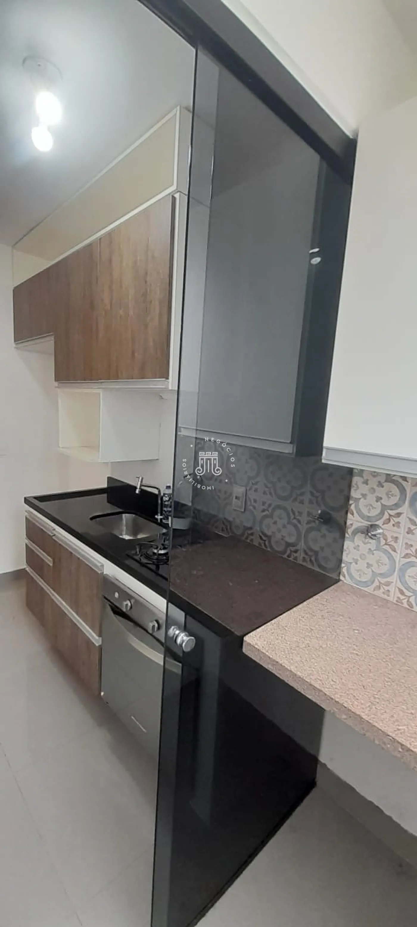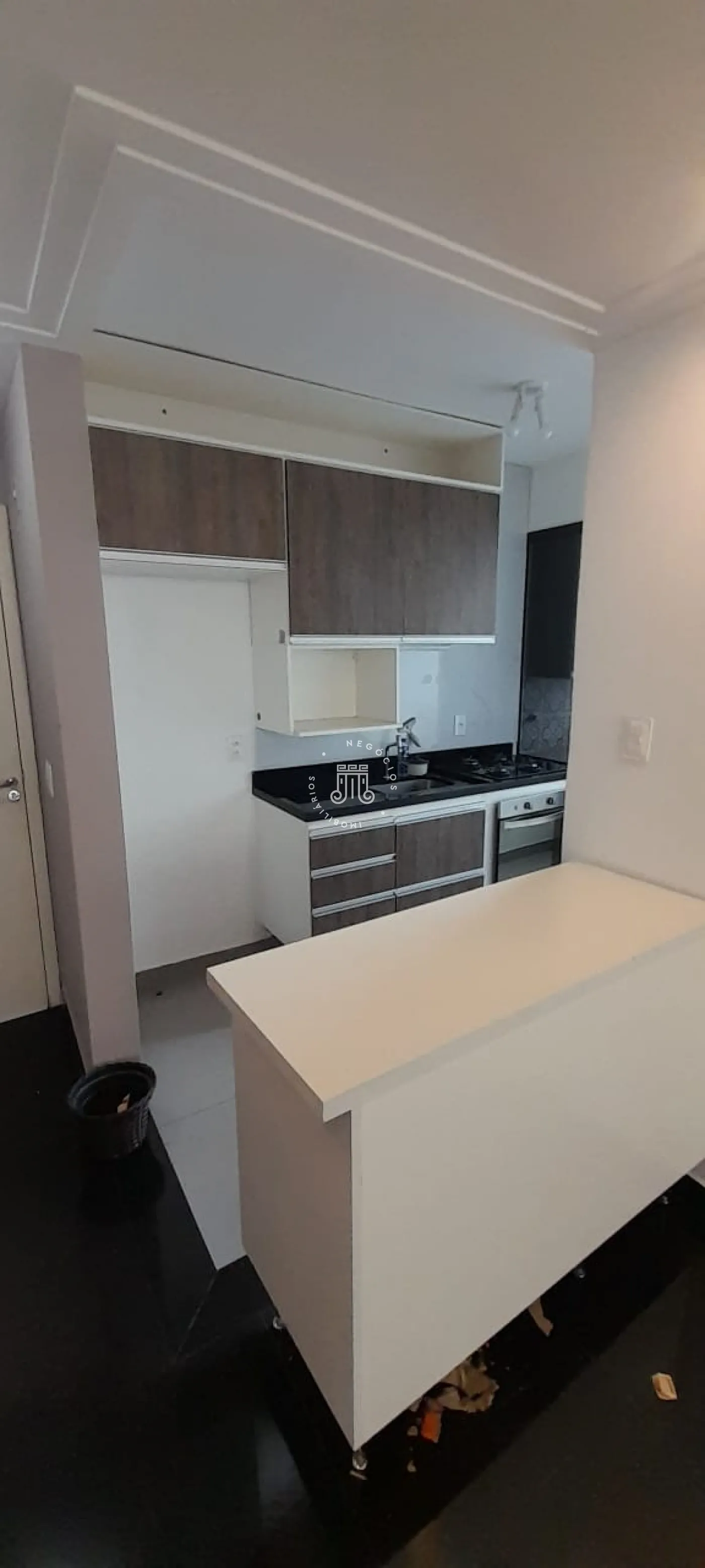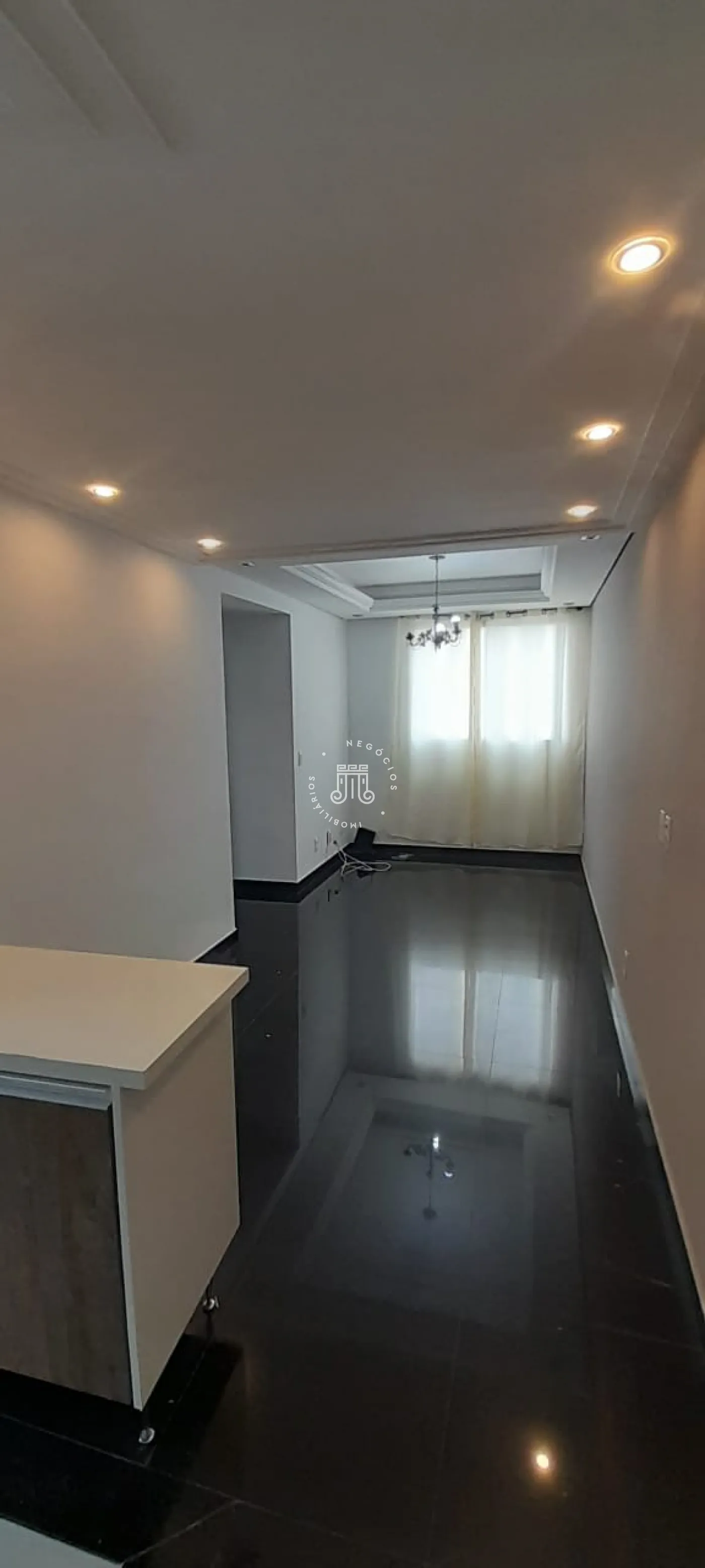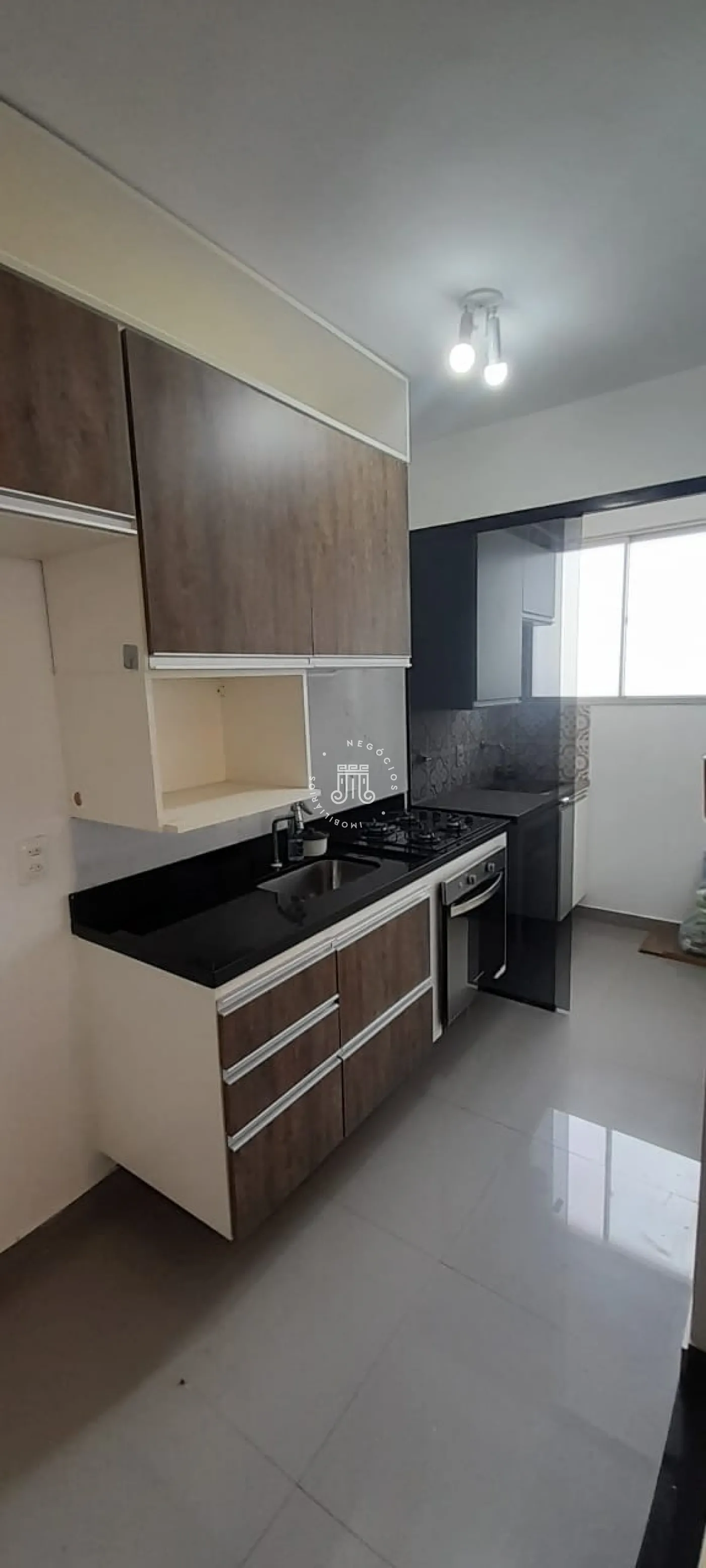 Composto por 2 quartos, sala para dois ambientes em piso porcelanato preto, sanca rebaixada em gesso com luminárias e lustre, cozinha planejada com fogão embutido, banheiro social com box blindex e gabinete com cuba separada e 1 vaga de garagem coberta.