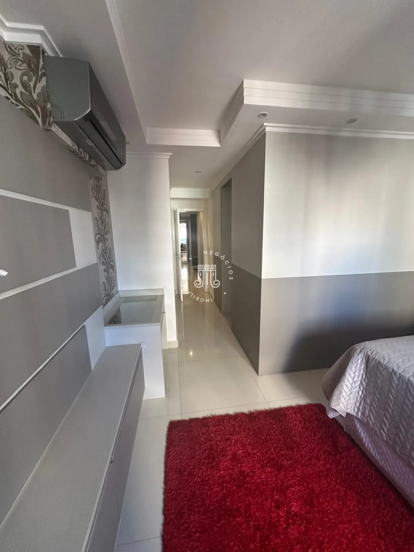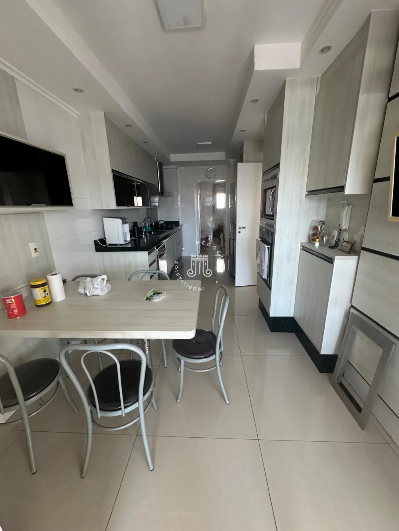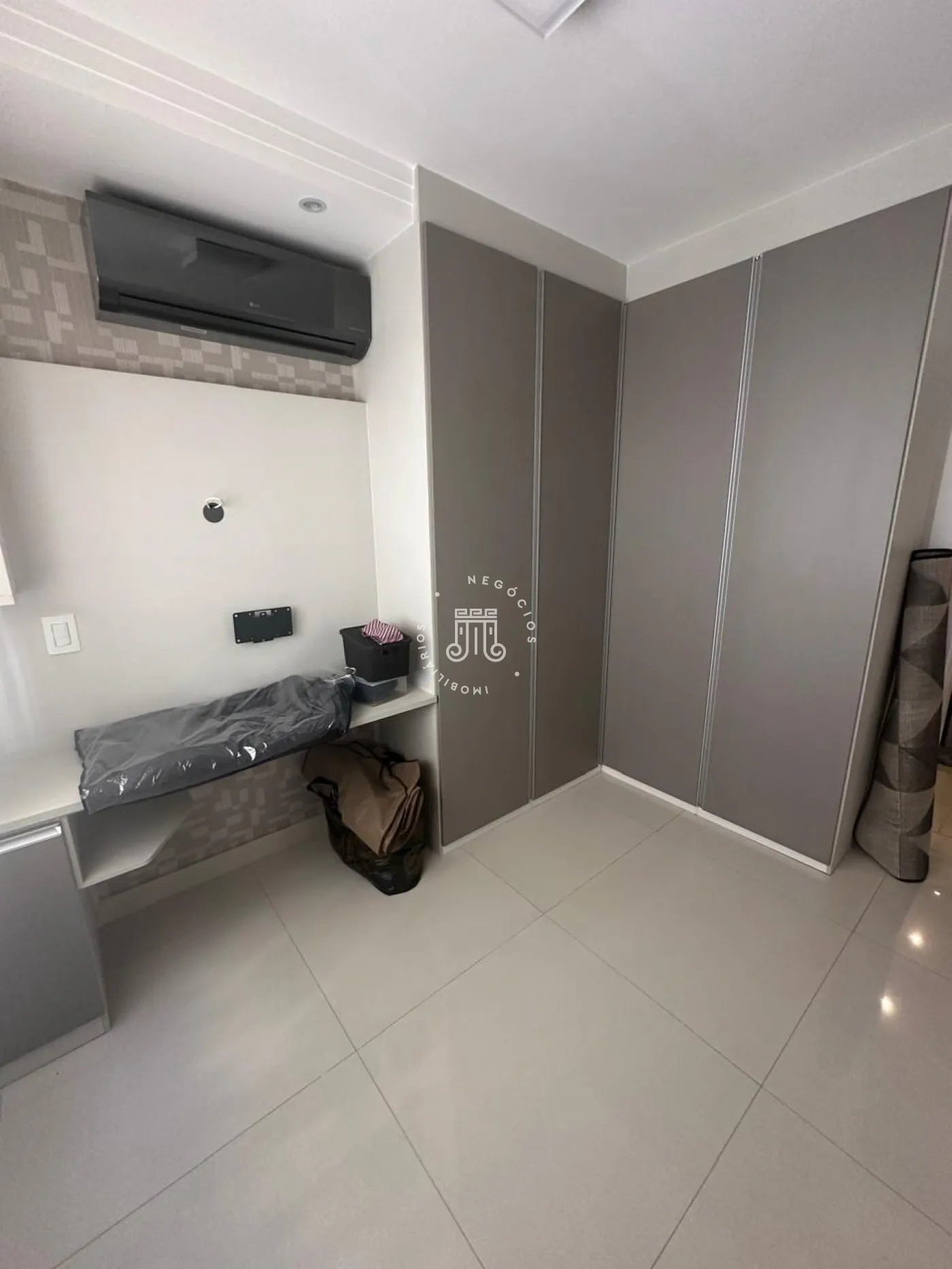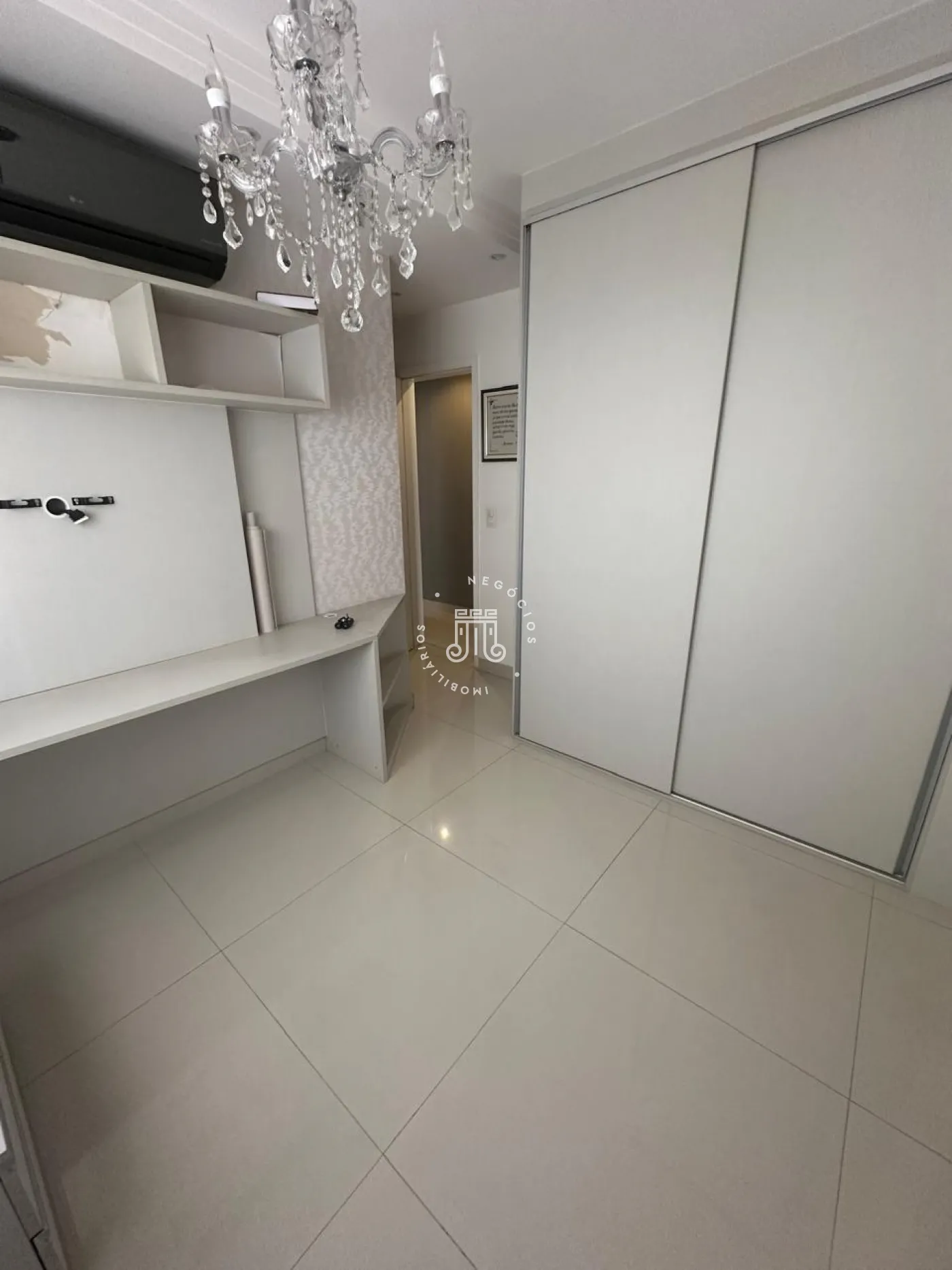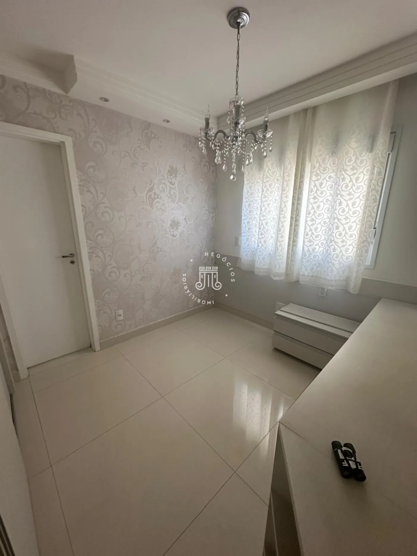 Composto por quatro suítes, sendo uma suíte máster. Todas as suítes contam com ar-condicionado e armários planejados. Sala para dois ambientes integrada à varanda gourmet envidraçada, com persianas. Andar alto, com vista livre para o nascer do sol. Cozinha com armários planejados e equipada com eletrodomésticos. Área de serviço com armários e banheiro. Três vagas de garagem.