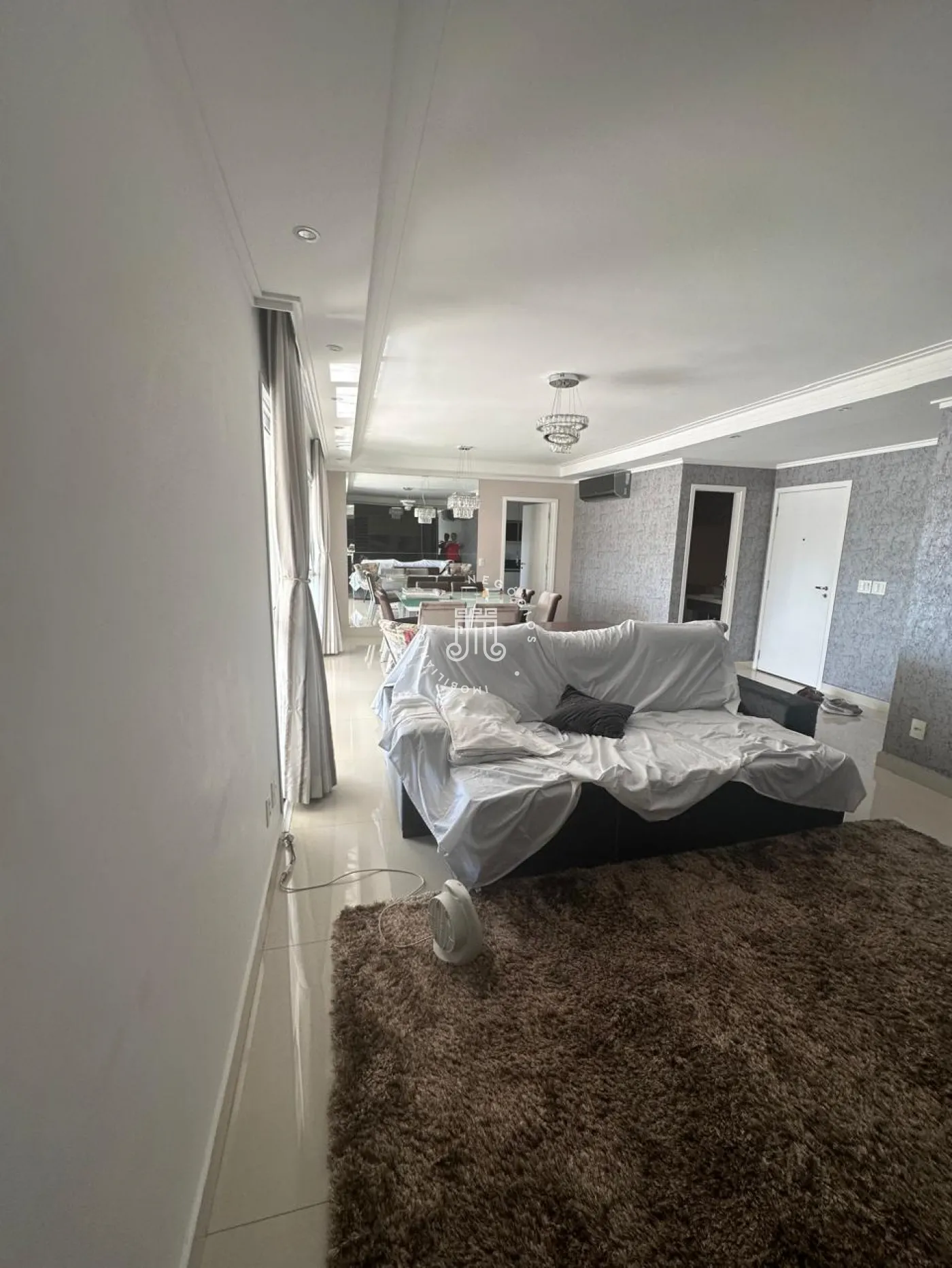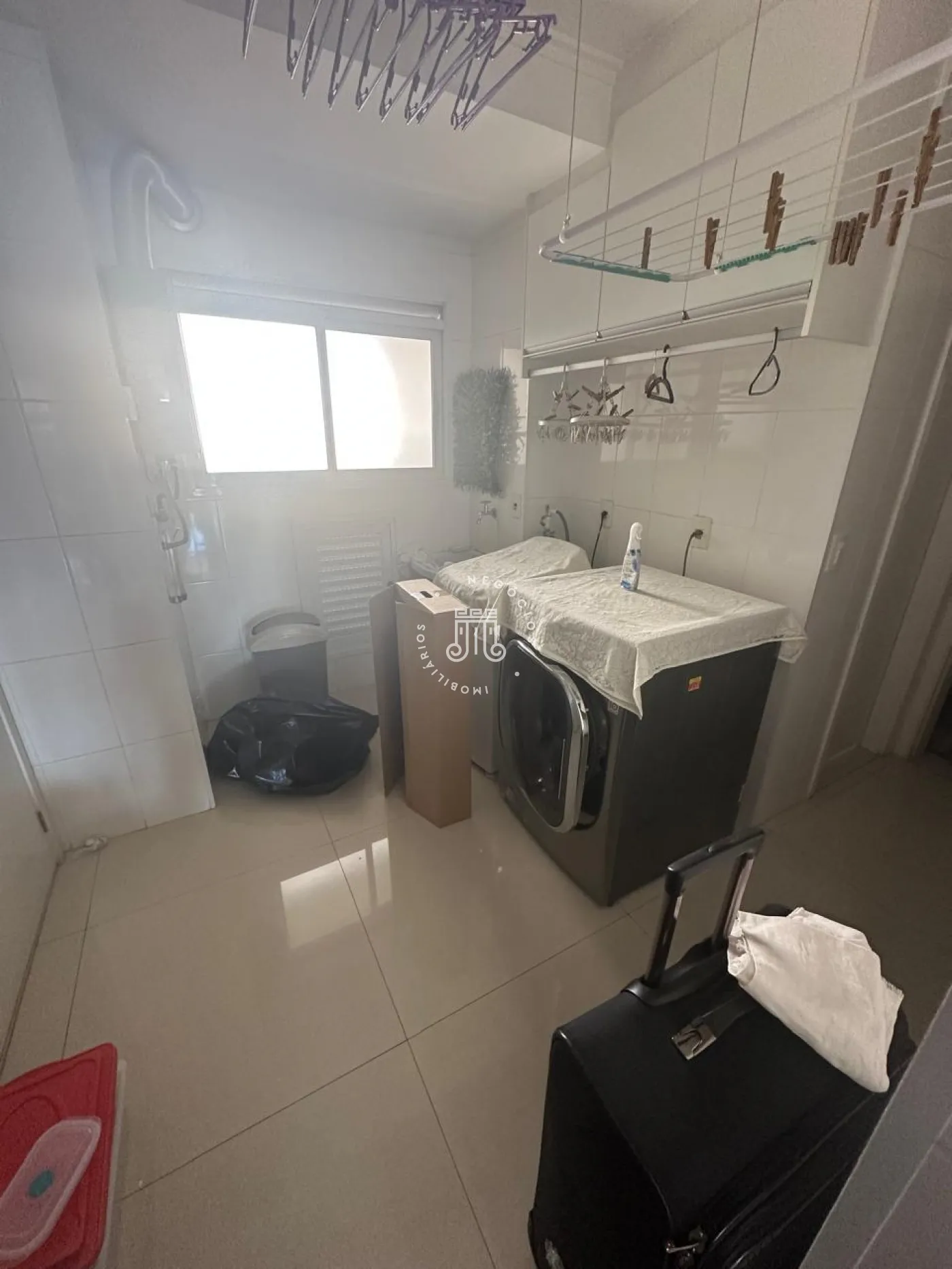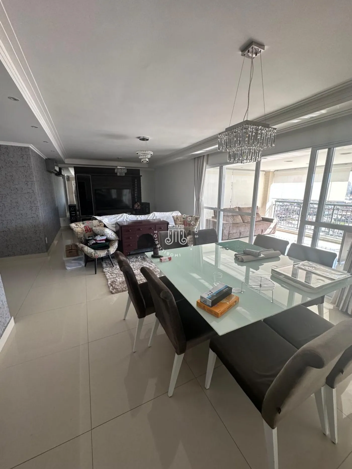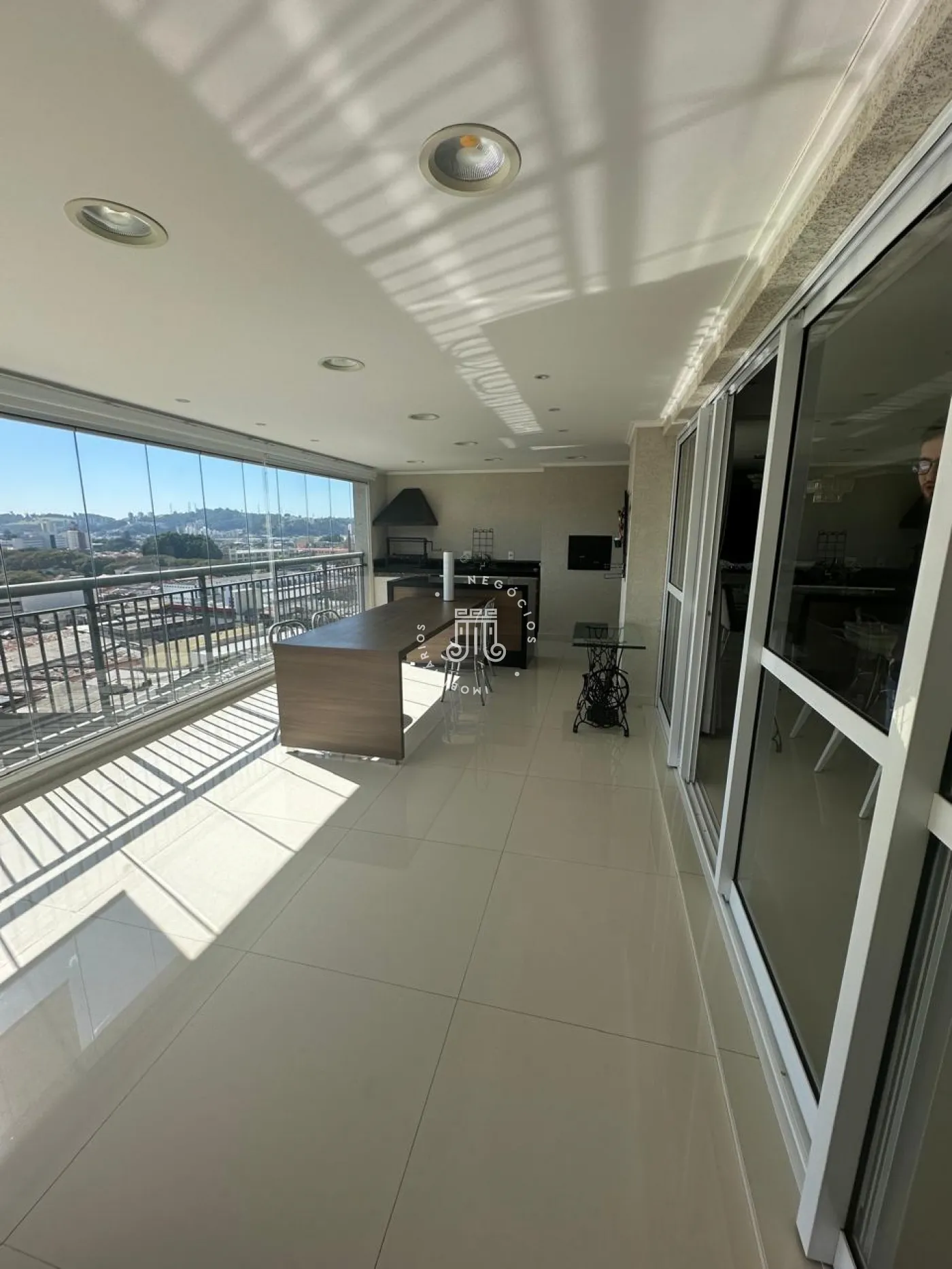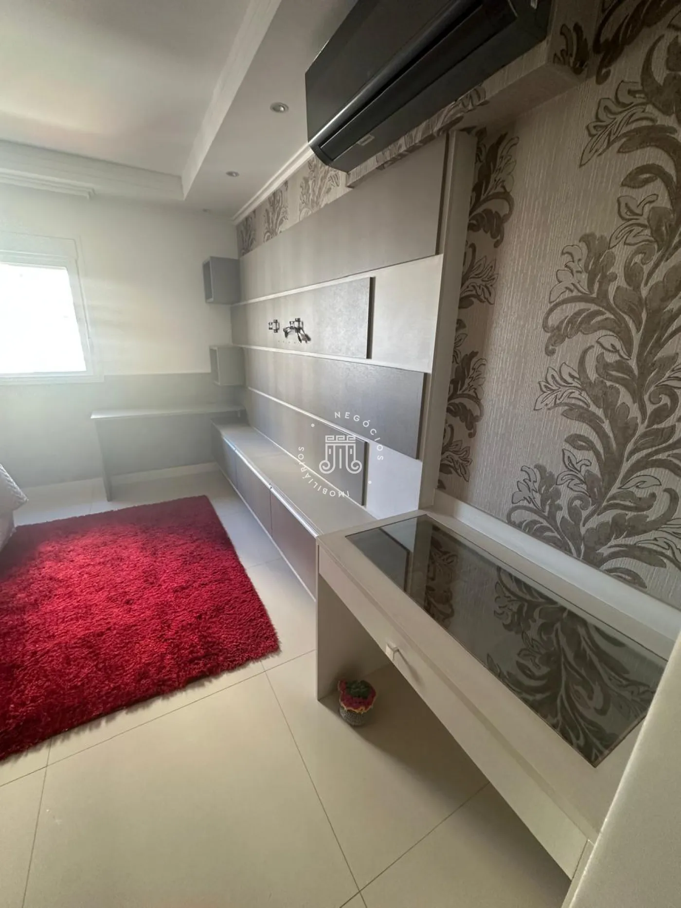 Composto por quatro suítes, sendo uma suíte máster. Todas as suítes contam com ar-condicionado e armários planejados. Sala para dois ambientes integrada à varanda gourmet envidraçada, com persianas. Andar alto, com vista livre para o nascer do sol. Cozinha com armários planejados e equipada com eletrodomésticos. Área de serviço com armários e banheiro. Três vagas de garagem.