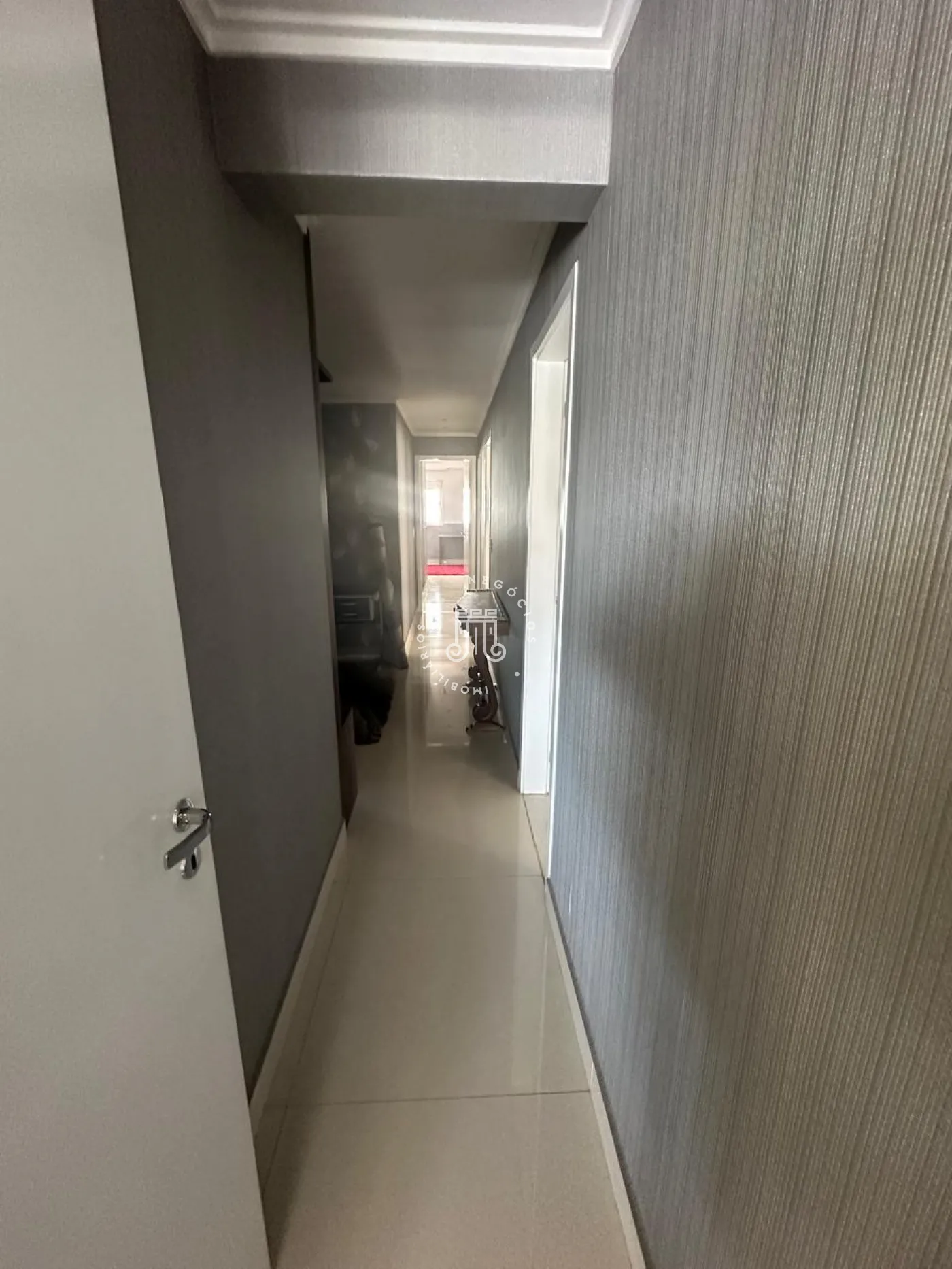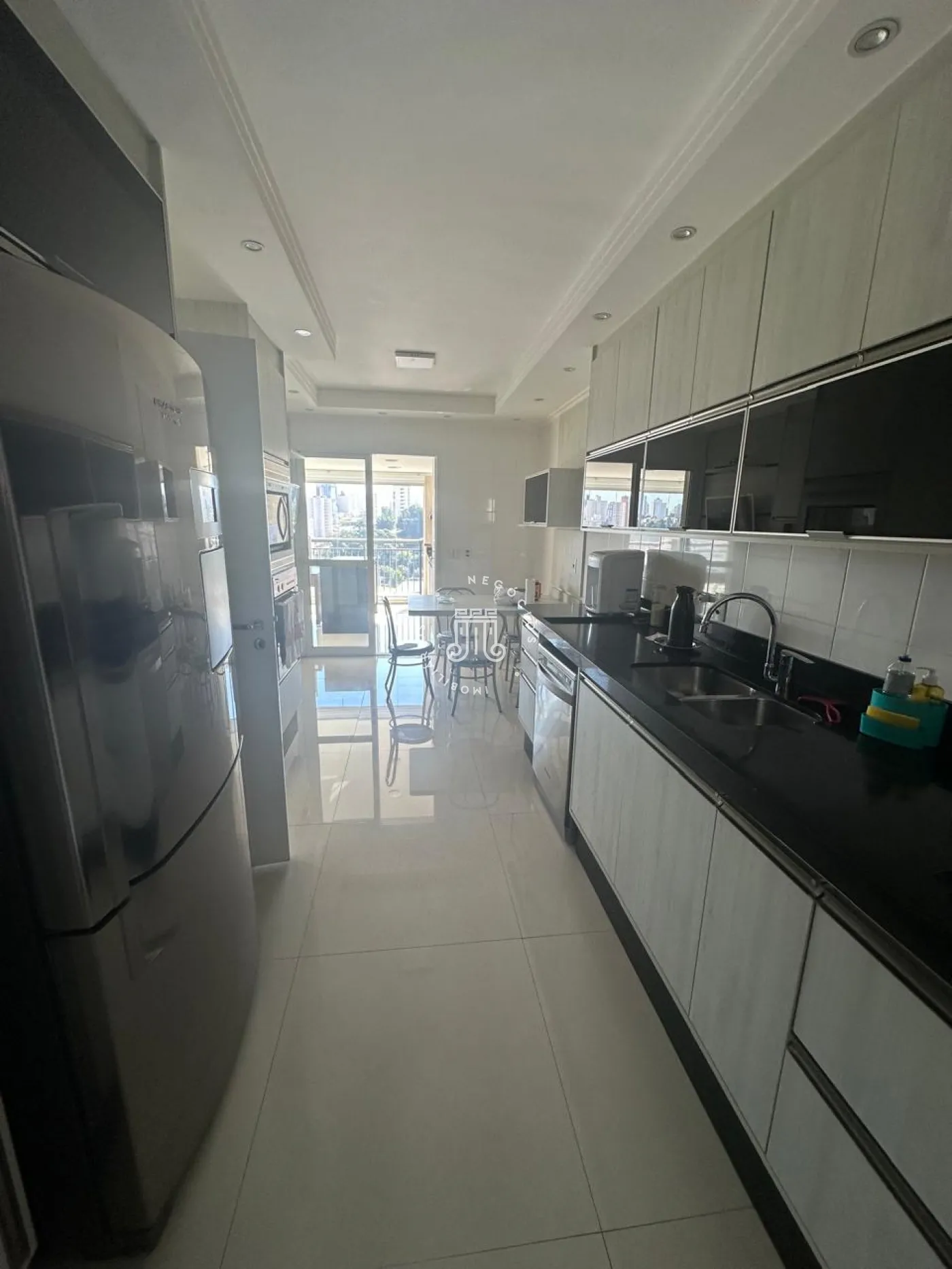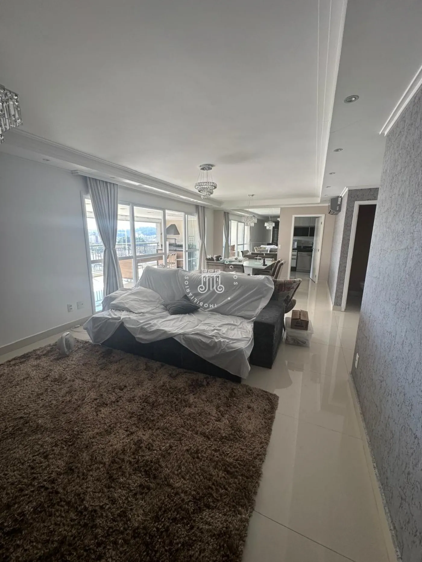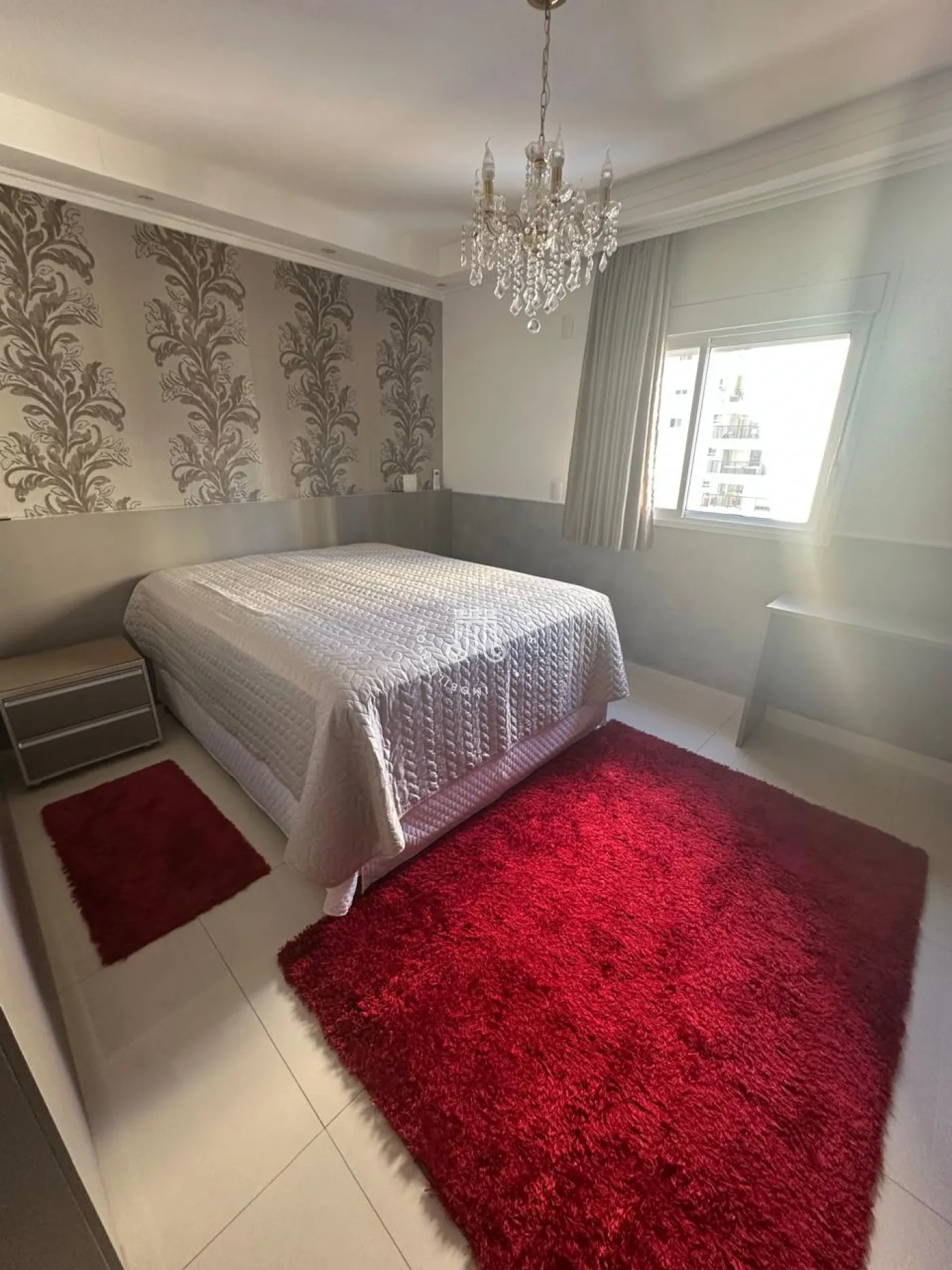 Composto por quatro suítes, sendo uma suíte máster. Todas as suítes contam com ar-condicionado e armários planejados. Sala para dois ambientes integrada à varanda gourmet envidraçada, com persianas. Andar alto, com vista livre para o nascer do sol. Cozinha com armários planejados e equipada com eletrodomésticos. Área de serviço com armários e banheiro. Três vagas de garagem.