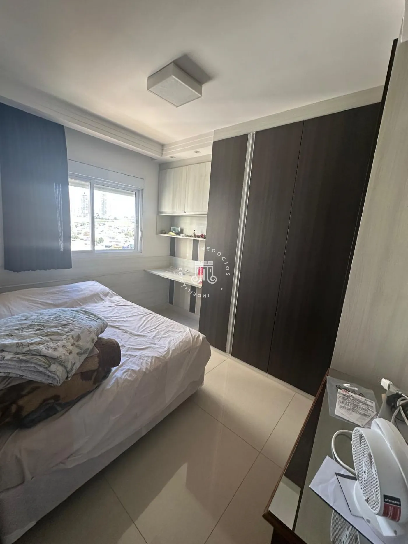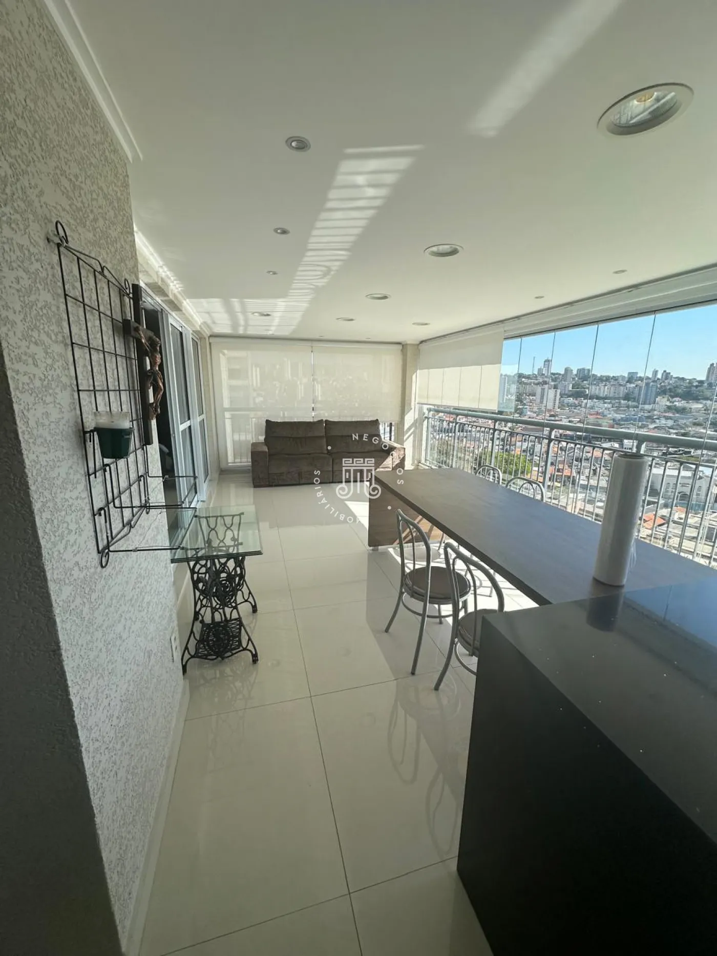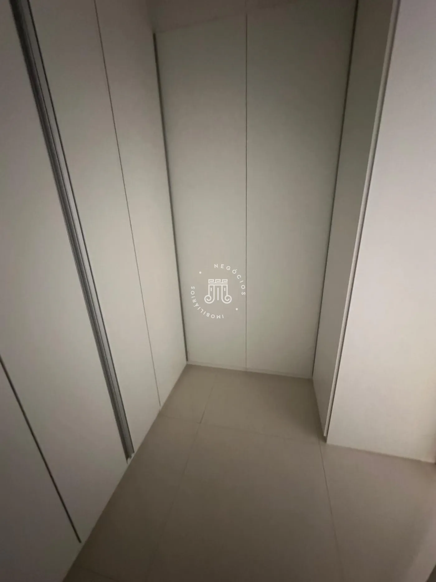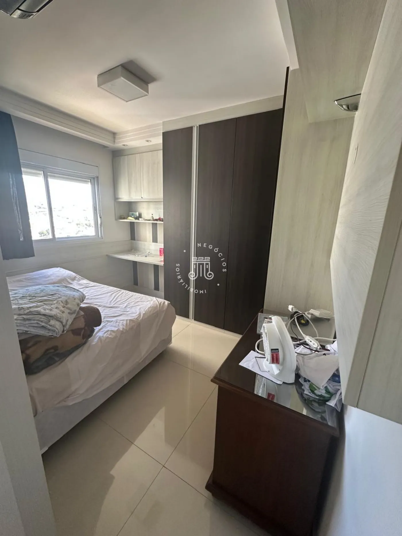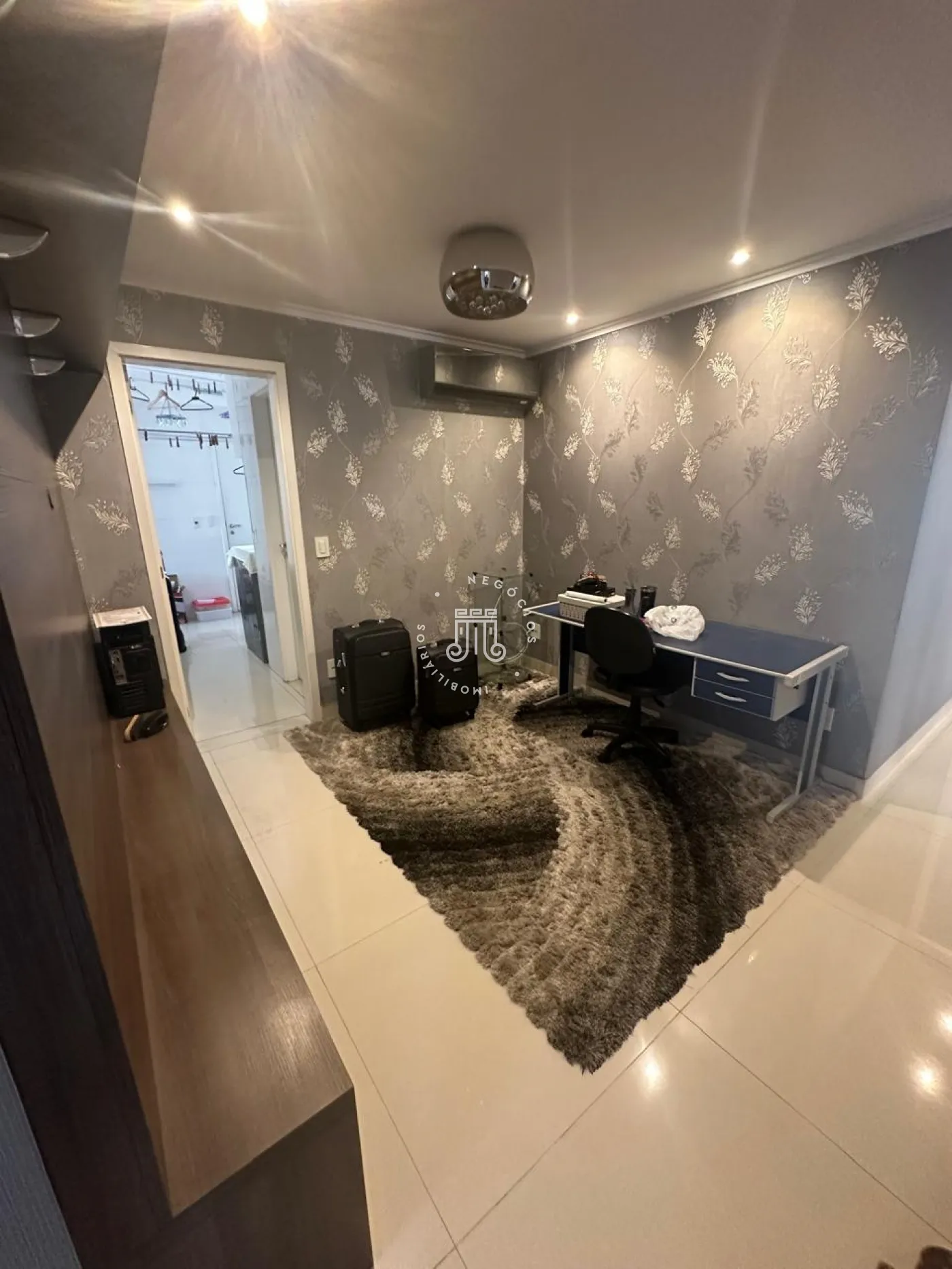 Composto por quatro suítes, sendo uma suíte máster. Todas as suítes contam com ar-condicionado e armários planejados. Sala para dois ambientes integrada à varanda gourmet envidraçada, com persianas. Andar alto, com vista livre para o nascer do sol. Cozinha com armários planejados e equipada com eletrodomésticos. Área de serviço com armários e banheiro. Três vagas de garagem.
