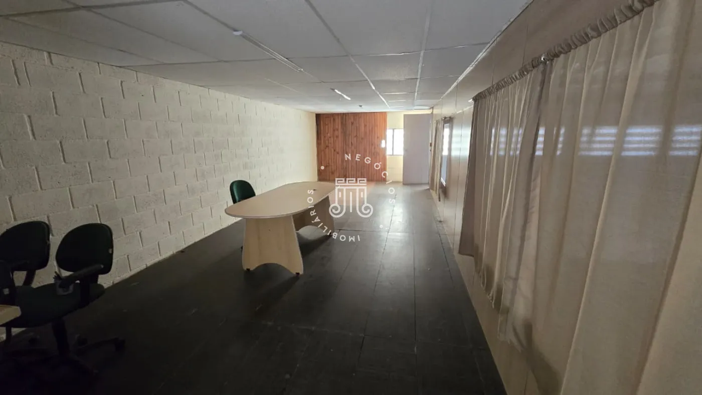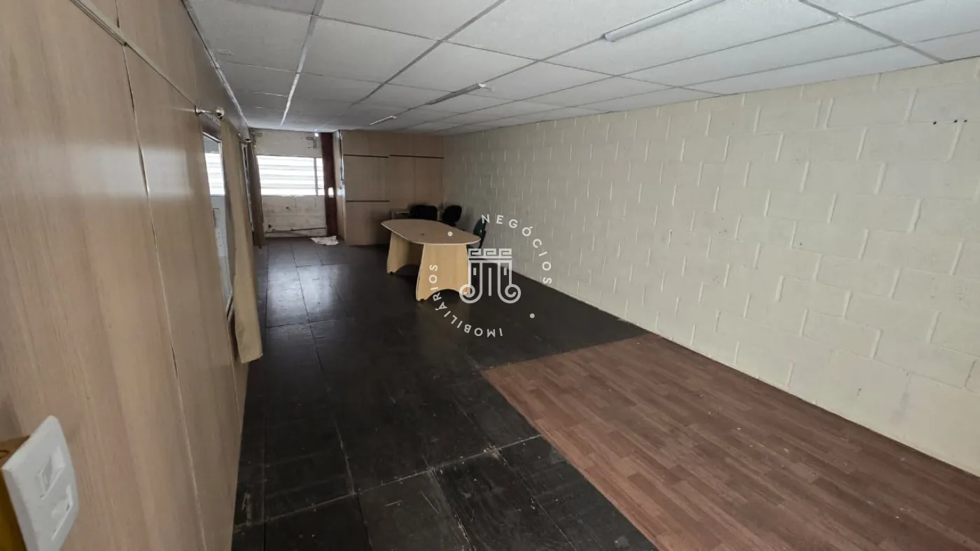 escritório, mezanino, 2 banheiros, anexo lateral e várias vagas para estacionamento.