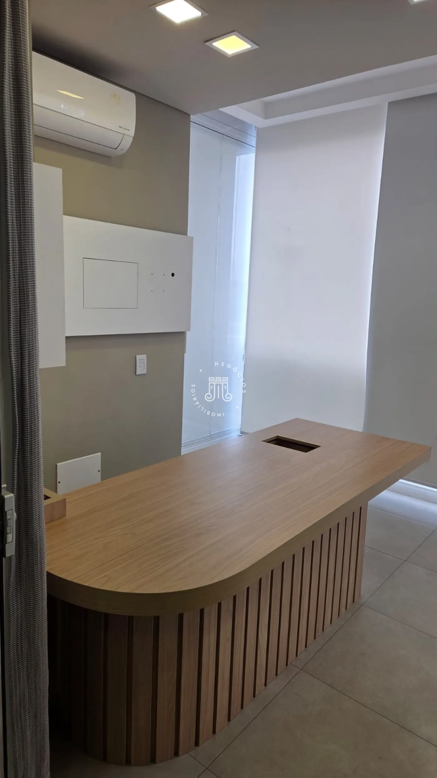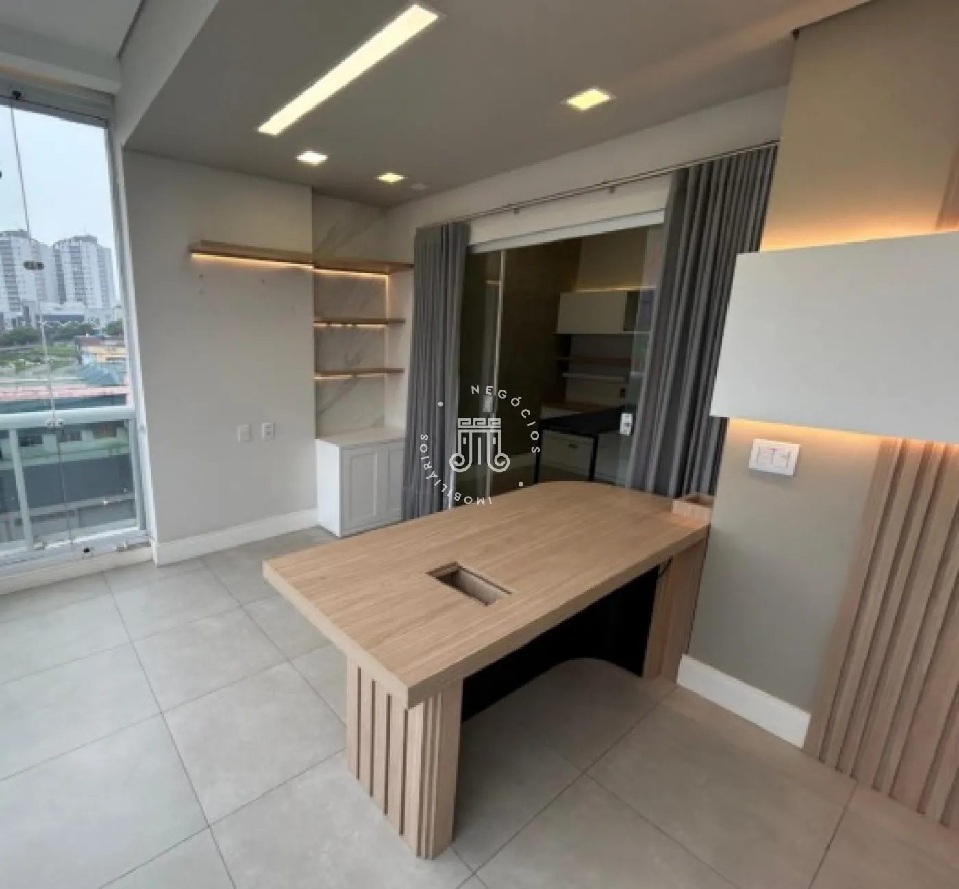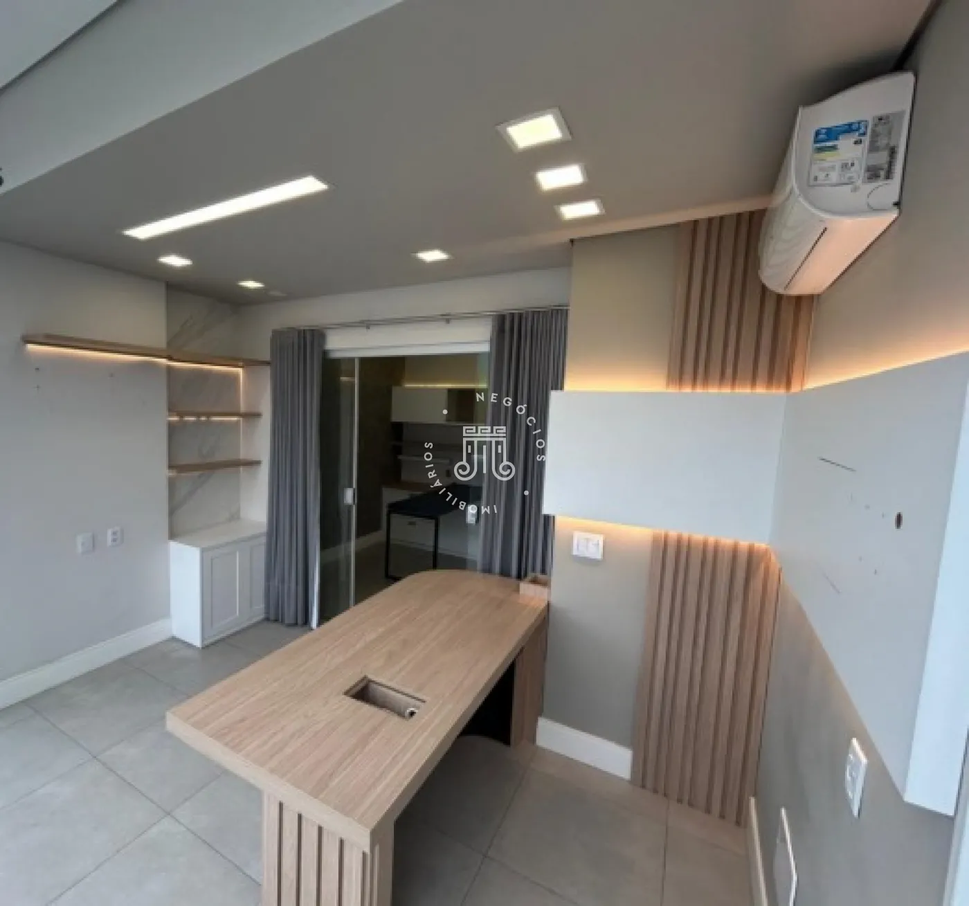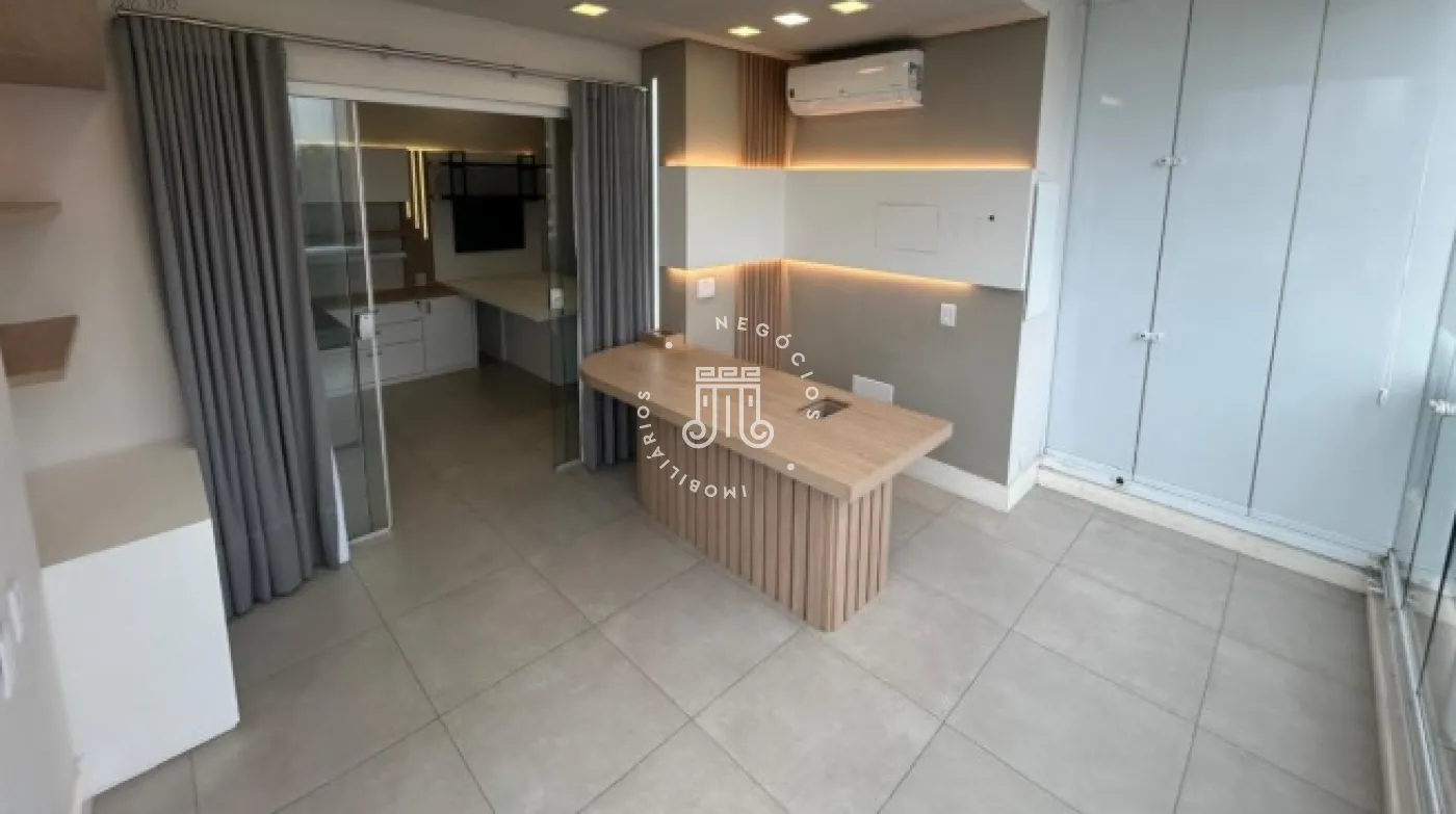 Sala comercial com móveis planejados em todo o ambiente, mesas e ar-condicionado, além de banheiro, copa embutida e sacada envidraçada também com planejados, mesa e ar-condicionado. Espaço sofisticado, com piso em porcelanato e projeto de iluminação. Imóvel preparado e pronto para o seu negócio.