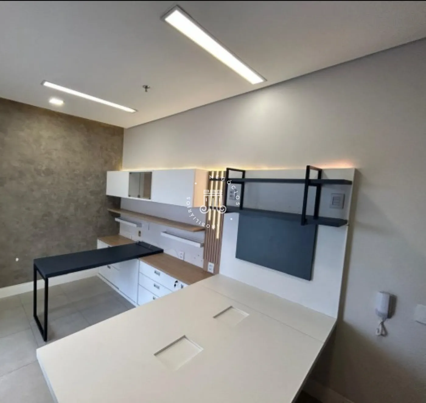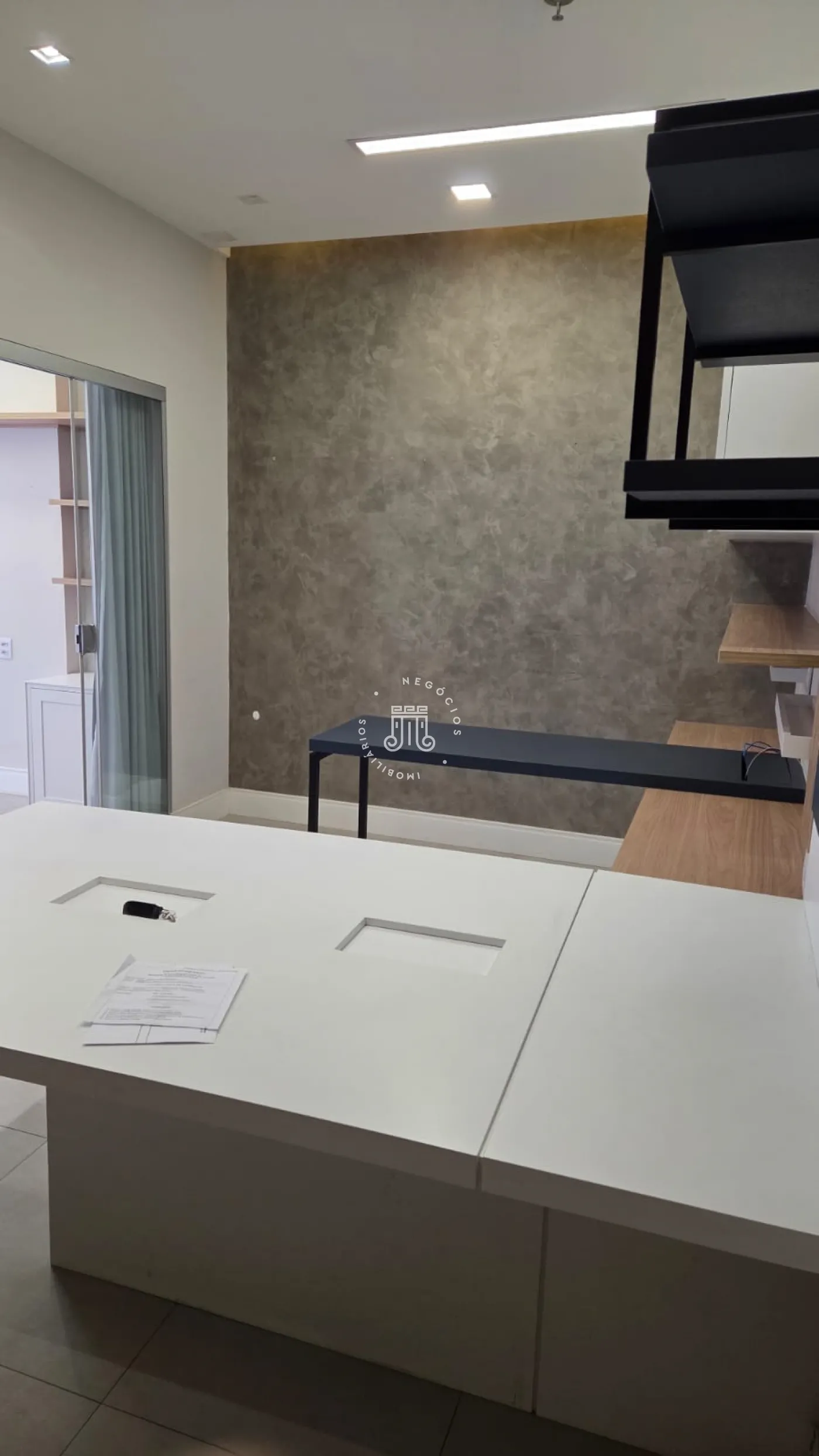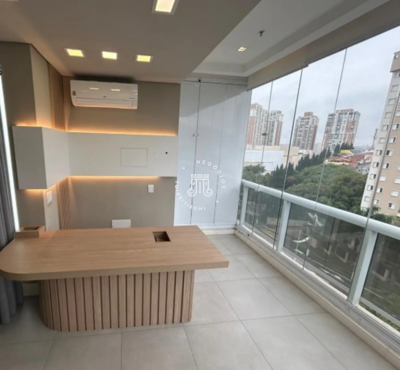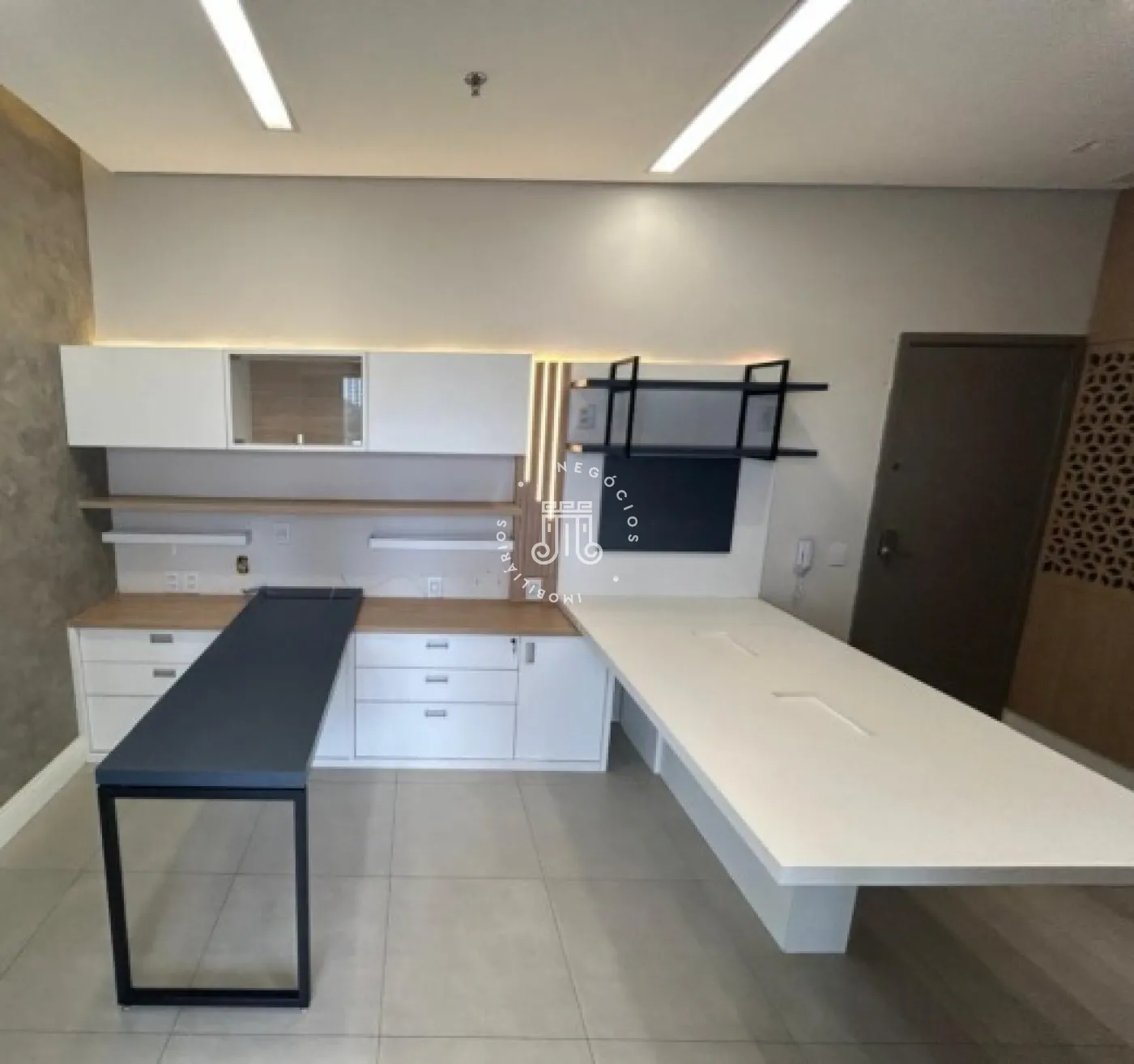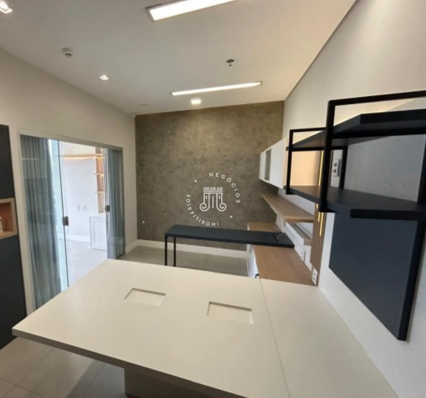 Sala comercial com móveis planejados em todo o ambiente, mesas e ar-condicionado, além de banheiro, copa embutida e sacada envidraçada também com planejados, mesa e ar-condicionado. Espaço sofisticado, com piso em porcelanato e projeto de iluminação. Imóvel preparado e pronto para o seu negócio.