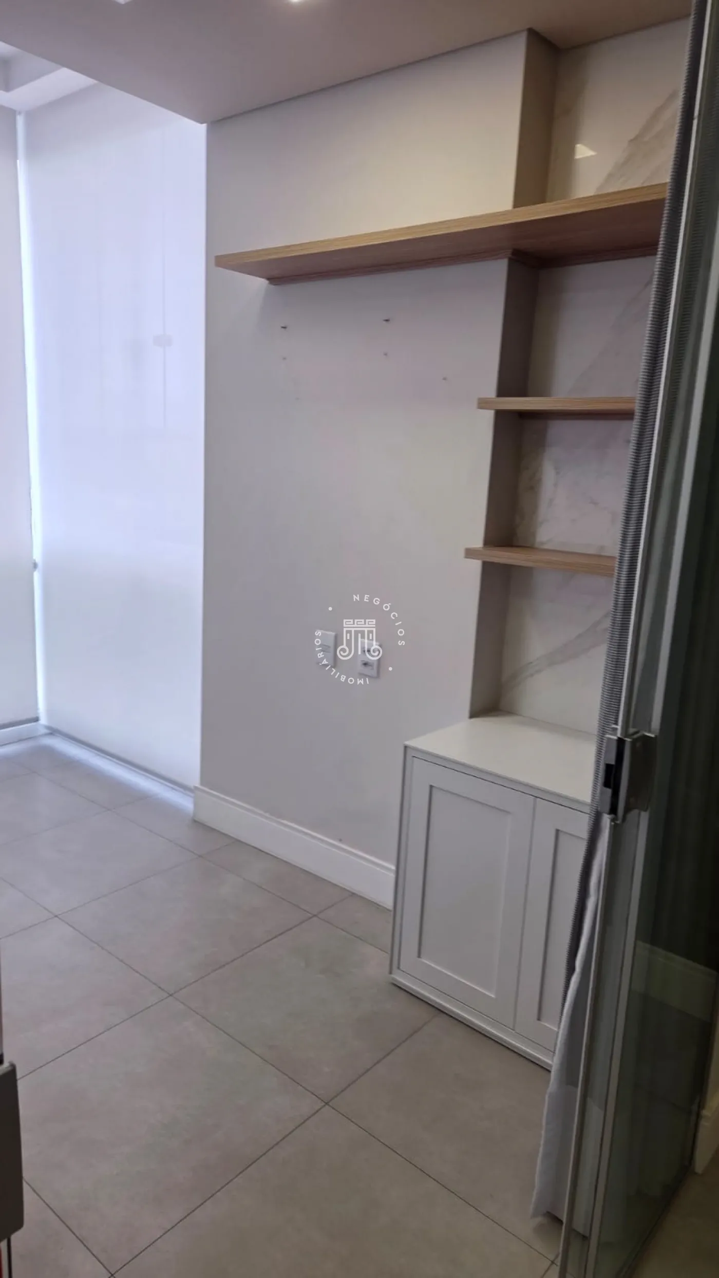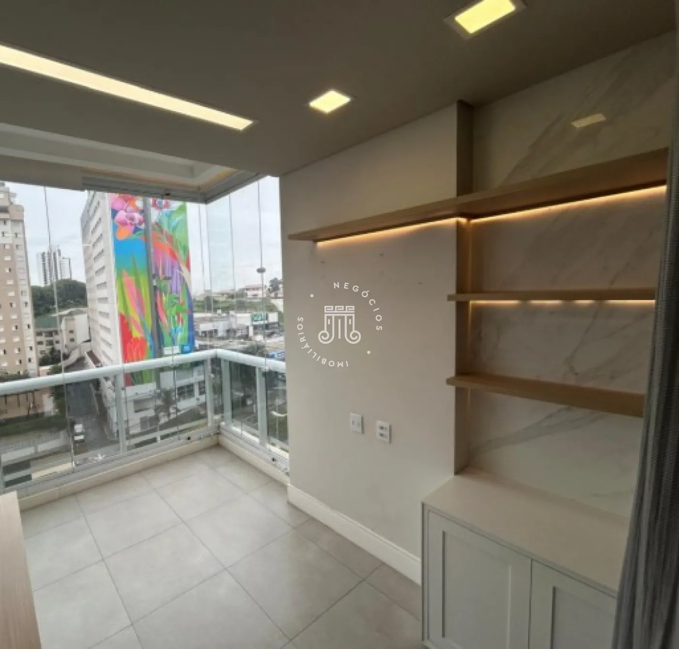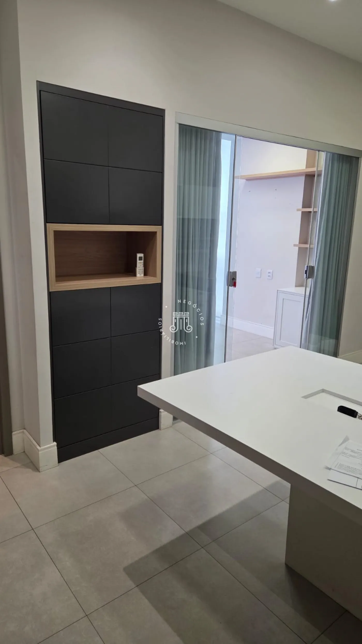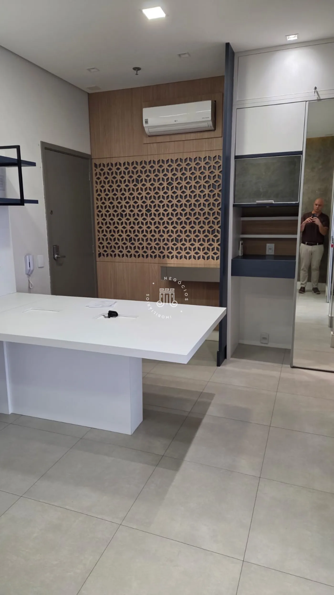 Sala comercial com móveis planejados em todo o ambiente, mesas e ar-condicionado, além de banheiro, copa embutida e sacada envidraçada também com planejados, mesa e ar-condicionado. Espaço sofisticado, com piso em porcelanato e projeto de iluminação. Imóvel preparado e pronto para o seu negócio.