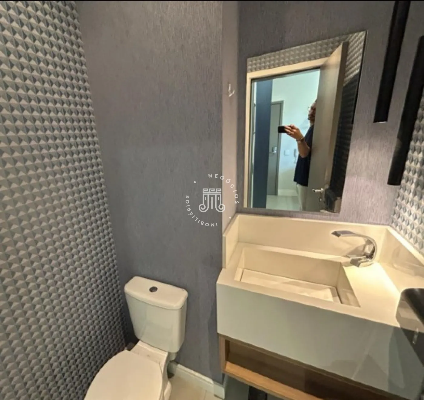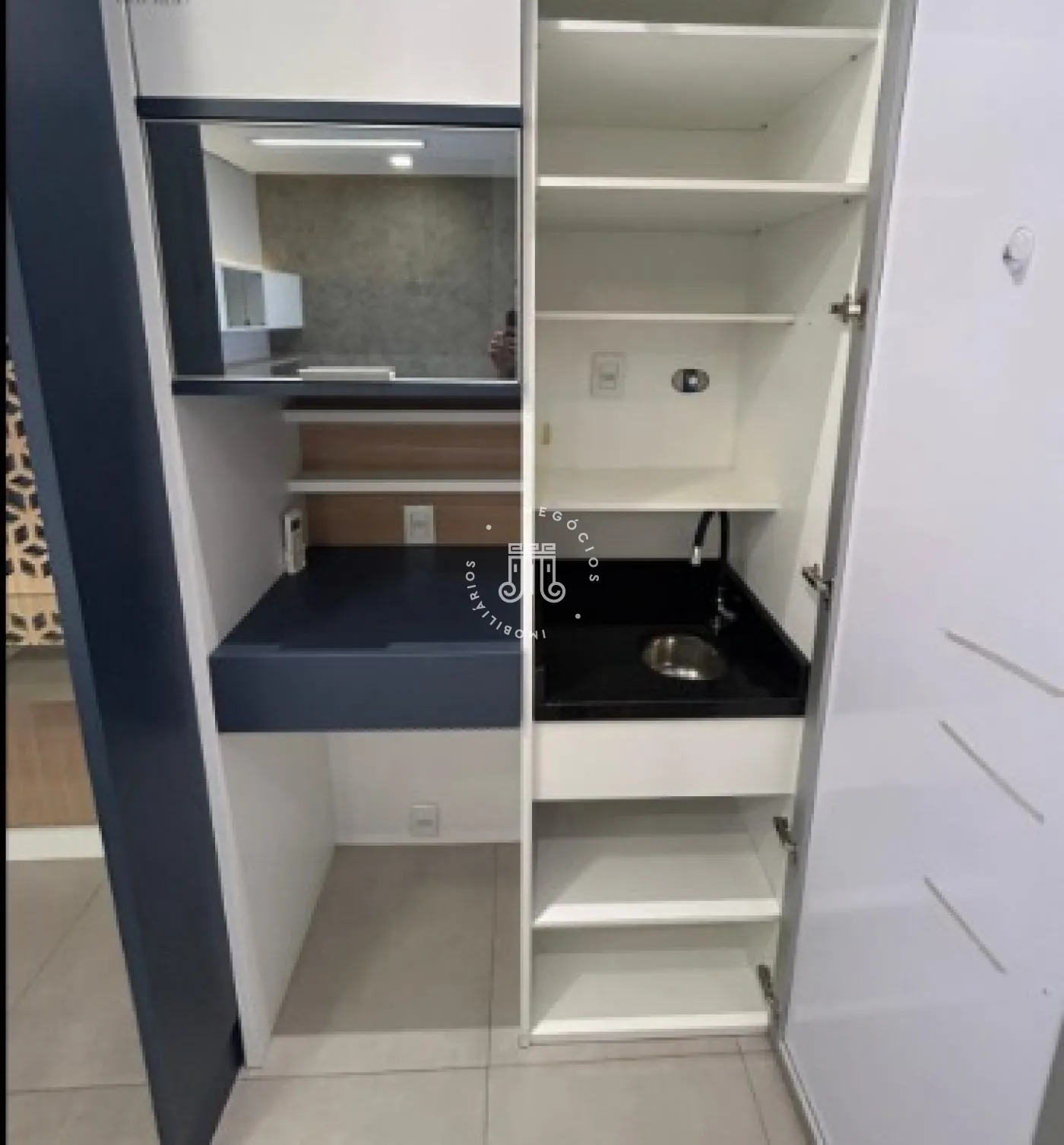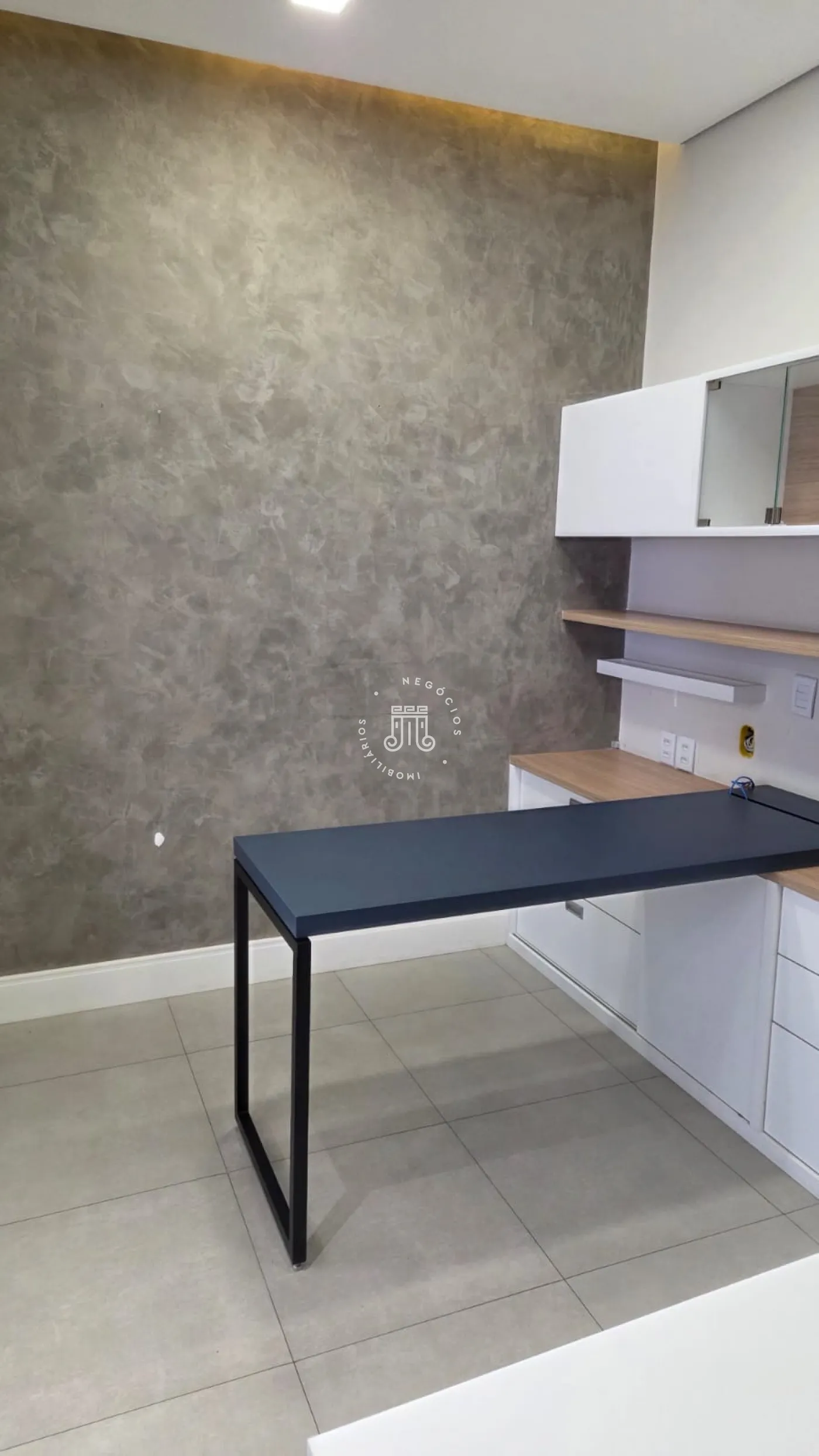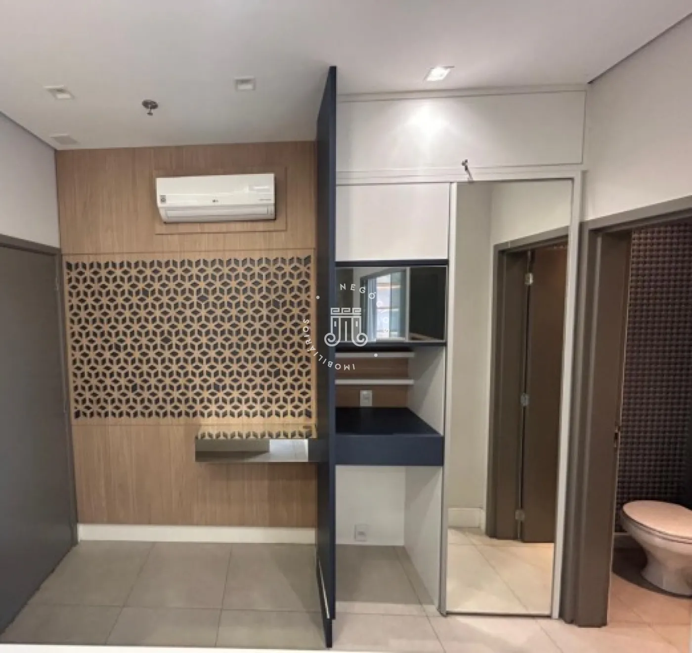 Sala comercial com móveis planejados em todo o ambiente, mesas e ar-condicionado, além de banheiro, copa embutida e sacada envidraçada também com planejados, mesa e ar-condicionado. Espaço sofisticado, com piso em porcelanato e projeto de iluminação. Imóvel preparado e pronto para o seu negócio.