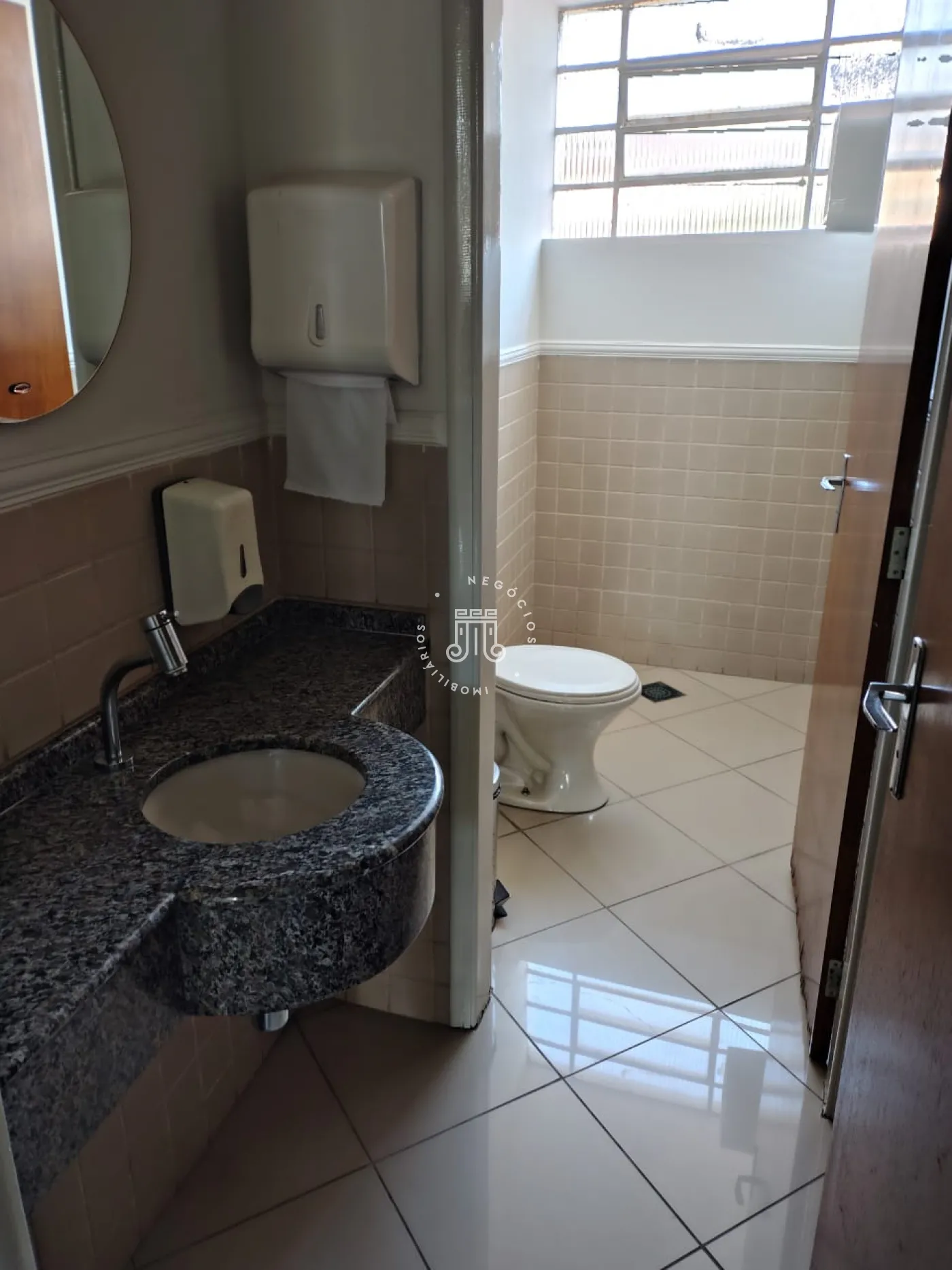 Sala comercial ampla, bem iluminada e arejada, com um banheiro banheiros. Na área comum do prédio conta ainda com dois banheiros e algumas cadeiras que tornam o ambiente uma sala de espera.