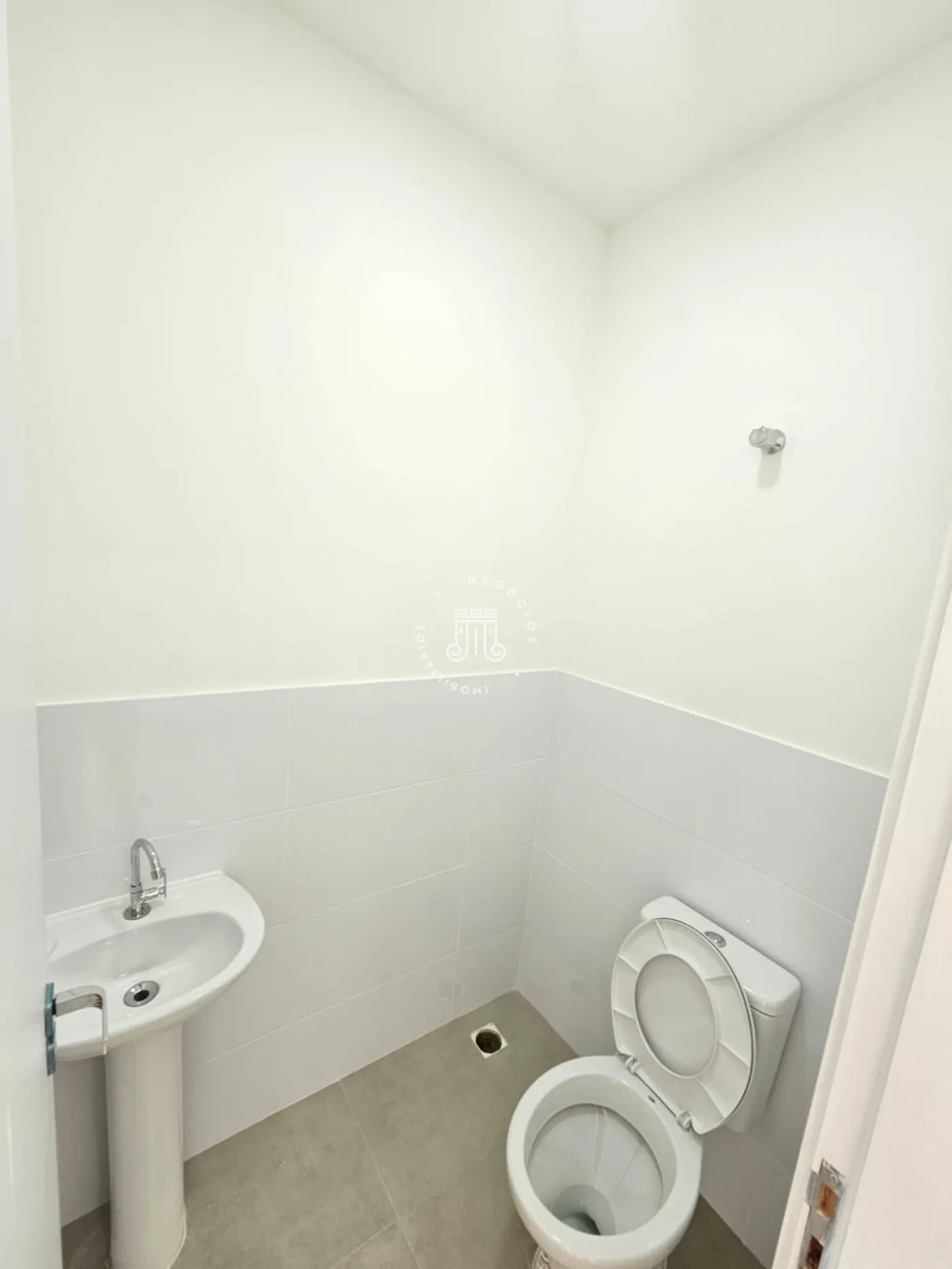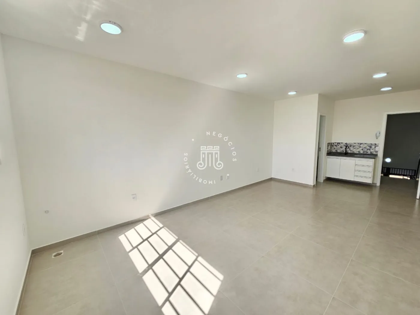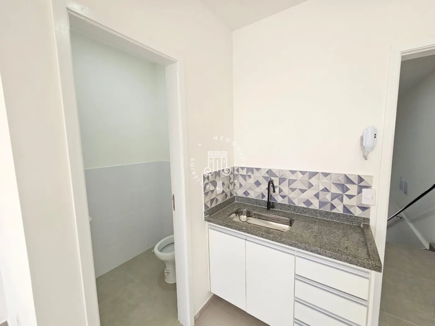 Sala com otima iluminação, um banheiro e espaço para copa.
