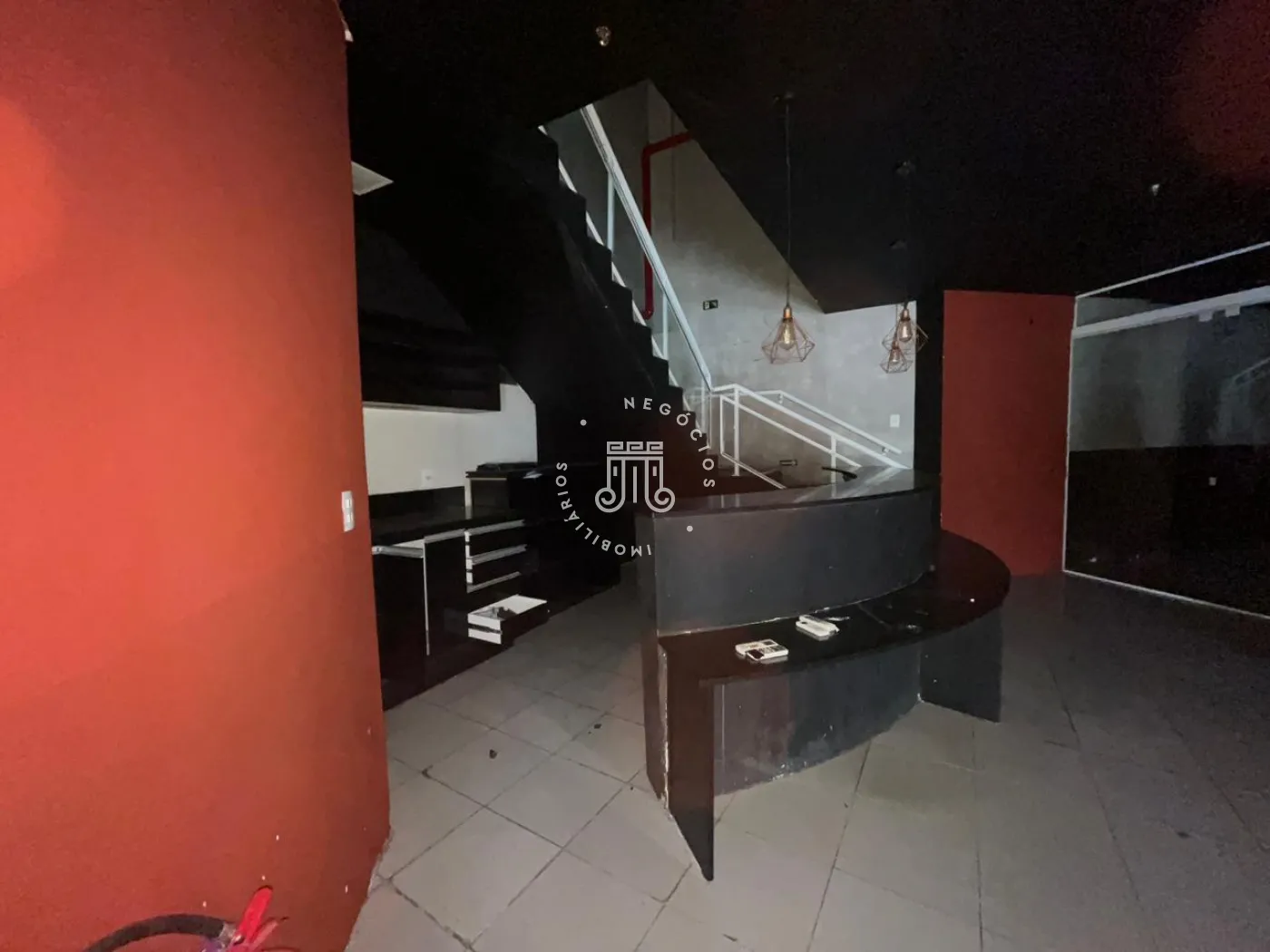 No pavimento inferior, o espaço conta com recepção, 2 banheiros, balcão e sala fechada com porta de vidro. No pavimento superior, com acesso por escada, há área ampla com balcão e vista para a Avenida Nove de Julho.