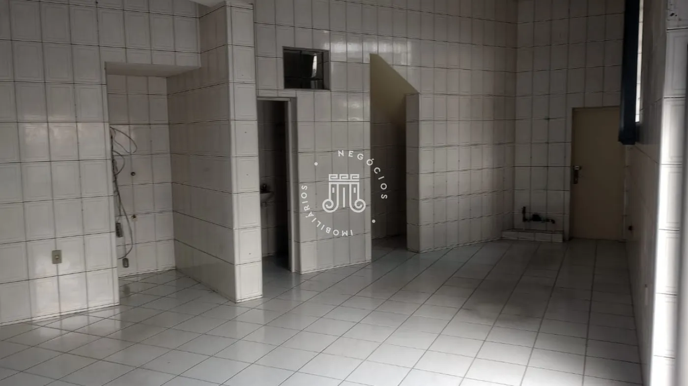 Sala com 50m², contendo 1 banheiro e 1 copa. Porta de aço e porta de vidro e azulejo ate o teto.