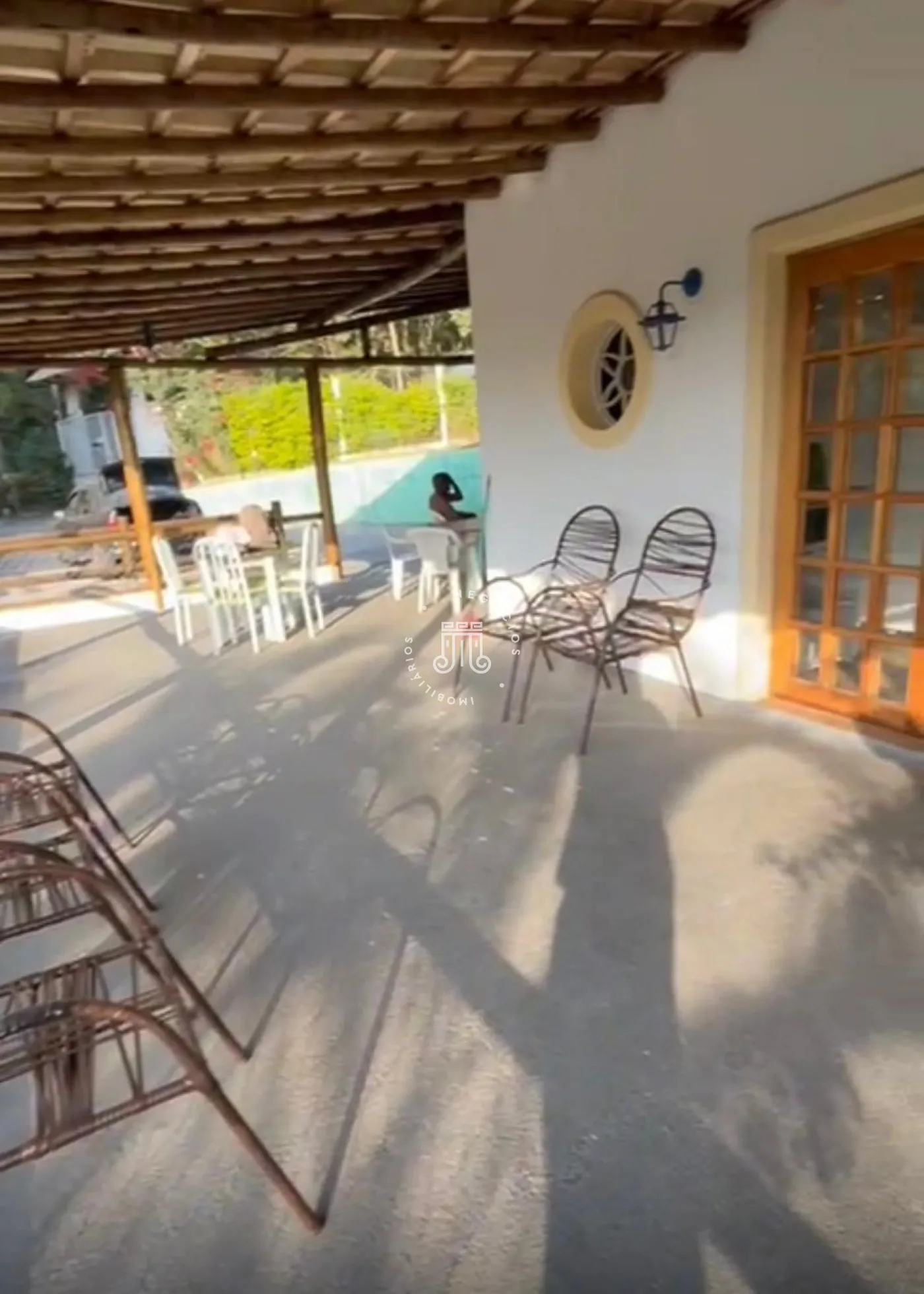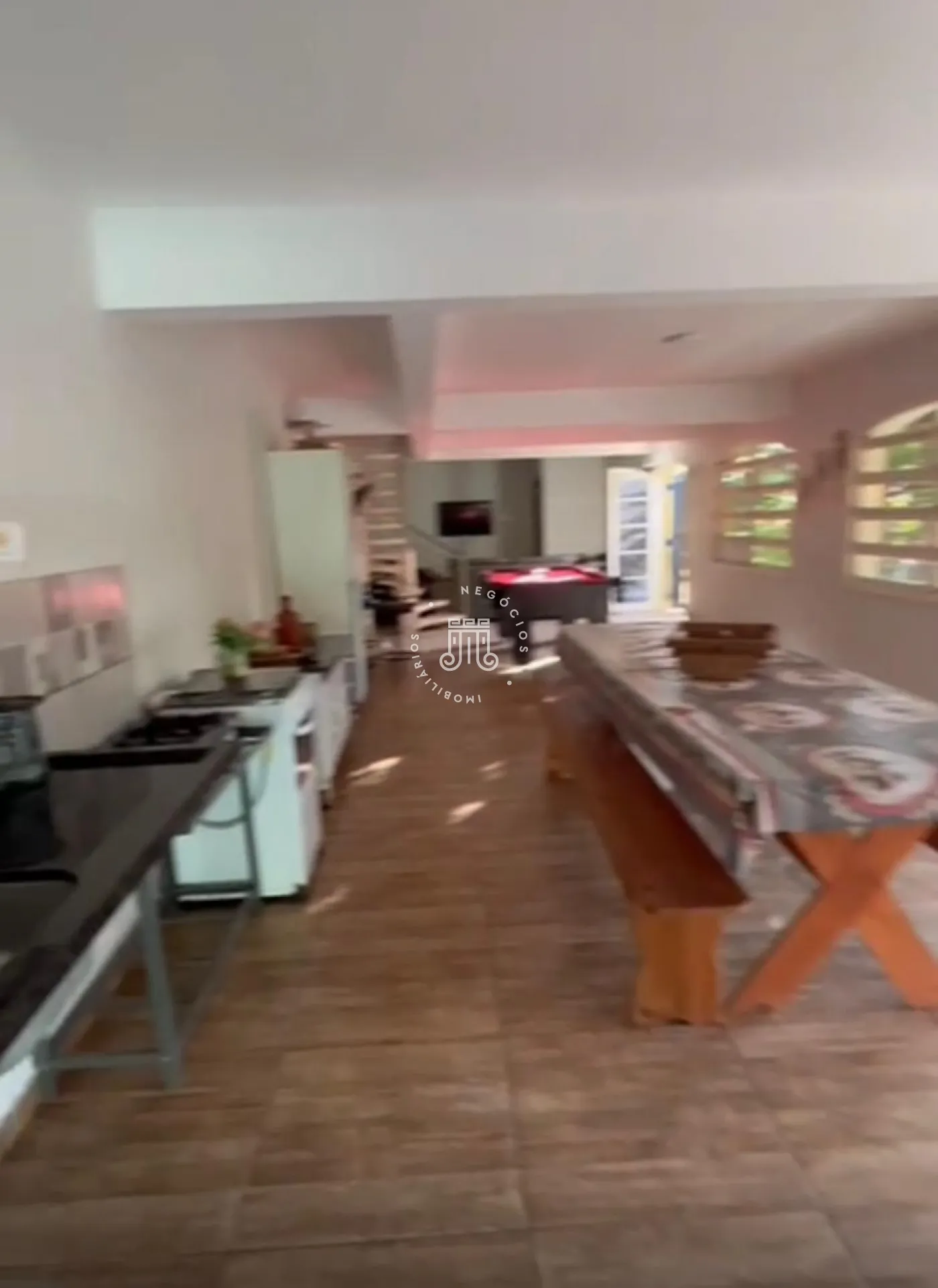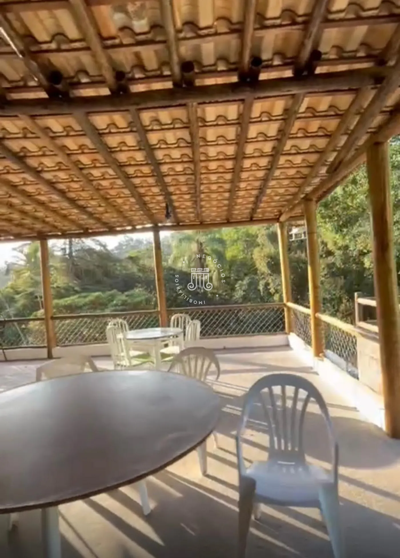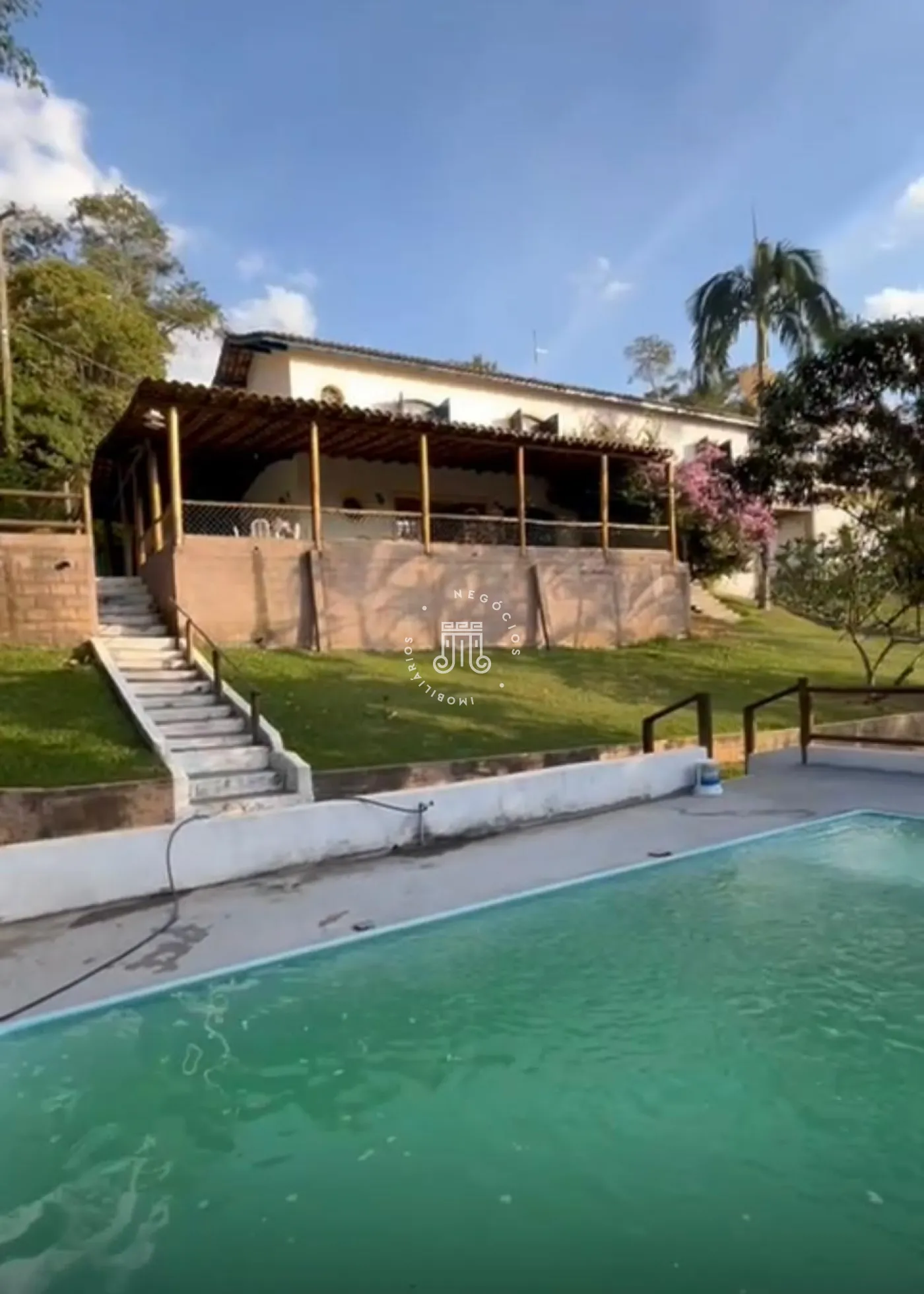 Um terreno de 2.500m² com construção de 250m² conta com 3 suítes, ampla sala de estar, sala de jantar, cozinha, banheiro social, lavabo, área de serviço, piscina 6x3, varanda em L de 70m, quarto de ferramentas de 40m, poço artesiano, nascente, mata nativa, bananal com 50 pés, área verde e espaço para 7 carros estacionarem.