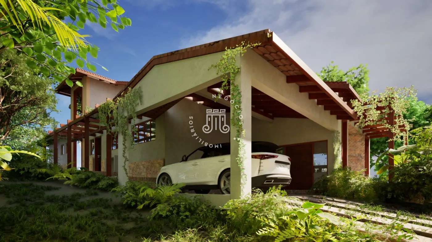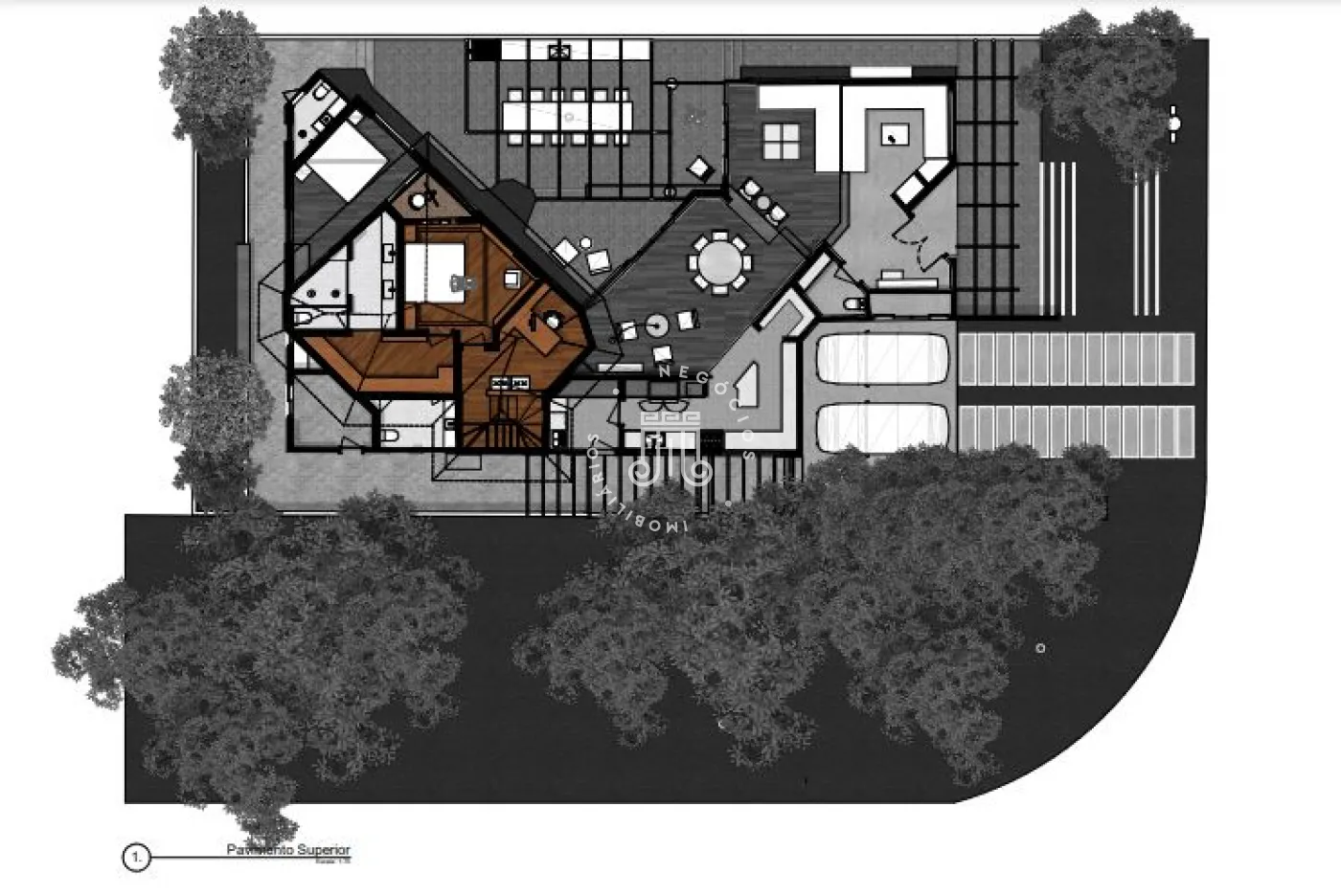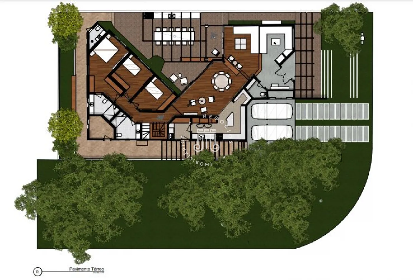 O imóvel está situado em um terreno de 480 m², com 300 m² de área construída, distribuídos em dois pavimentos. No pavimento térreo, a casa conta com garagem para dois carros cobertos e dois descobertos, equipada com armário, além de lavabo, sala de lareira, sala de estar e sala de jantar. A cozinha possui ilha e está integrada à área gourmet, que conta com banheiro externo para apoio. O pavimento também dispõe de lavanderia, depósito, adega, dois quartos, um banheiro e uma suíte. No pavimento superior, há um escritório e uma suíte com closet e varanda.