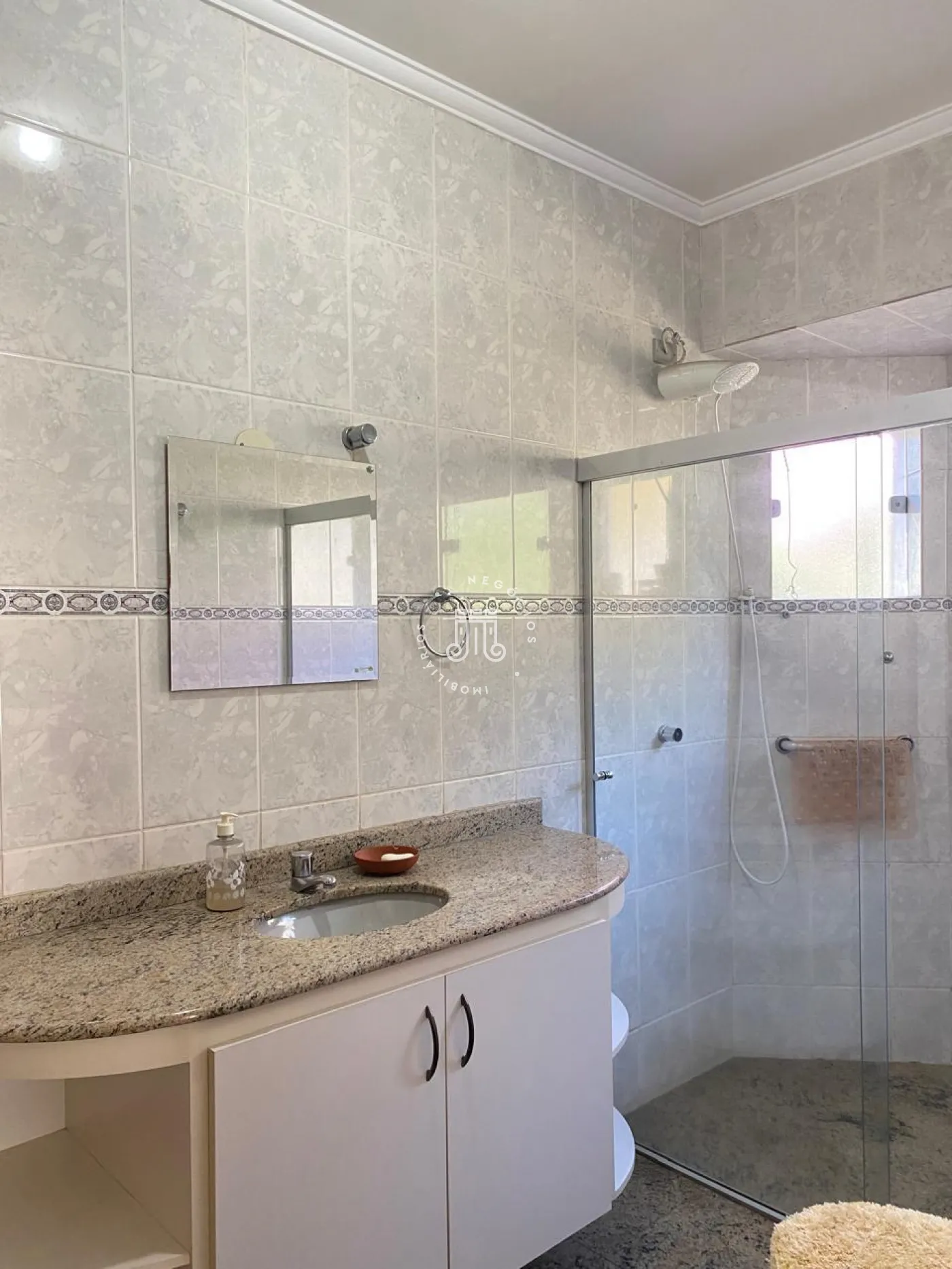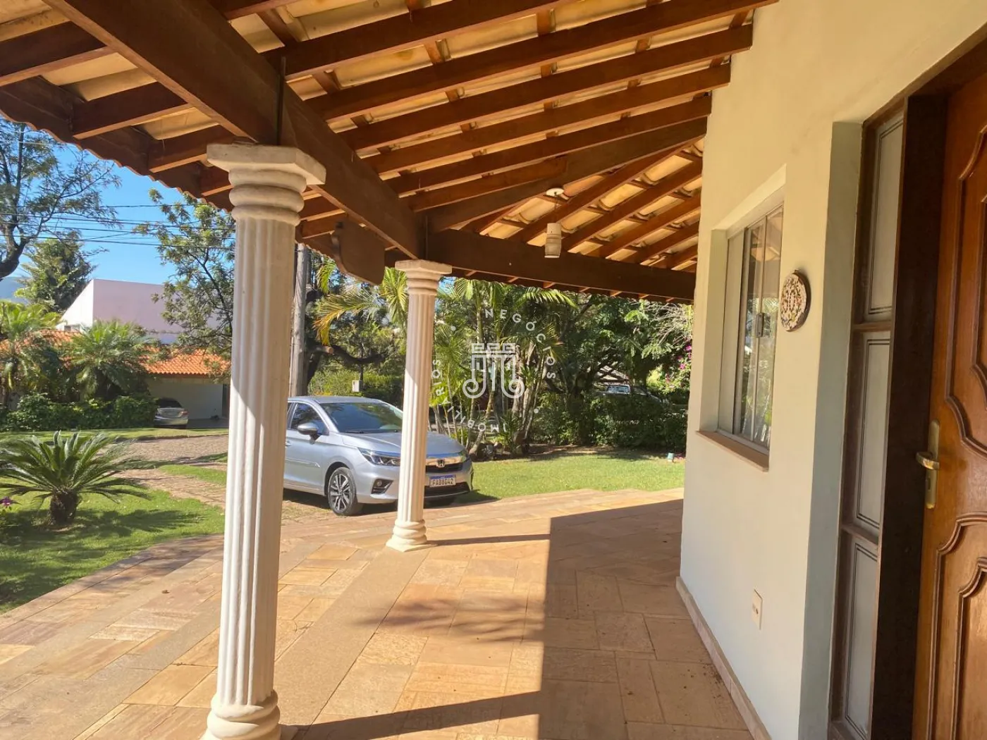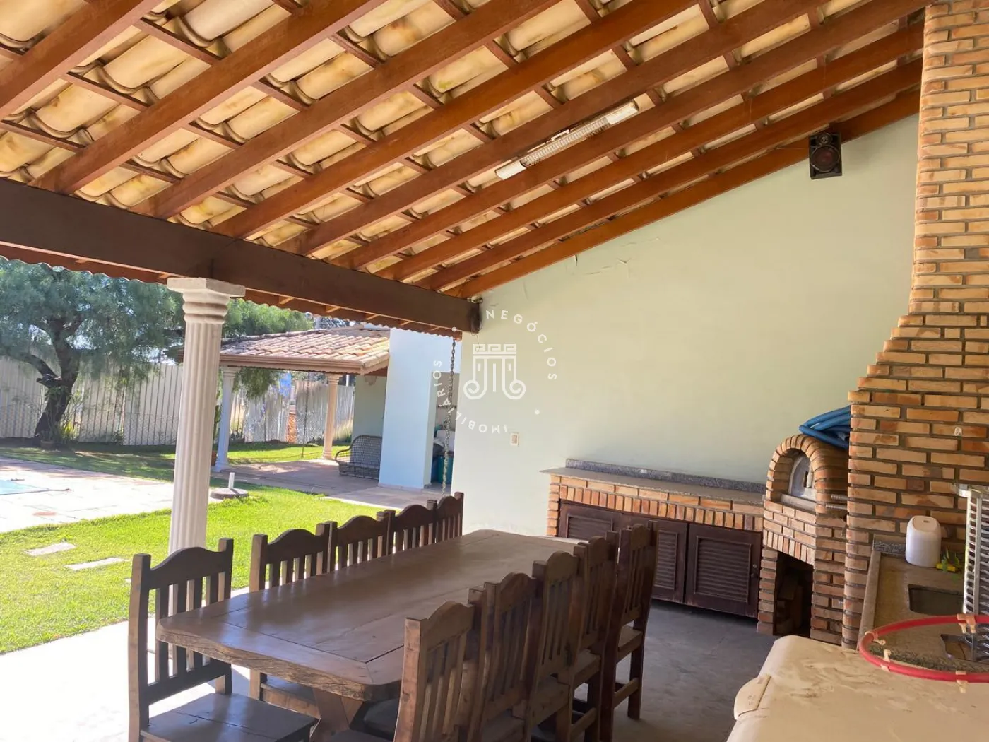 Casa térrea com 4 dormitórios sendo 3 suítes. Duas salas de estar/jantar com lareira. Ampla cozinha com armários. Área de lazer com churrasqueira e forno de pizza a lenha. Tem banheiro na área da churrasqueira. Piscina com aquecimento solar. Metragem da piscina 4m por 8m sendo uma parte mais rasa (prainha para crianças) e outra parte tem 1M e meio mais ou menos. Uns 32 mil litros Está coberta por capa térmica e de proteção. Formação vinil em bom estado de conservação.