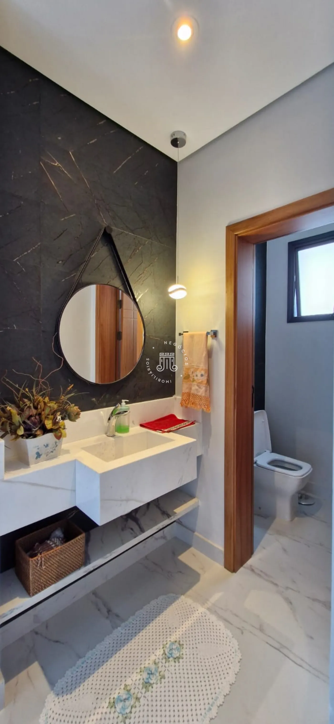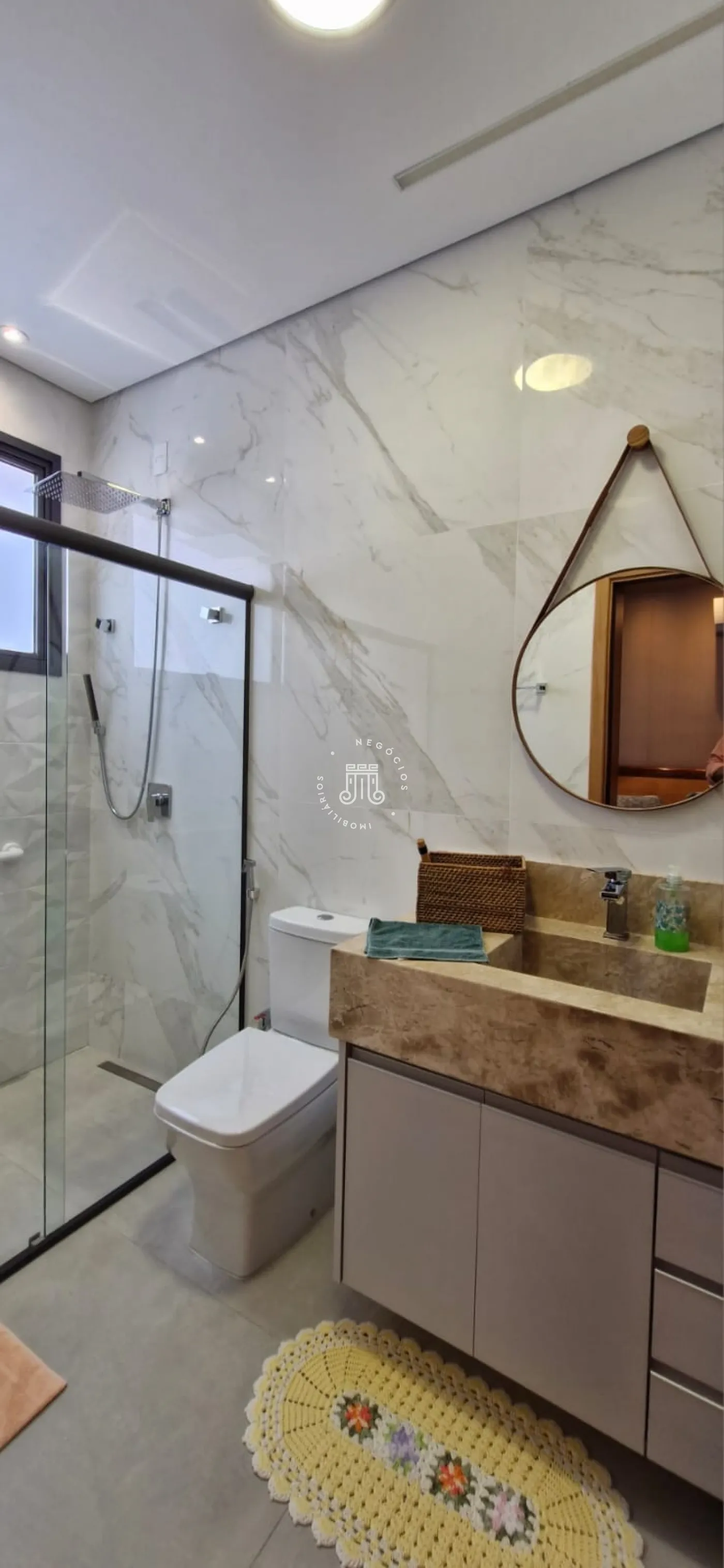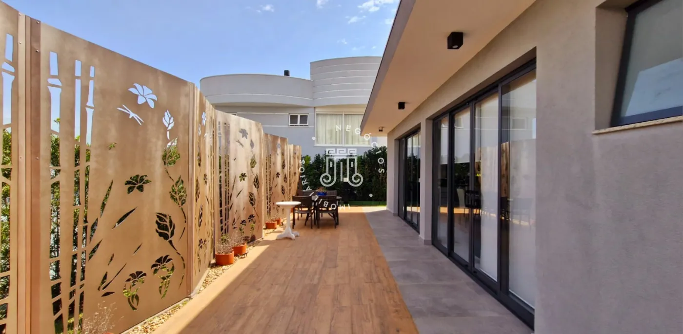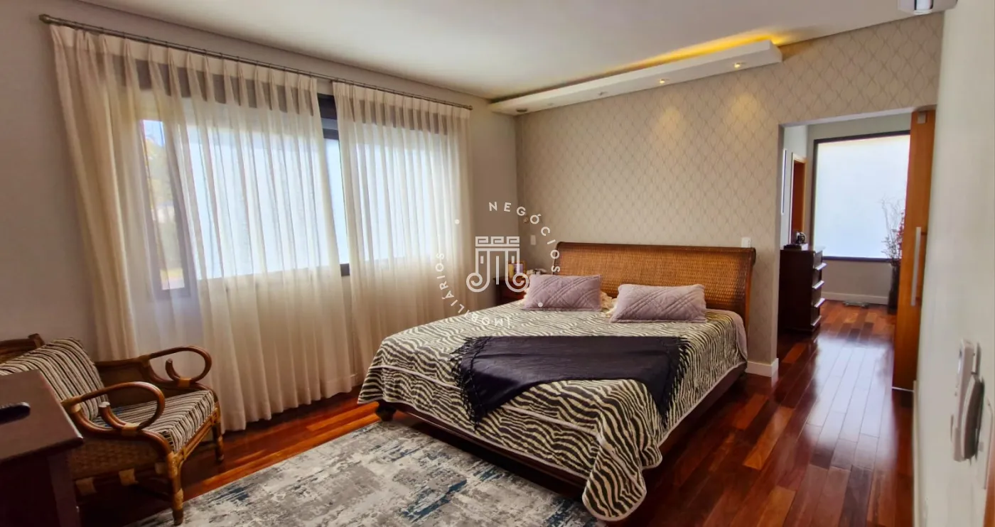 A parte térrea da casa é composta por uma sala grande com pé direito de 6 metros de altura, com múltiplos ambientes, lareira e um lavabo. Duas suítes, sendo uma delas master com closet grande e dois banheiros na mesma suíte. Cozinha com armários planejados e área gourmet integrada, outro lavabo, lavanderia com armários e área de secagem de roupas.