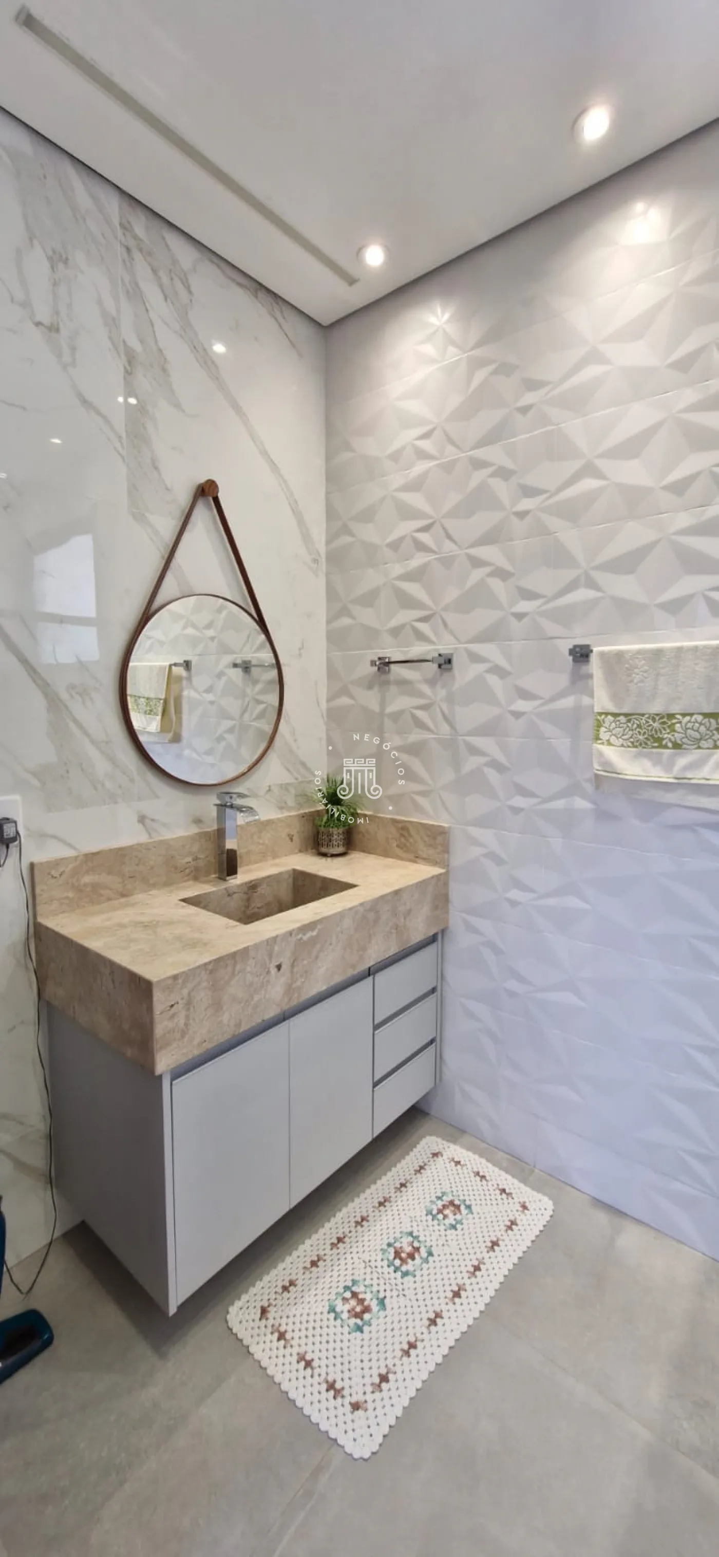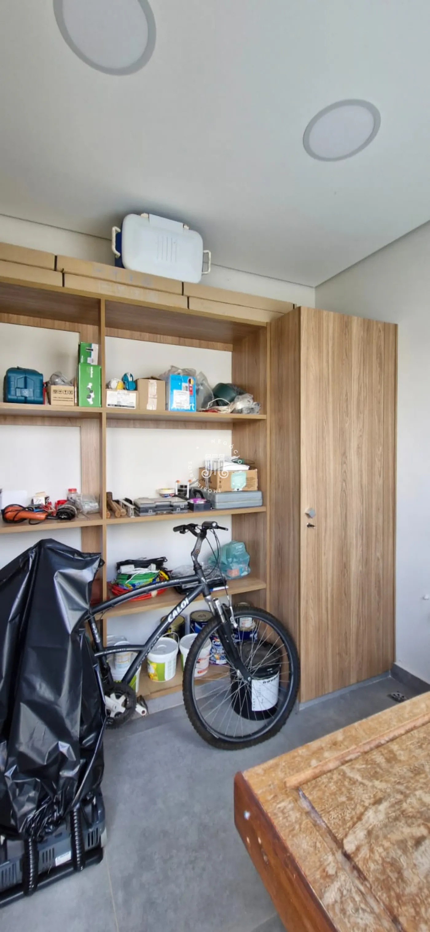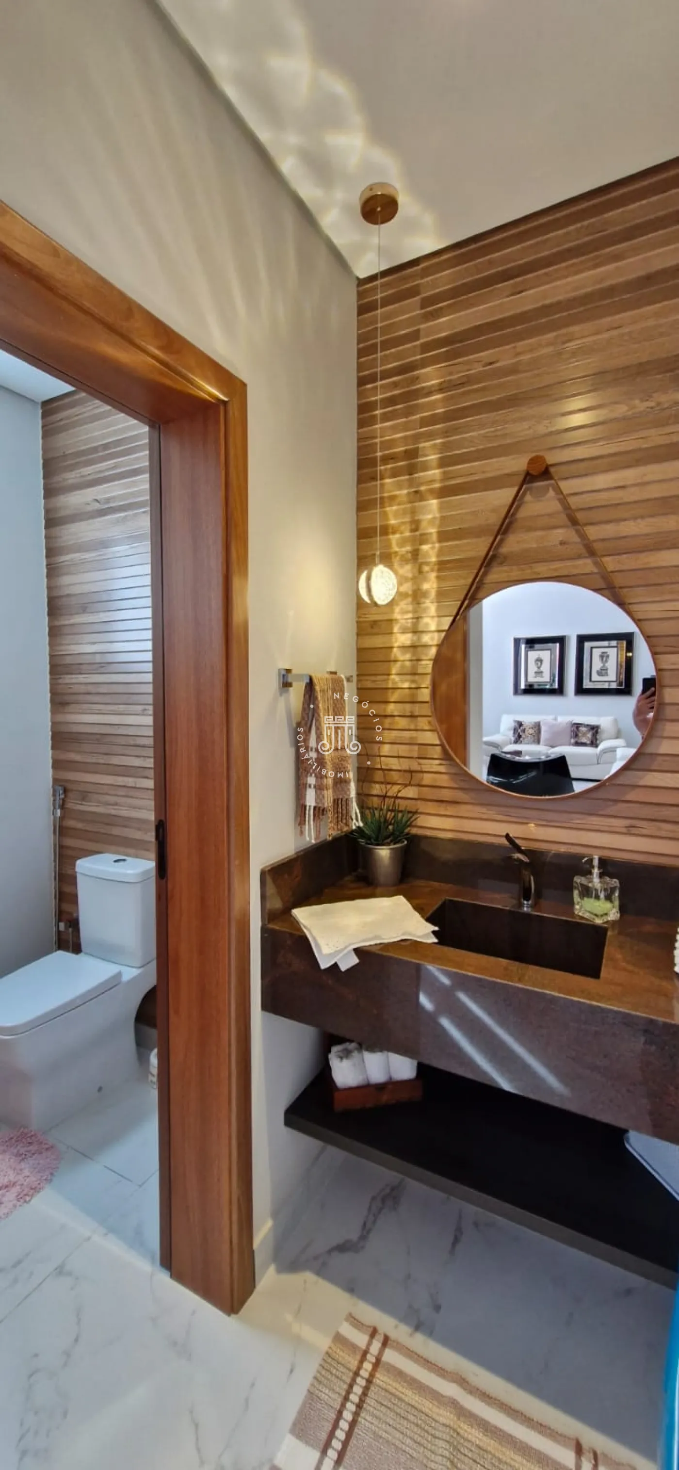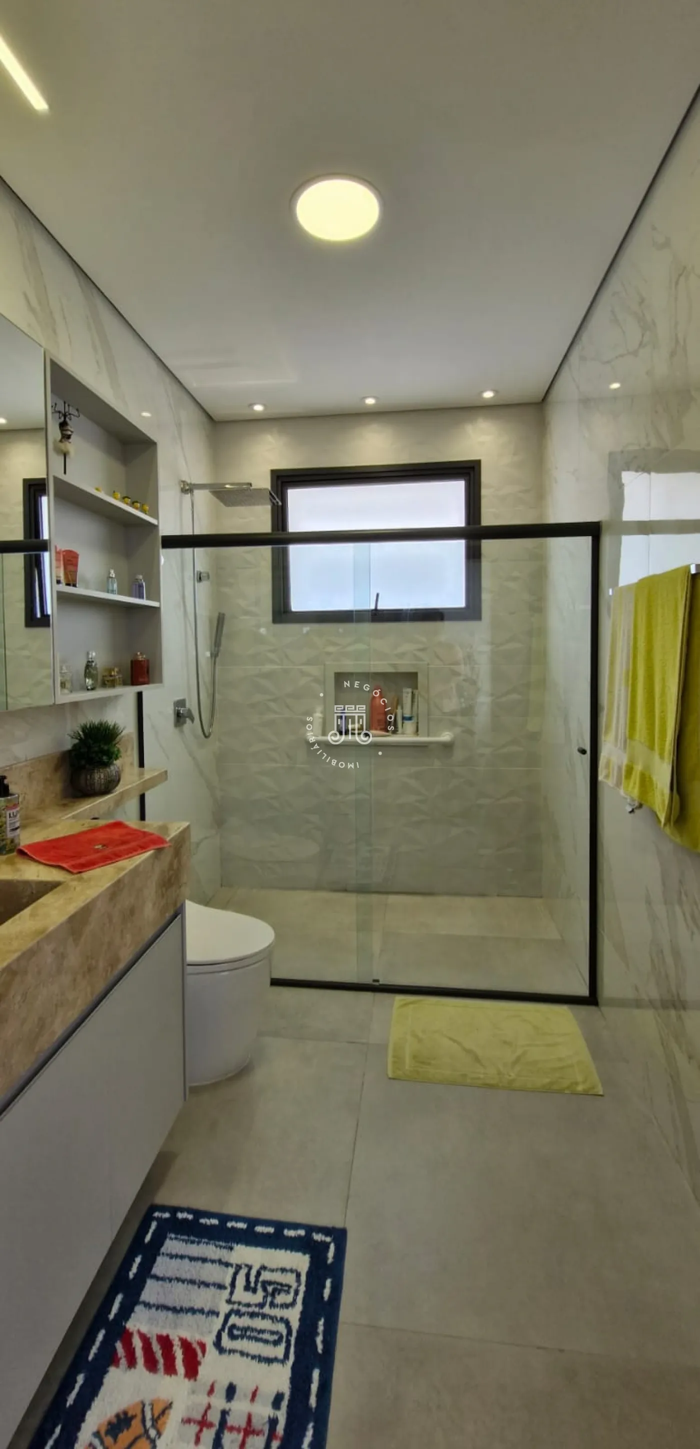 A parte térrea da casa é composta por uma sala grande com pé direito de 6 metros de altura, com múltiplos ambientes, lareira e um lavabo. Duas suítes, sendo uma delas master com closet grande e dois banheiros na mesma suíte. Cozinha com armários planejados e área gourmet integrada, outro lavabo, lavanderia com armários e área de secagem de roupas.