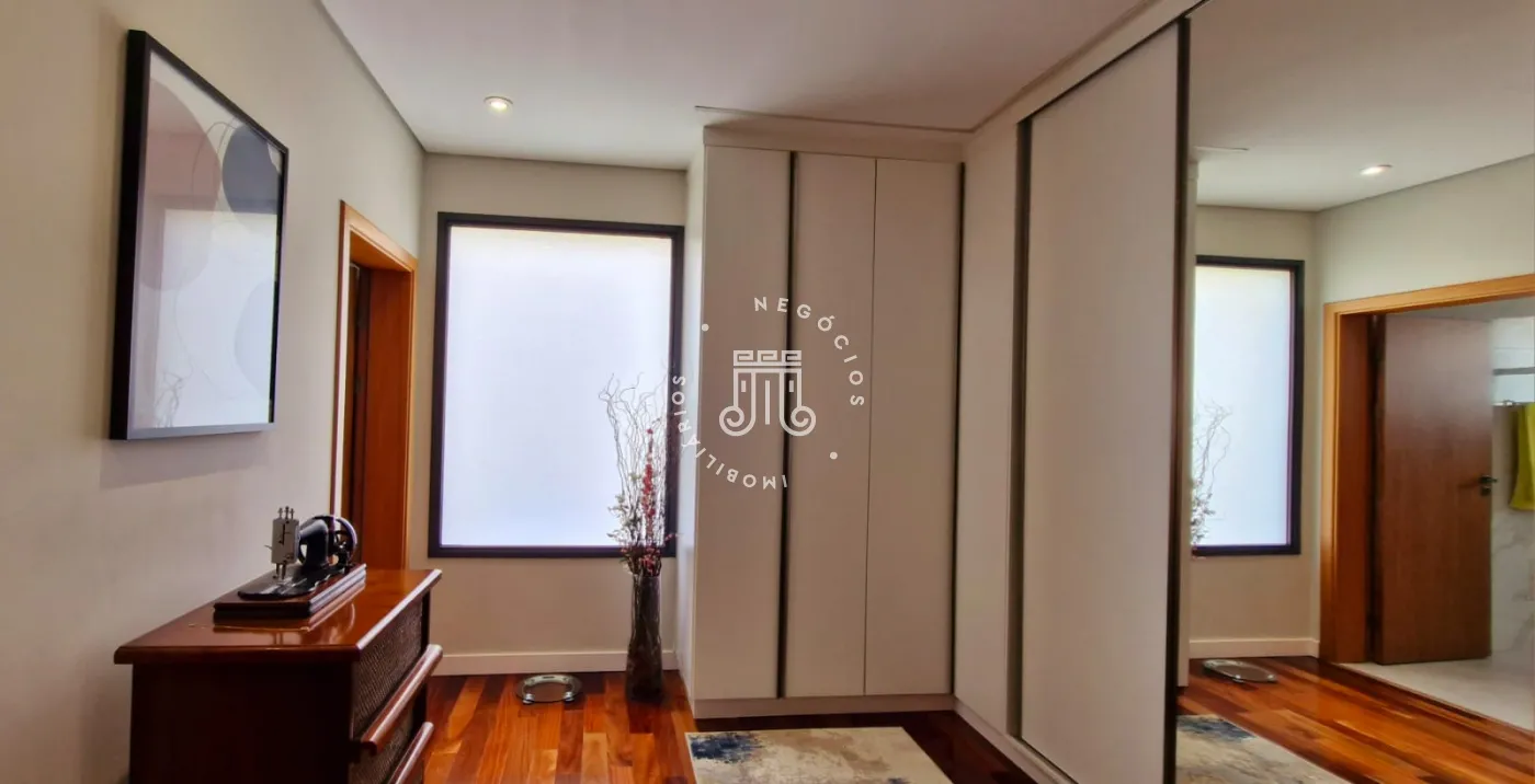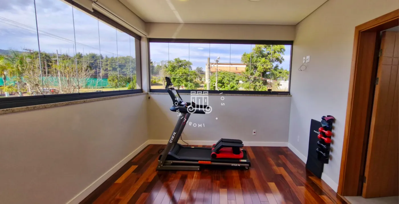 Mezanino com sala de televisão, sacada com vista para a Serra do Japi escritório e uma suíte que atualmente é usada como sala de ginástica.