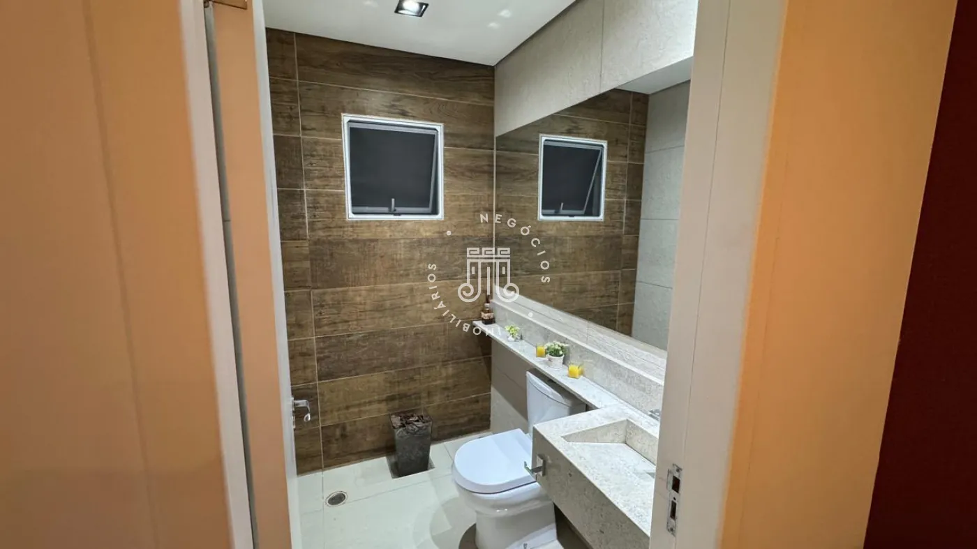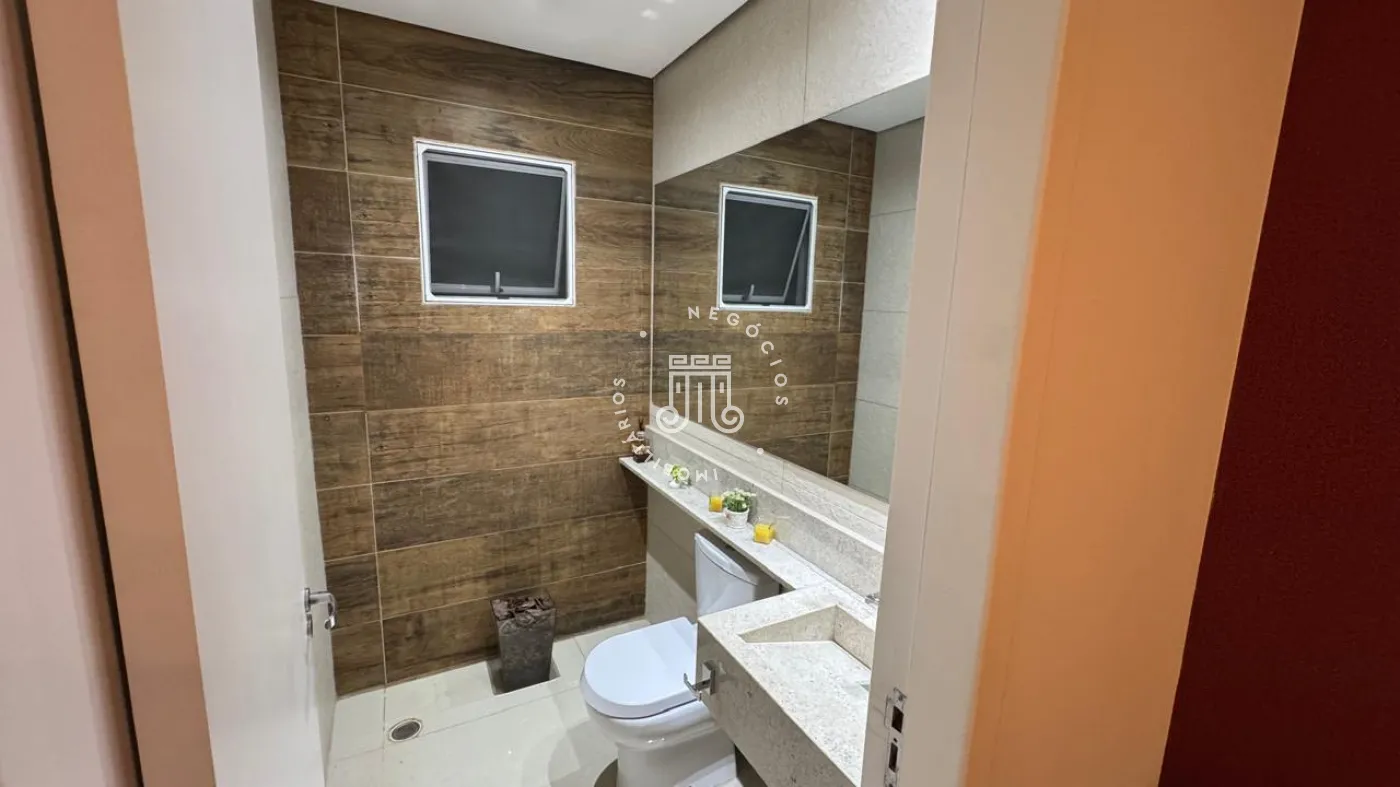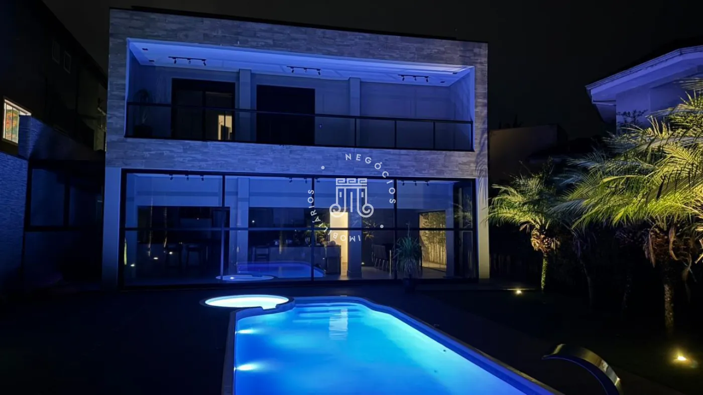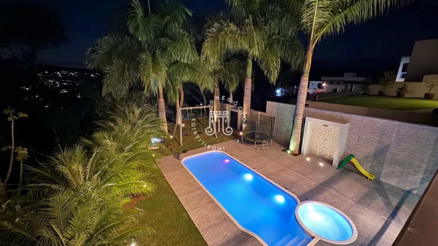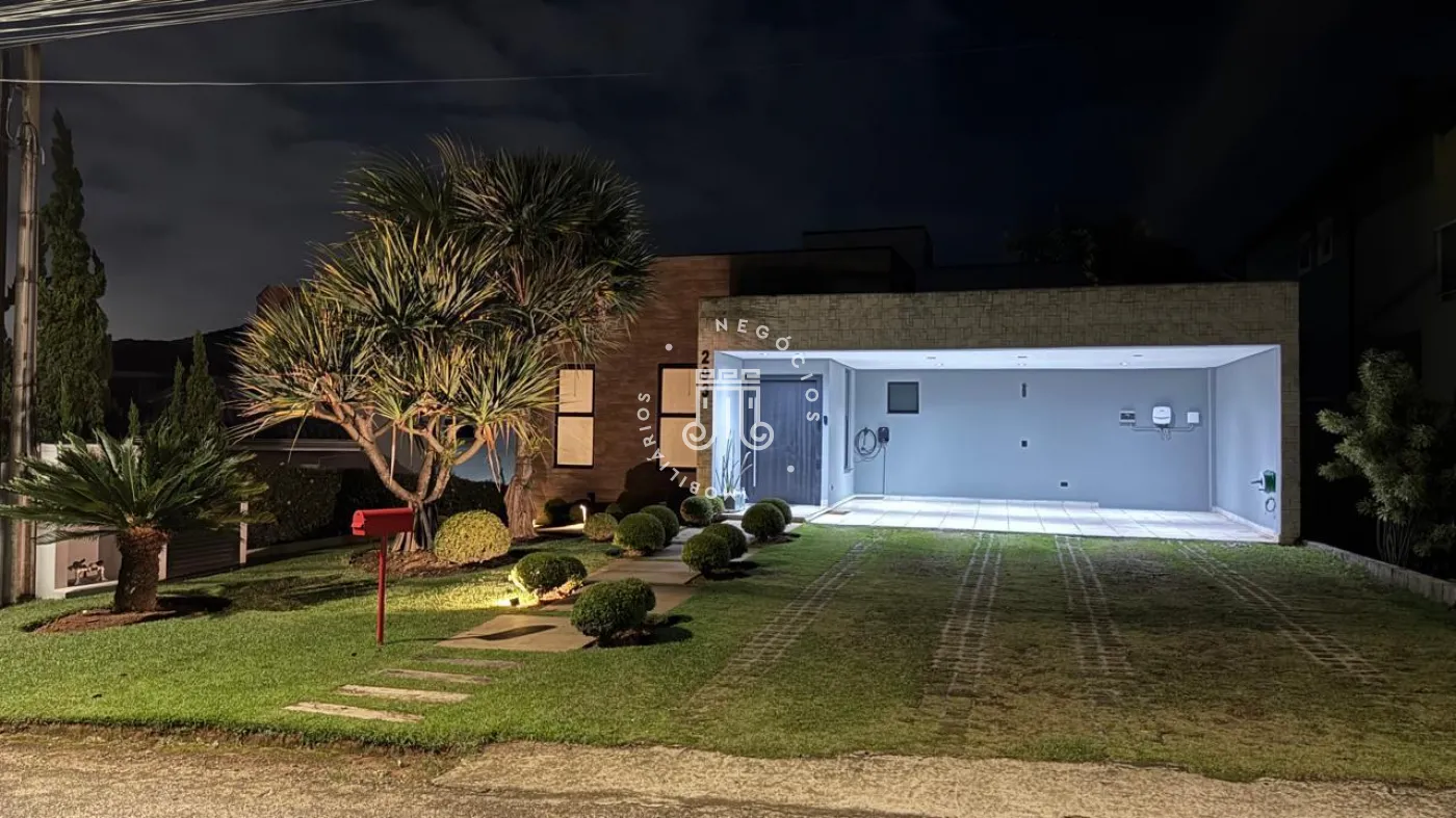 03 suítes sendo 01 master com closet, sala de estar, escritório, cozinha integrada com área gourmet e churrasqueira, piscina com cascata e led, 03 lavabos sendo 02 para atender o piso inferior e 01 no piso superior, garagem para 06 carros, sendo 02 cobertas. A casa ainda conta com gerador de energia e ponto de carregamento para carro elétrico, 12 placas de energia fotovoltaica.