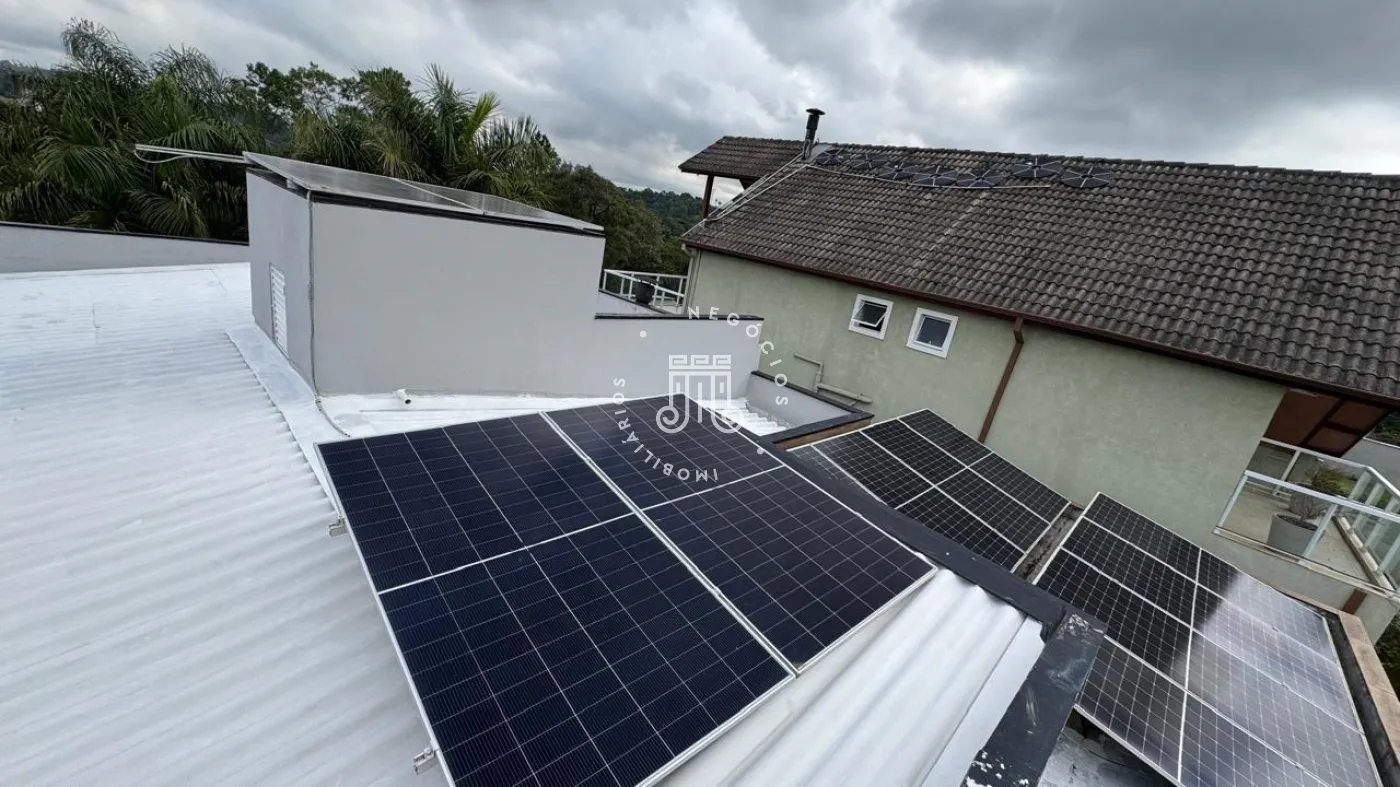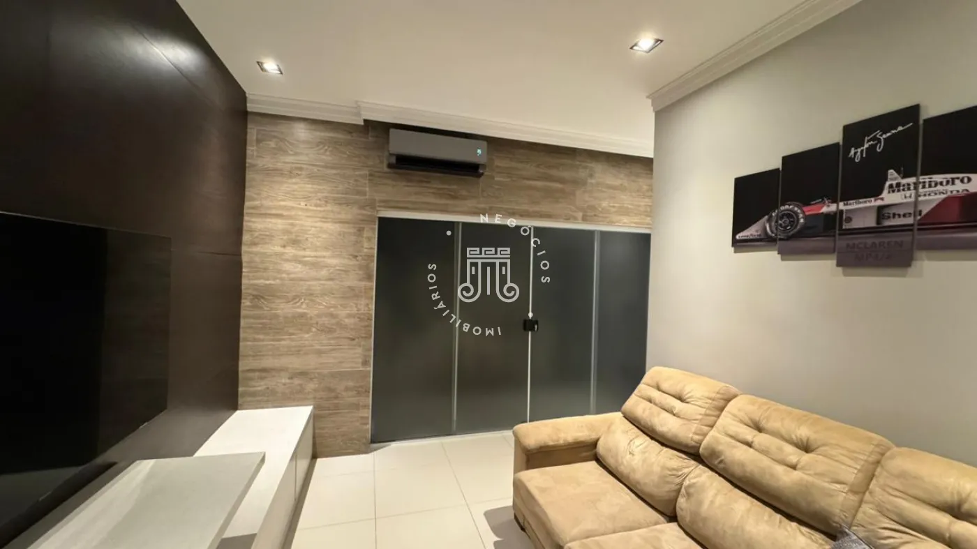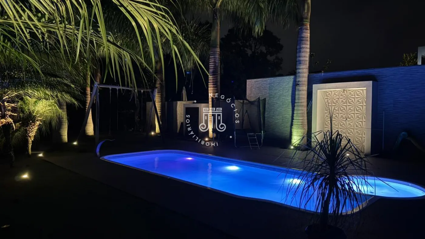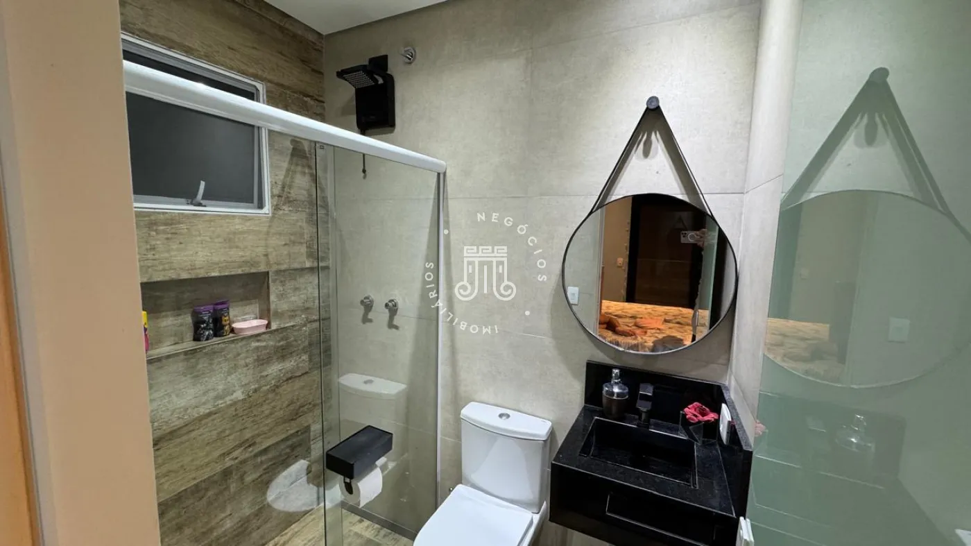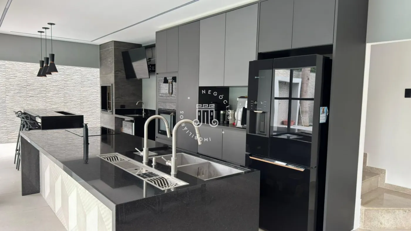 03 suítes sendo 01 master com closet, sala de estar, escritório, cozinha integrada com área gourmet e churrasqueira, piscina com cascata e led, 03 lavabos sendo 02 para atender o piso inferior e 01 no piso superior, garagem para 06 carros, sendo 02 cobertas. A casa ainda conta com gerador de energia e ponto de carregamento para carro elétrico, 12 placas de energia fotovoltaica.