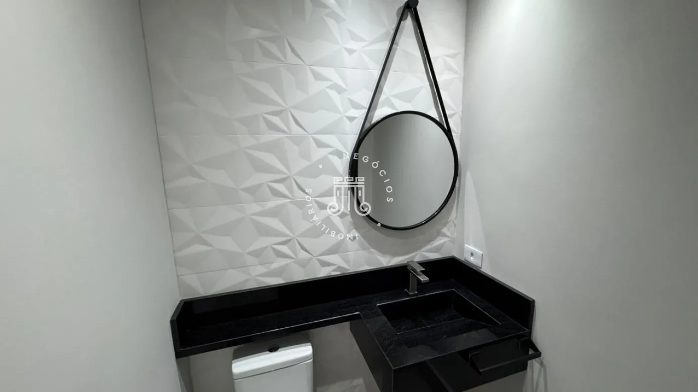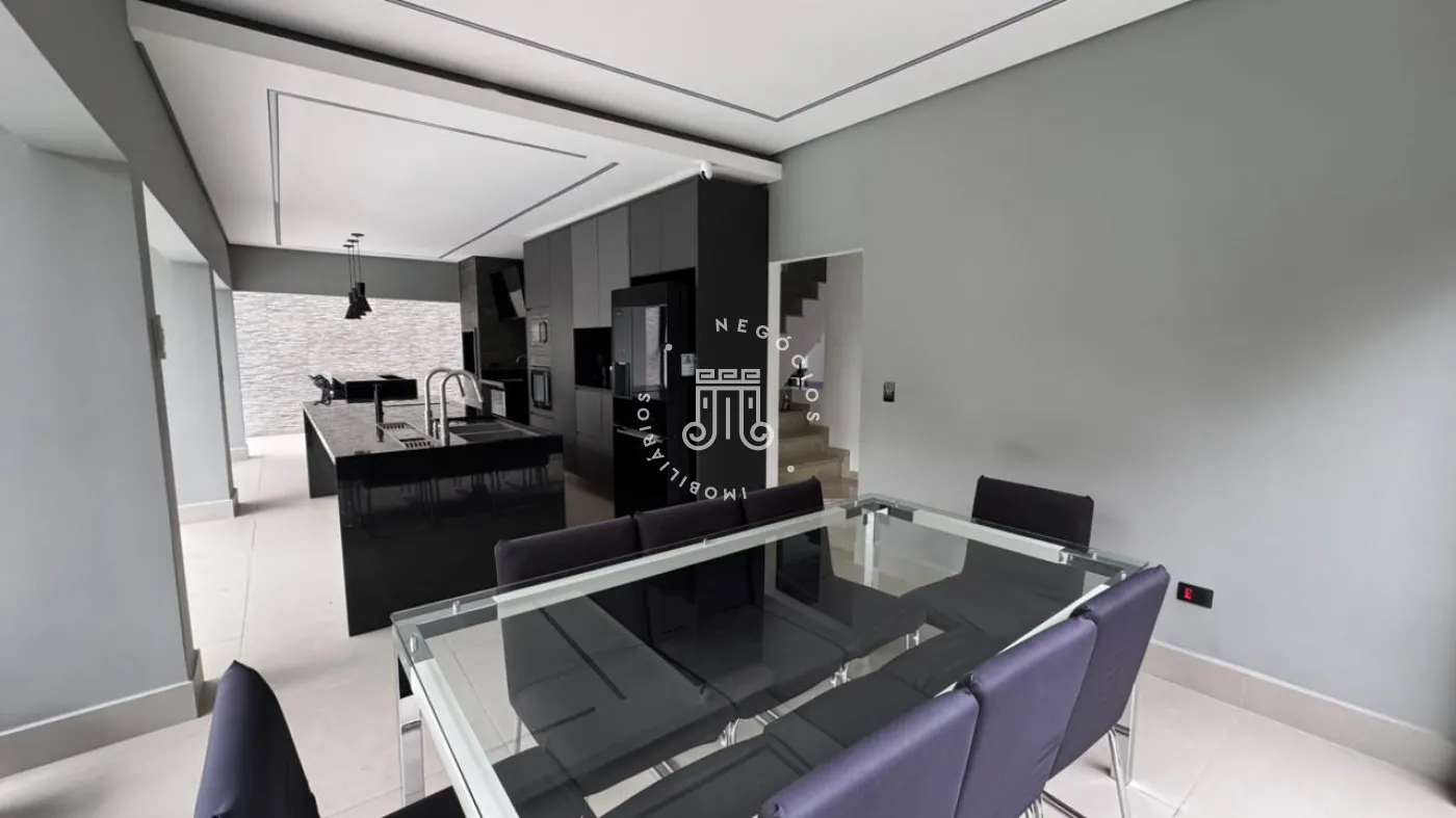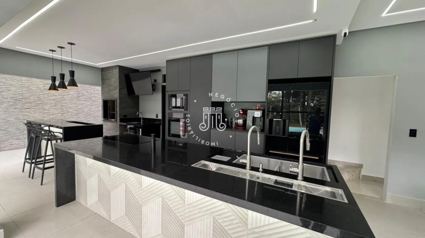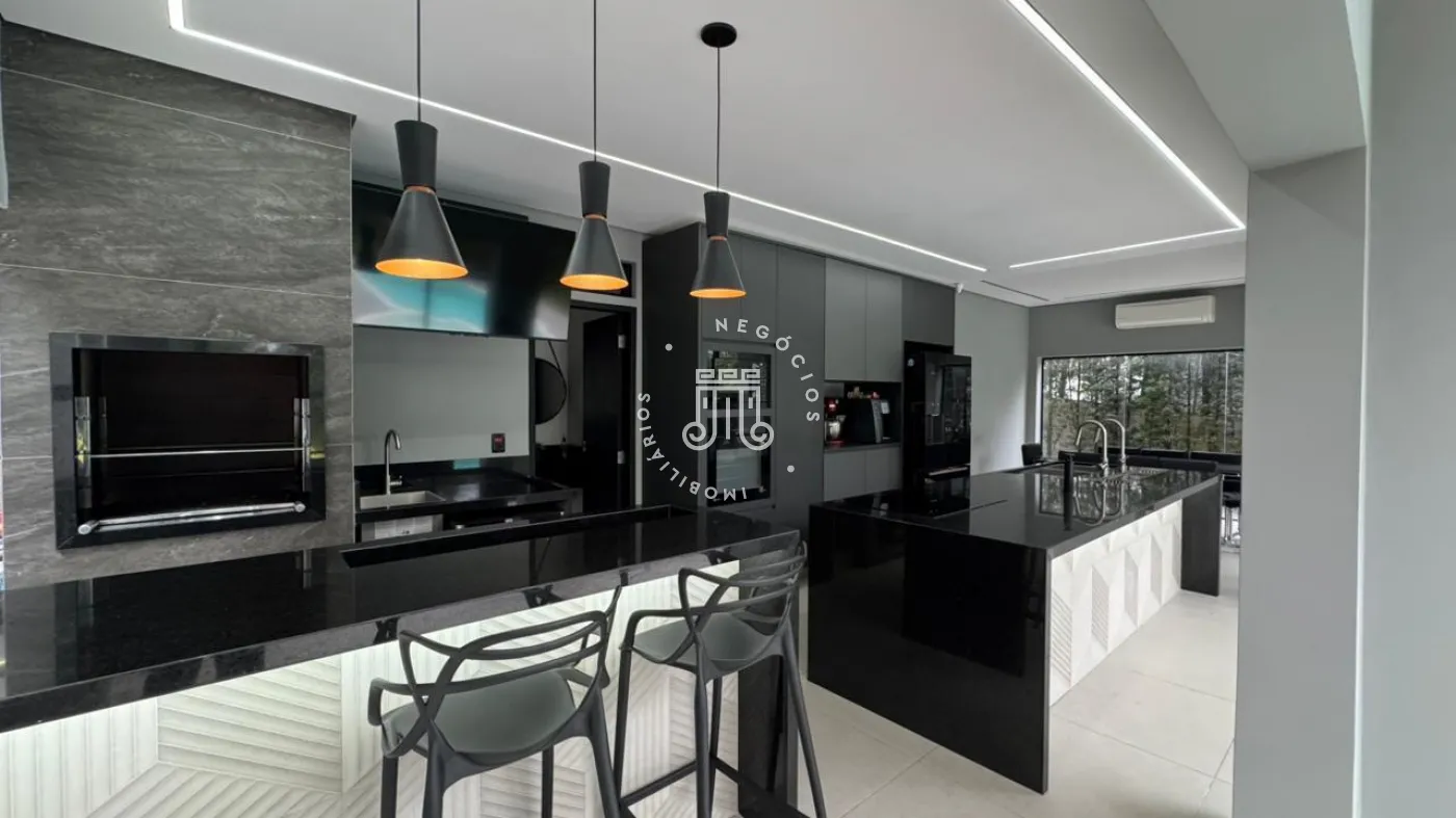03 suítes sendo 01 master com closet, sala de estar, escritório, cozinha integrada com área gourmet e churrasqueira, piscina com cascata e led, 03 lavabos sendo 02 para atender o piso inferior e 01 no piso superior, garagem para 06 carros, sendo 02 cobertas. A casa ainda conta com gerador de energia e ponto de carregamento para carro elétrico, 12 placas de energia fotovoltaica.