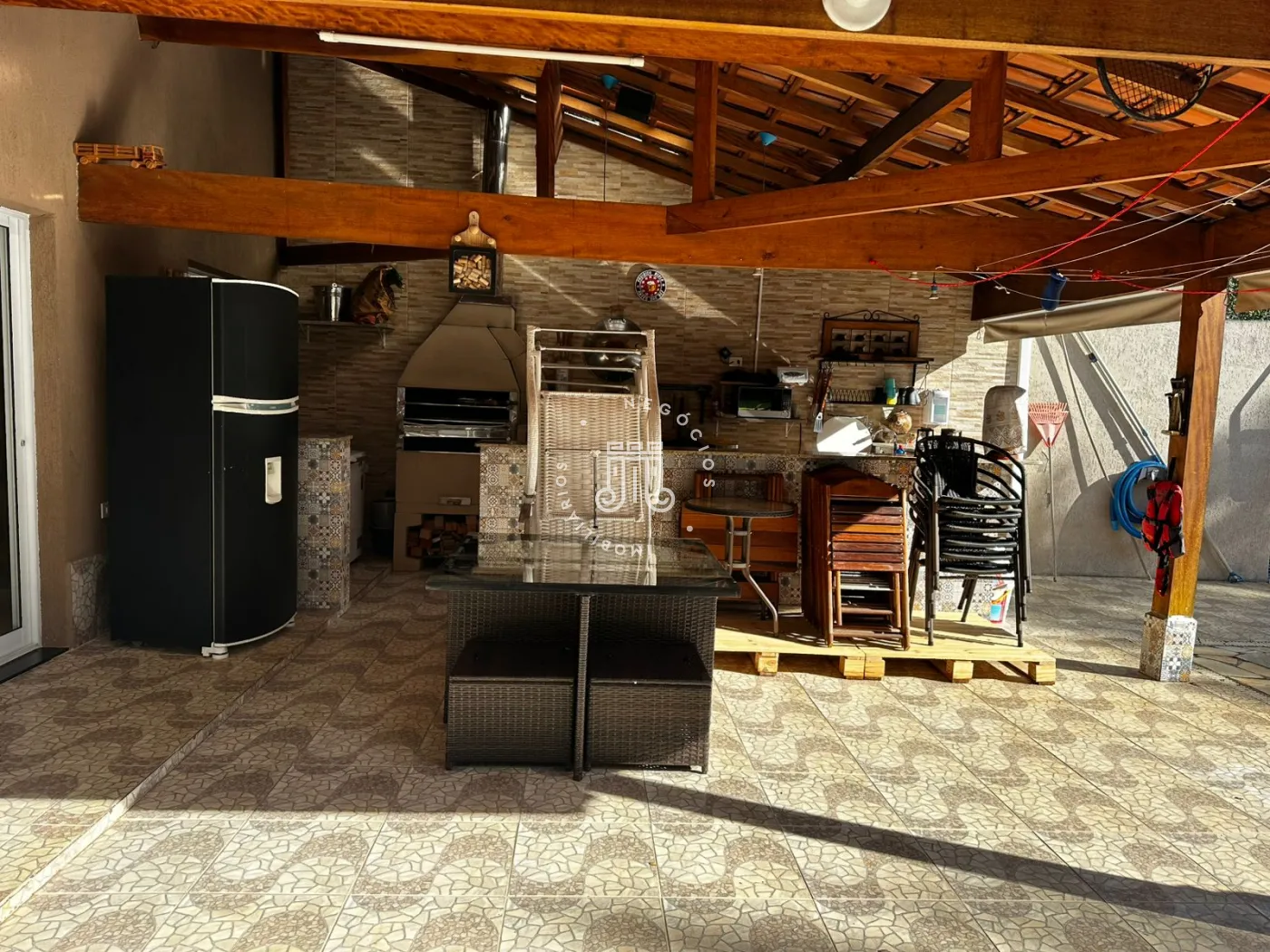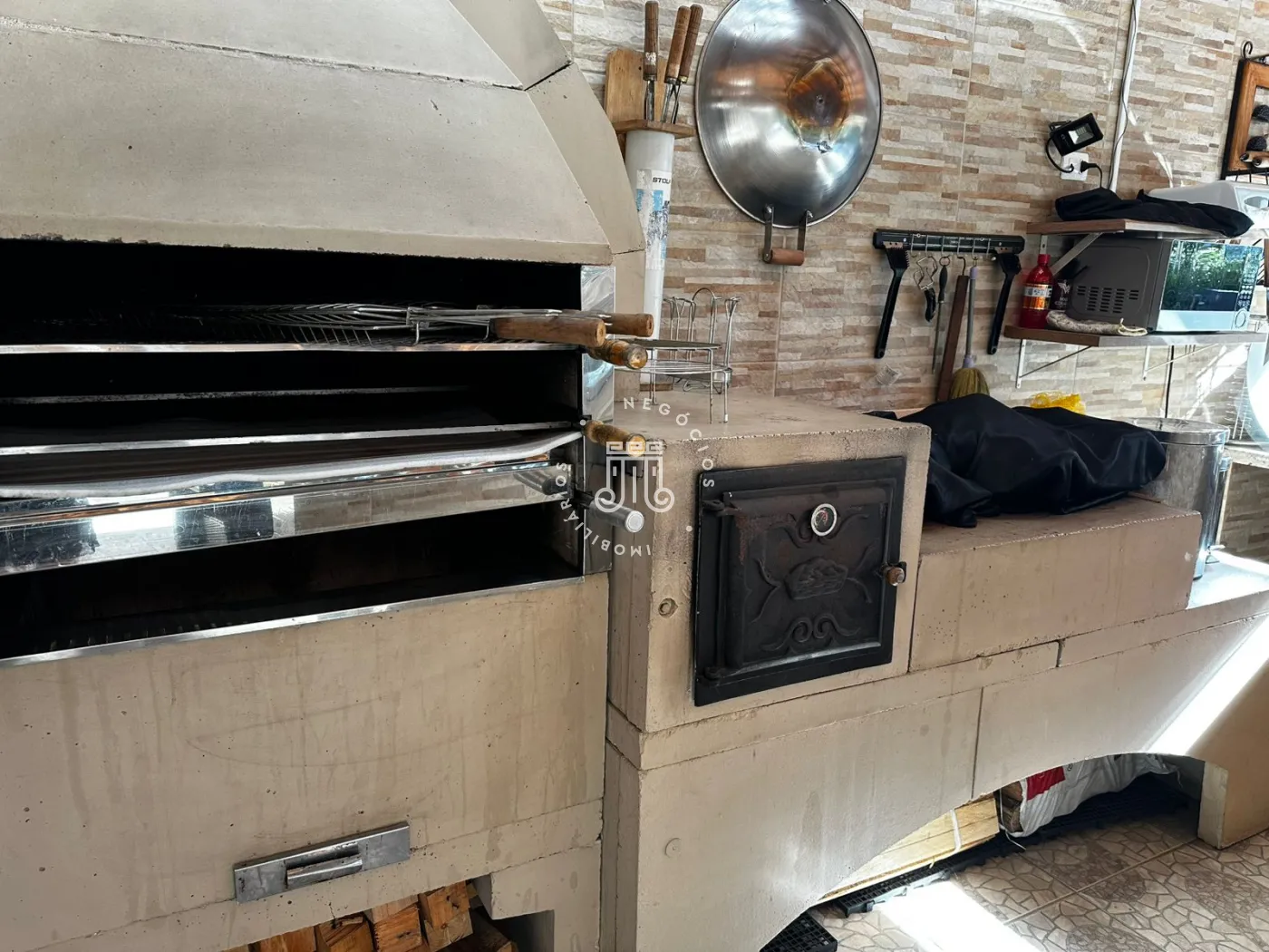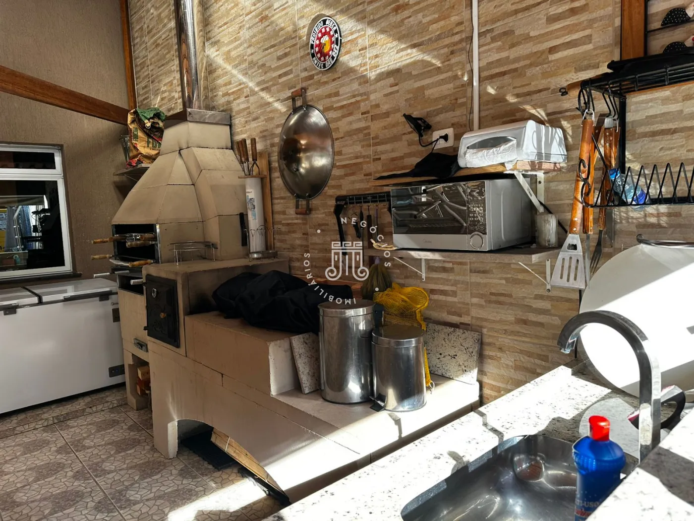 A cozinha inferior, funcional e bem equipada, complementa a área gourmet externa, um convite irrecusável para momentos memoráveis. Equipada com churrasqueira e forno de pizza, é o cenário perfeito para confraternizações e celebrações ao ar livre.