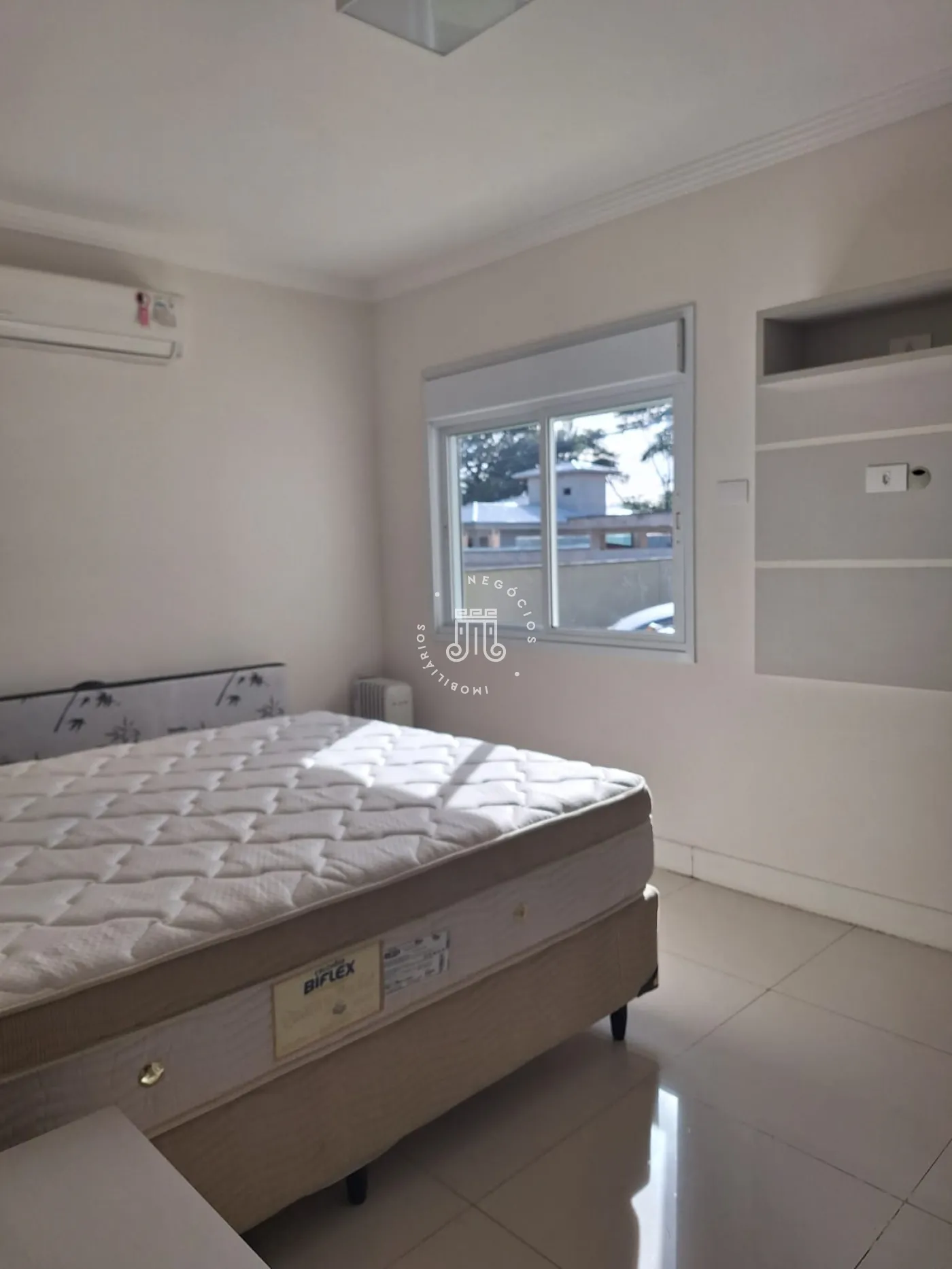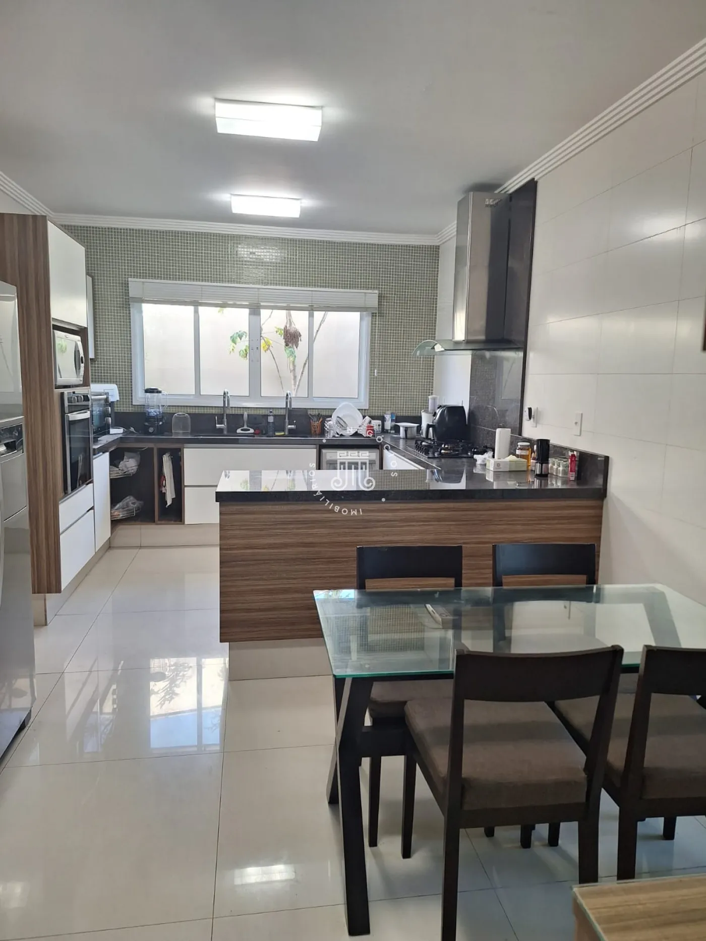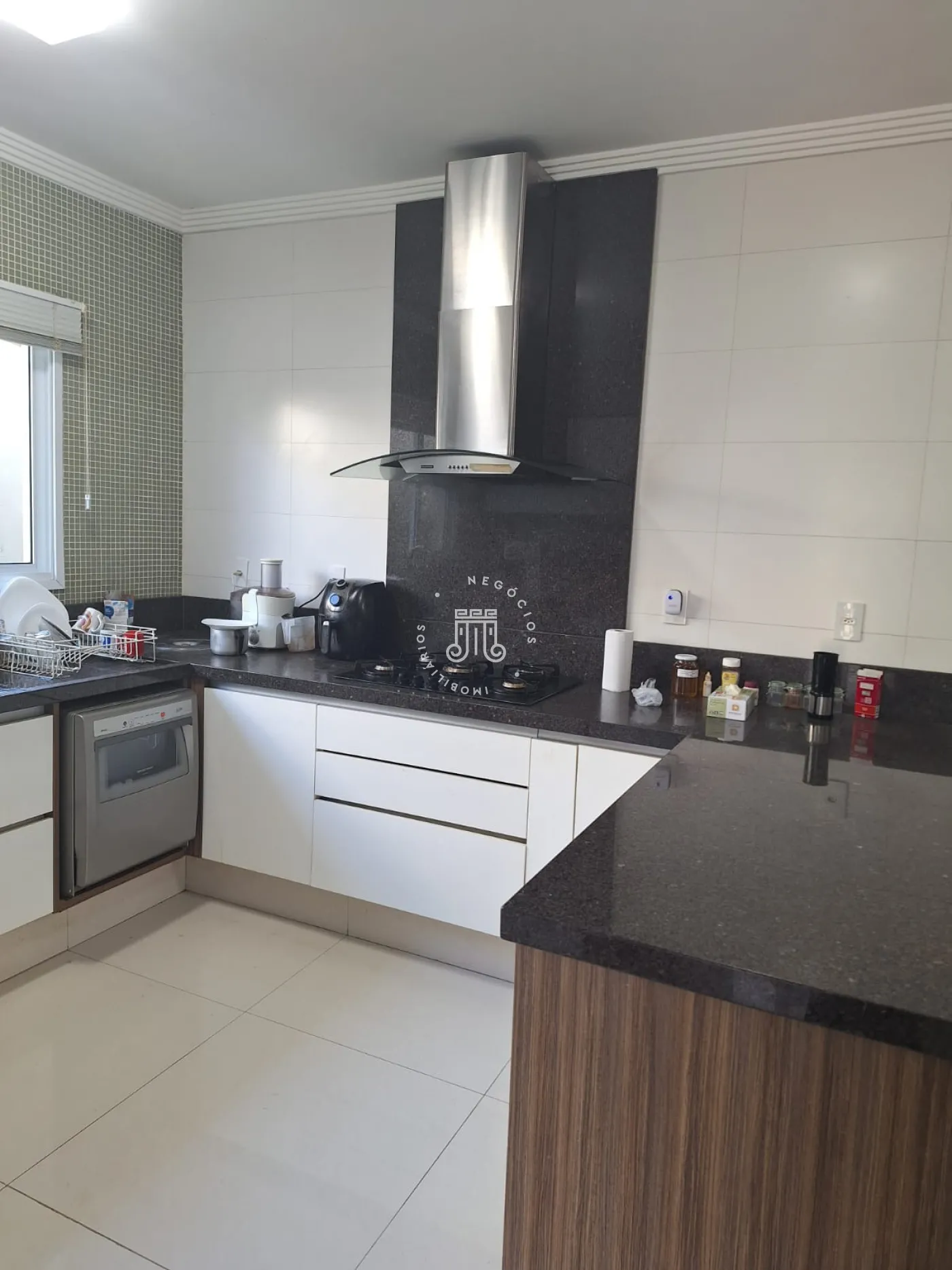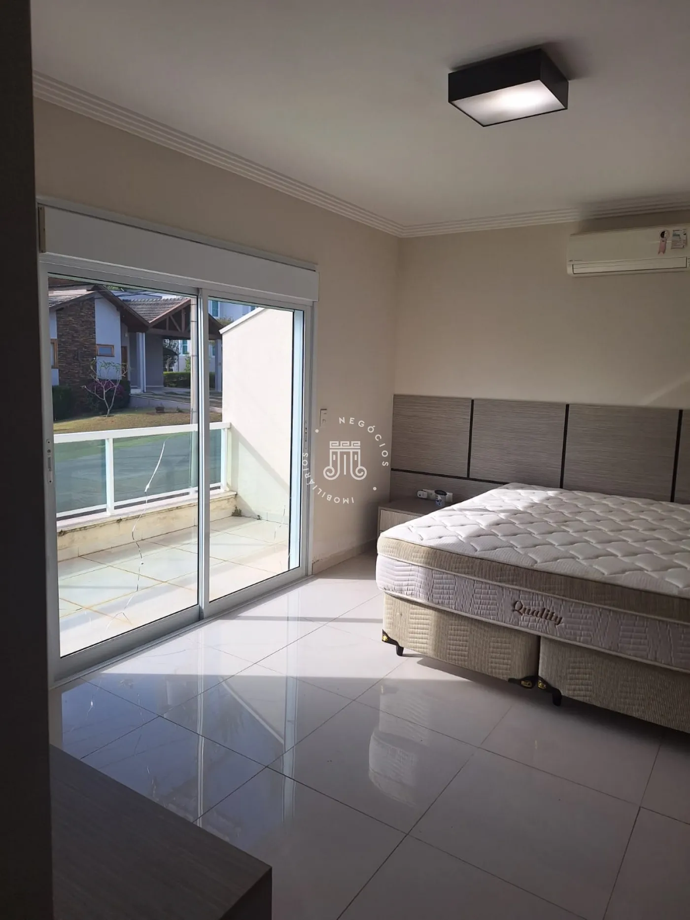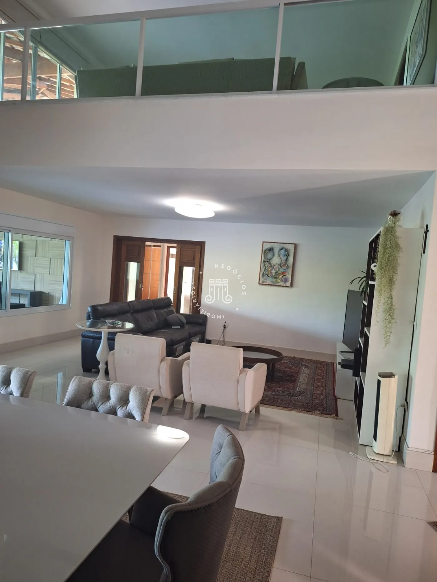 A área de lazer inclui espaço gourmet, piscina e ofurô em uma ampla área externa. No andar superior, há uma sala íntima e uma suíte com closet. O imóvel possui ar-condicionado nos dormitórios e janelas automatizadas.