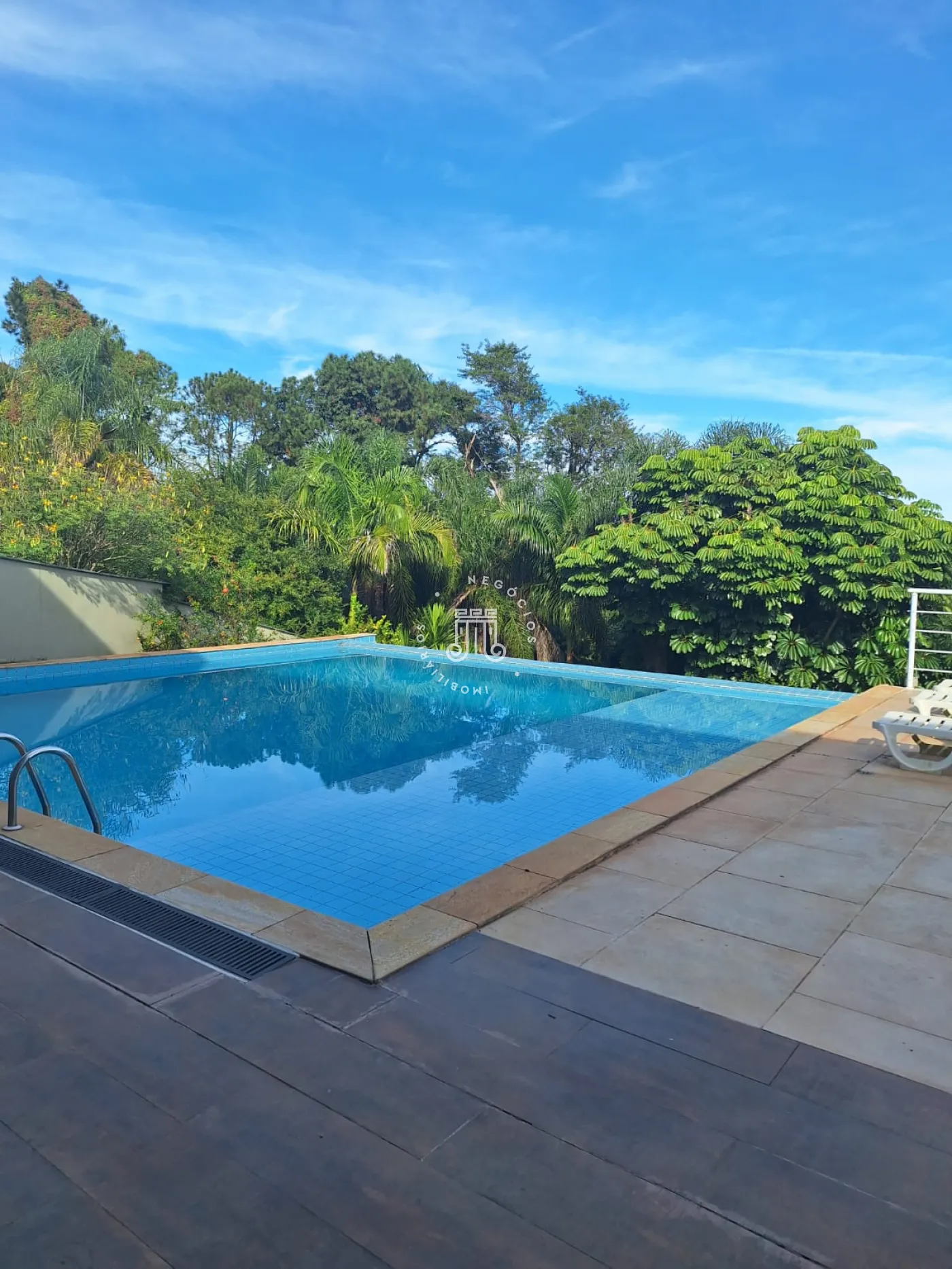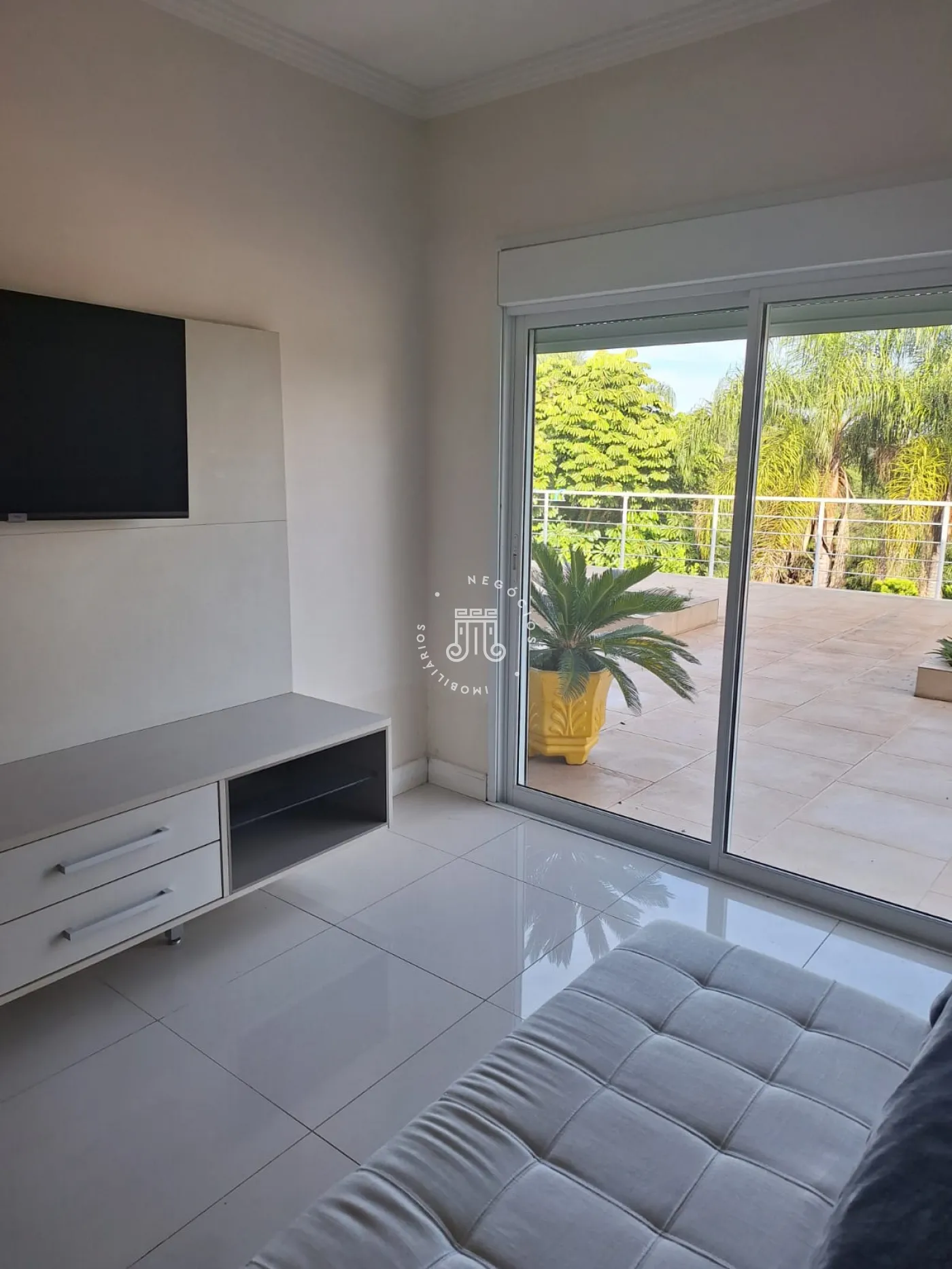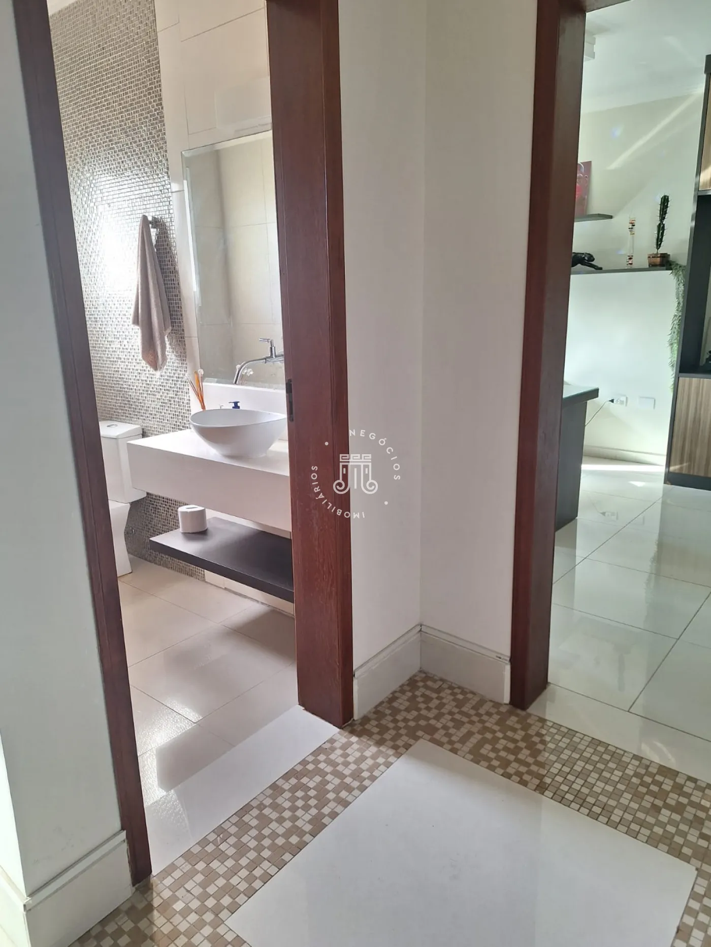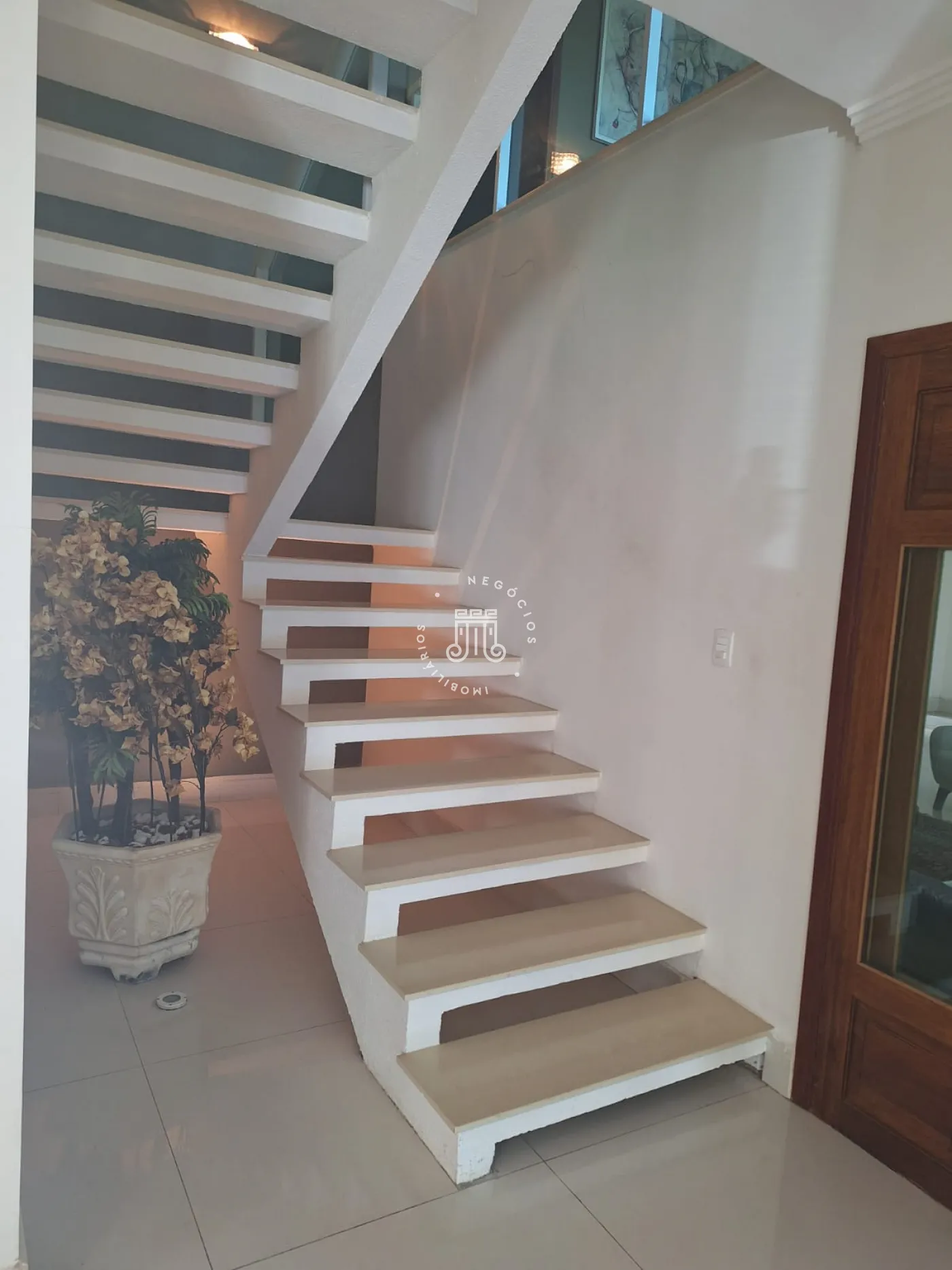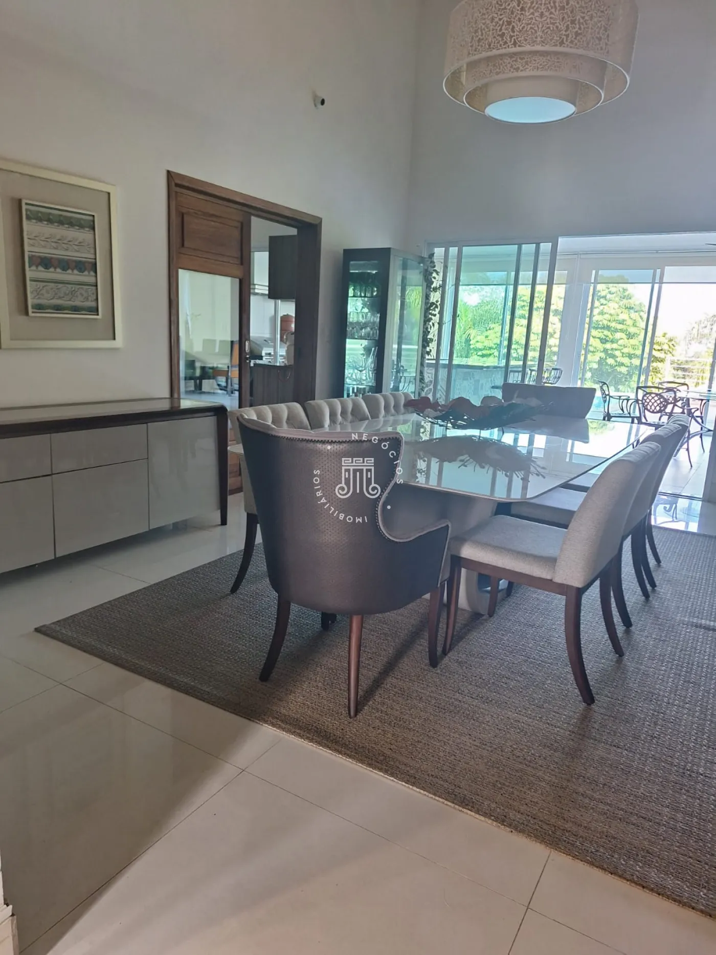 A área de lazer inclui espaço gourmet, piscina e ofurô em uma ampla área externa. No andar superior, há uma sala íntima e uma suíte com closet. O imóvel possui ar-condicionado nos dormitórios e janelas automatizadas.