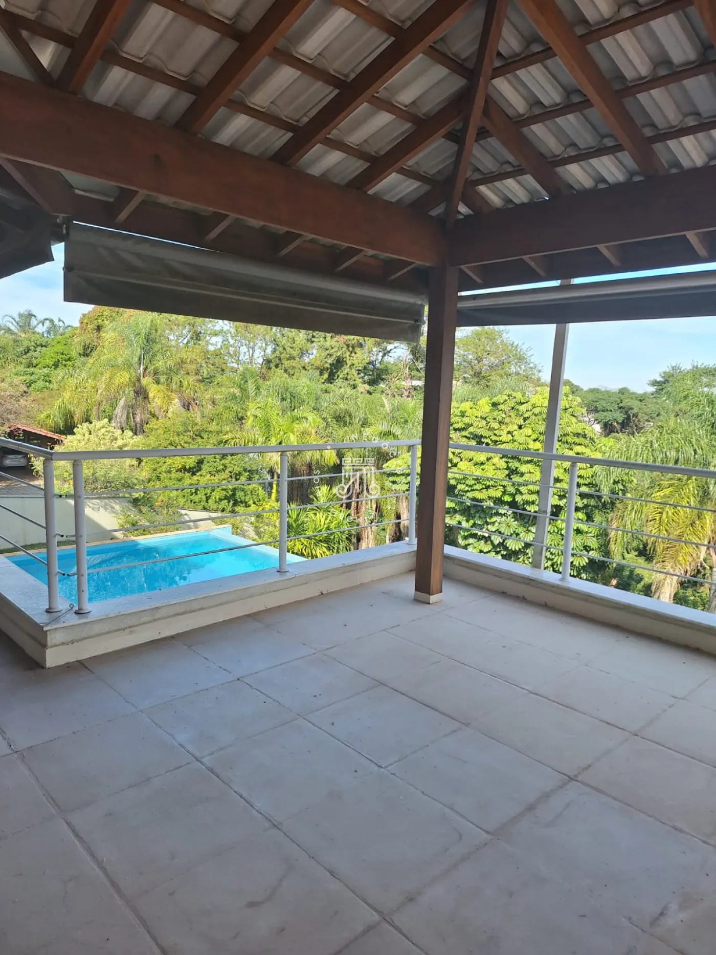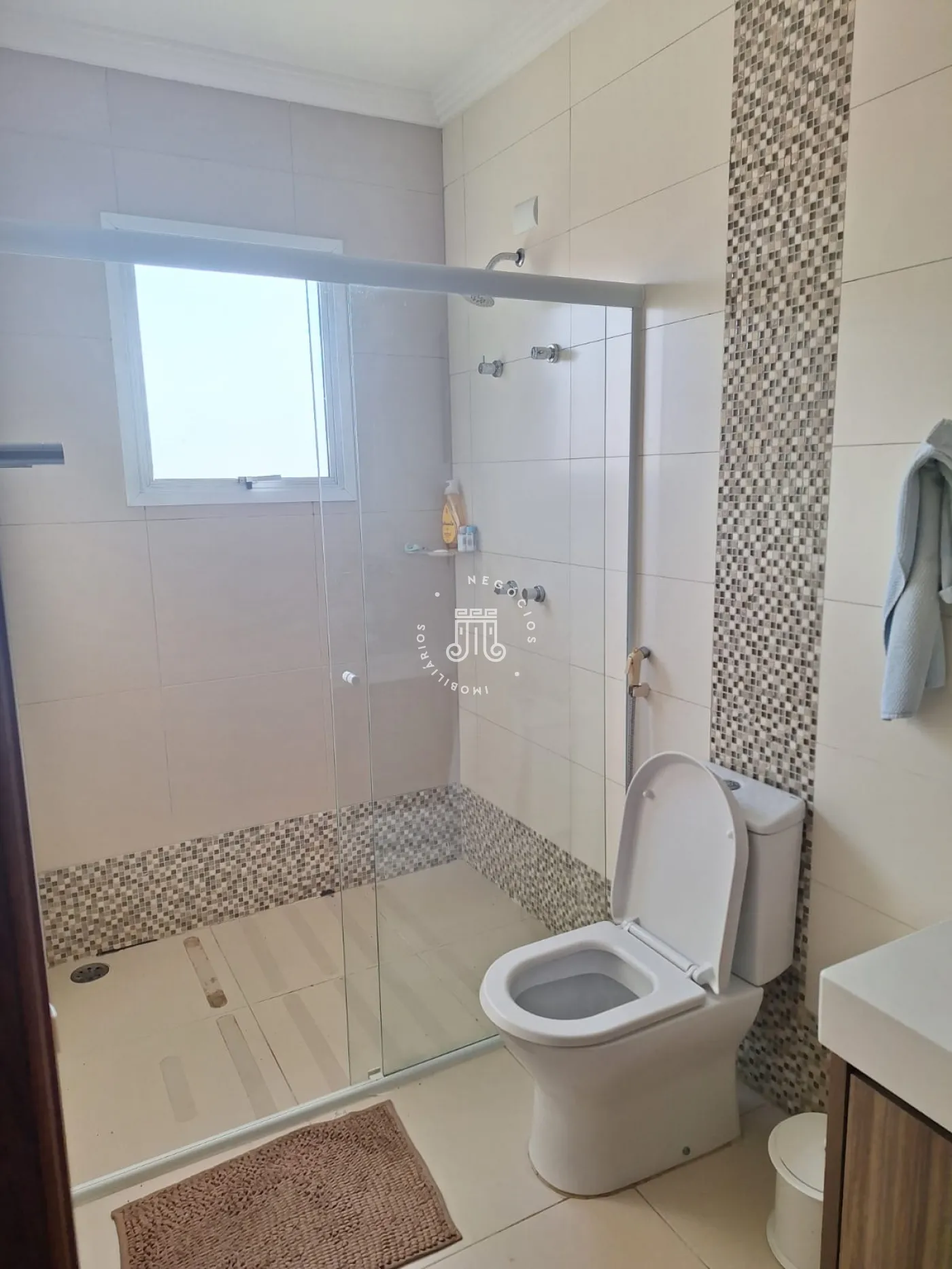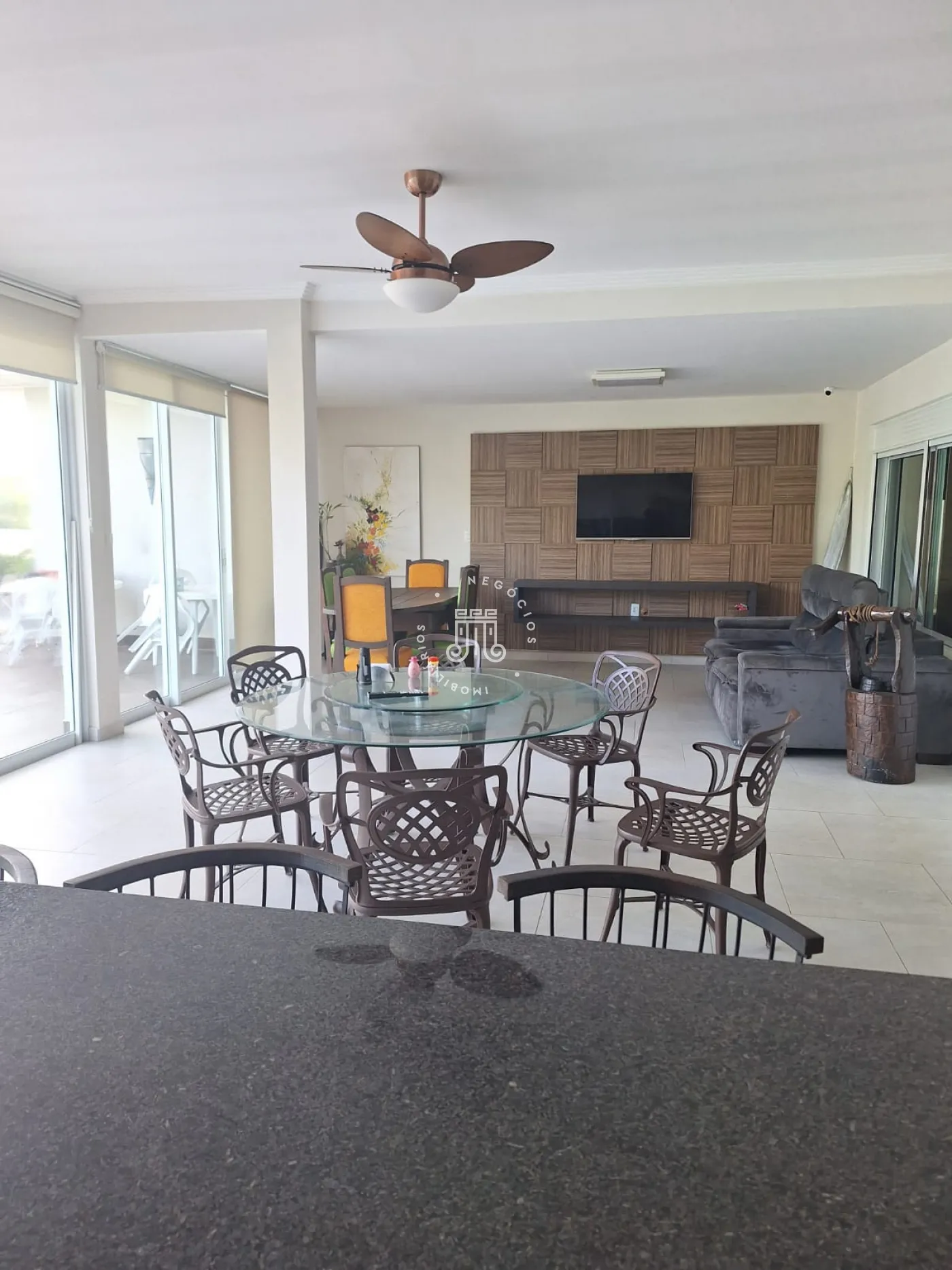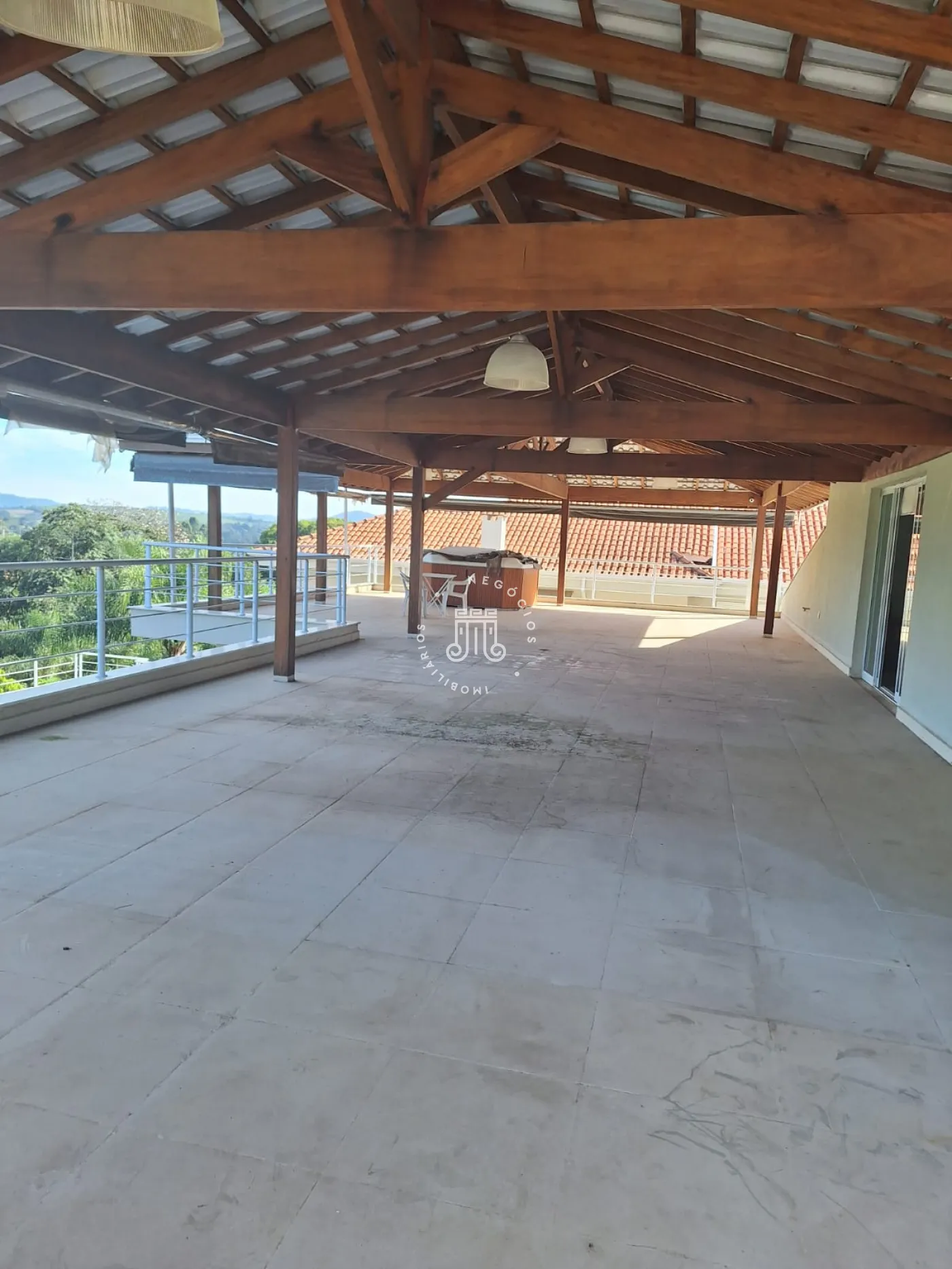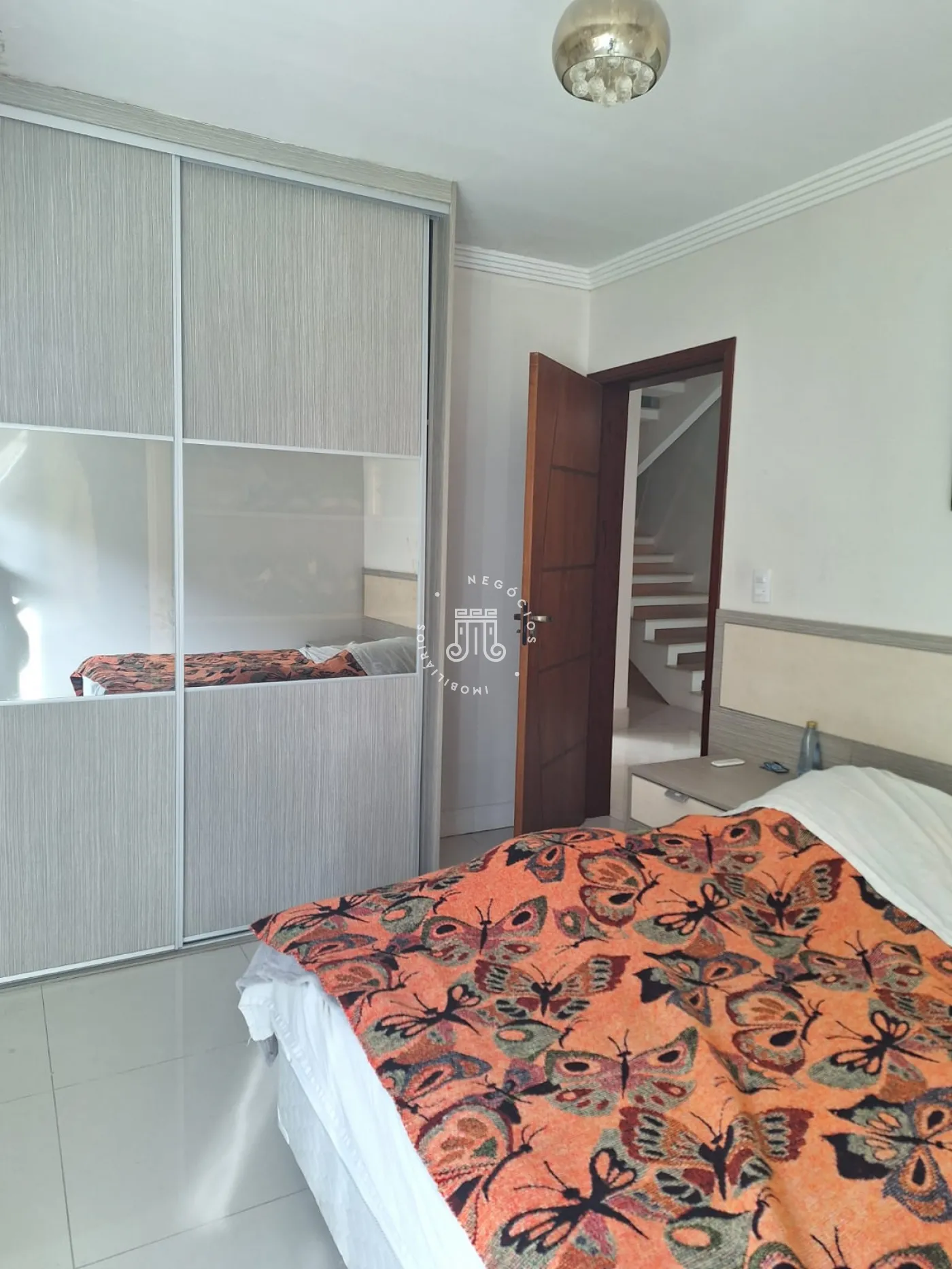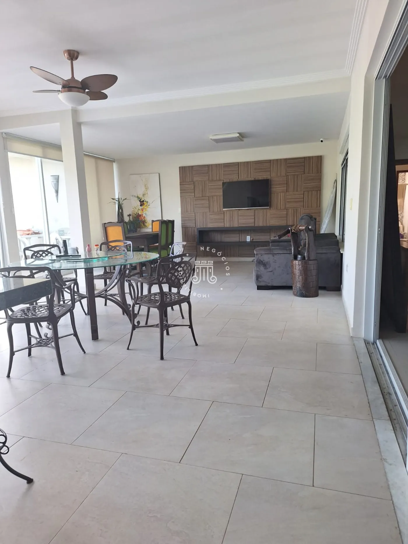 A área de lazer inclui espaço gourmet, piscina e ofurô em uma ampla área externa. No andar superior, há uma sala íntima e uma suíte com closet. O imóvel possui ar-condicionado nos dormitórios e janelas automatizadas.