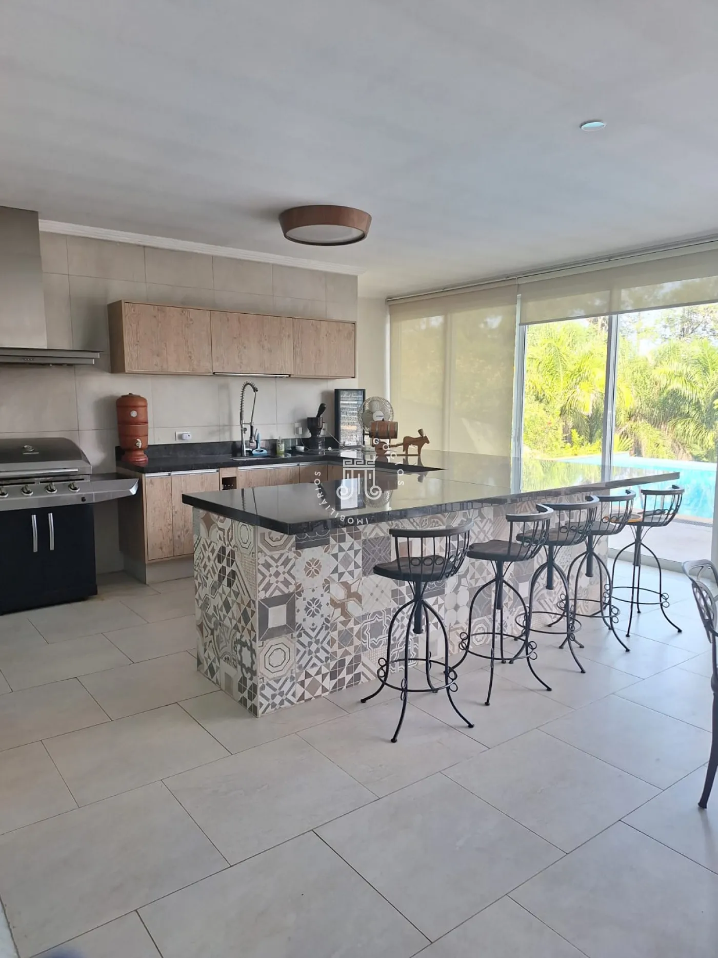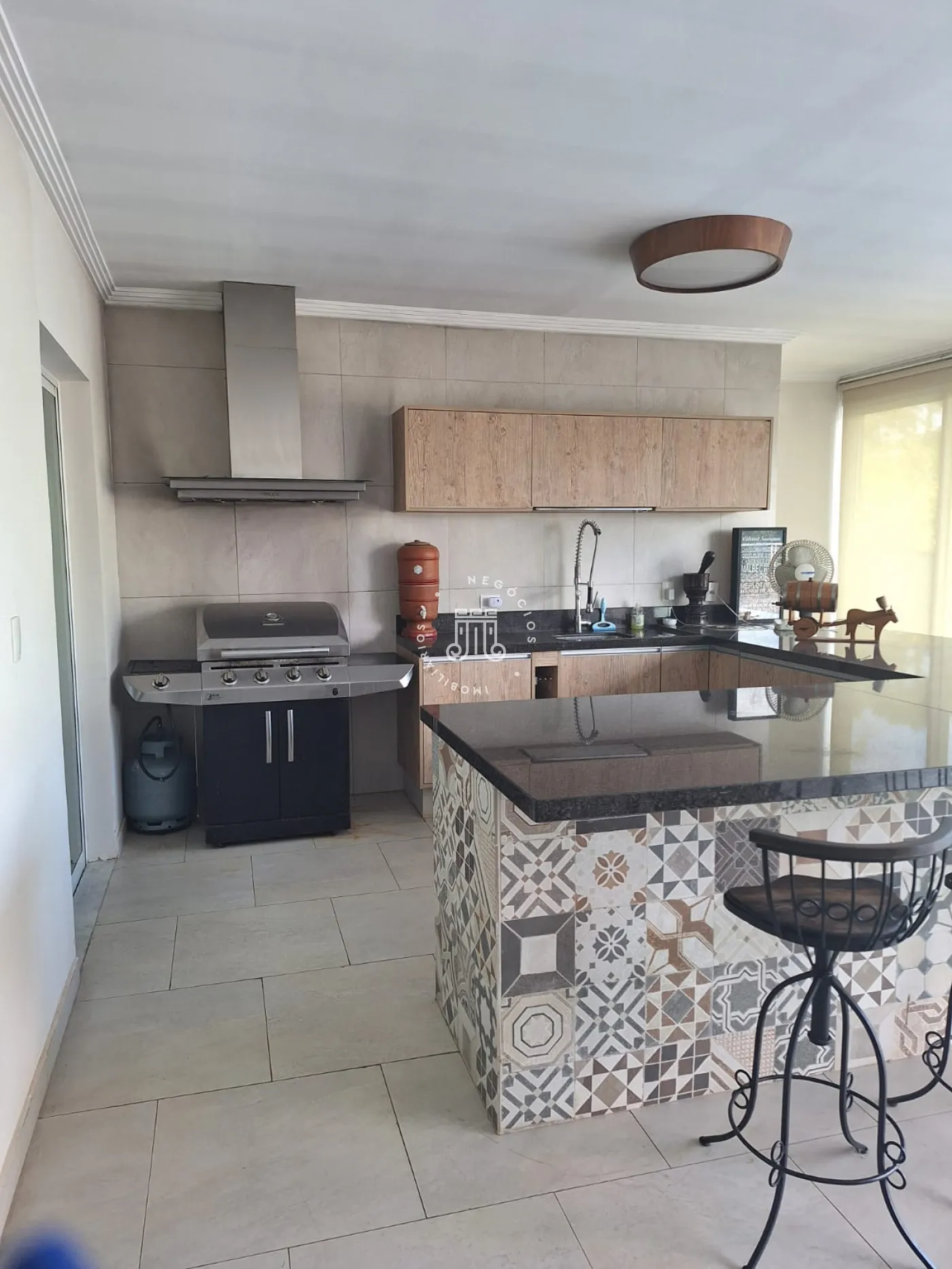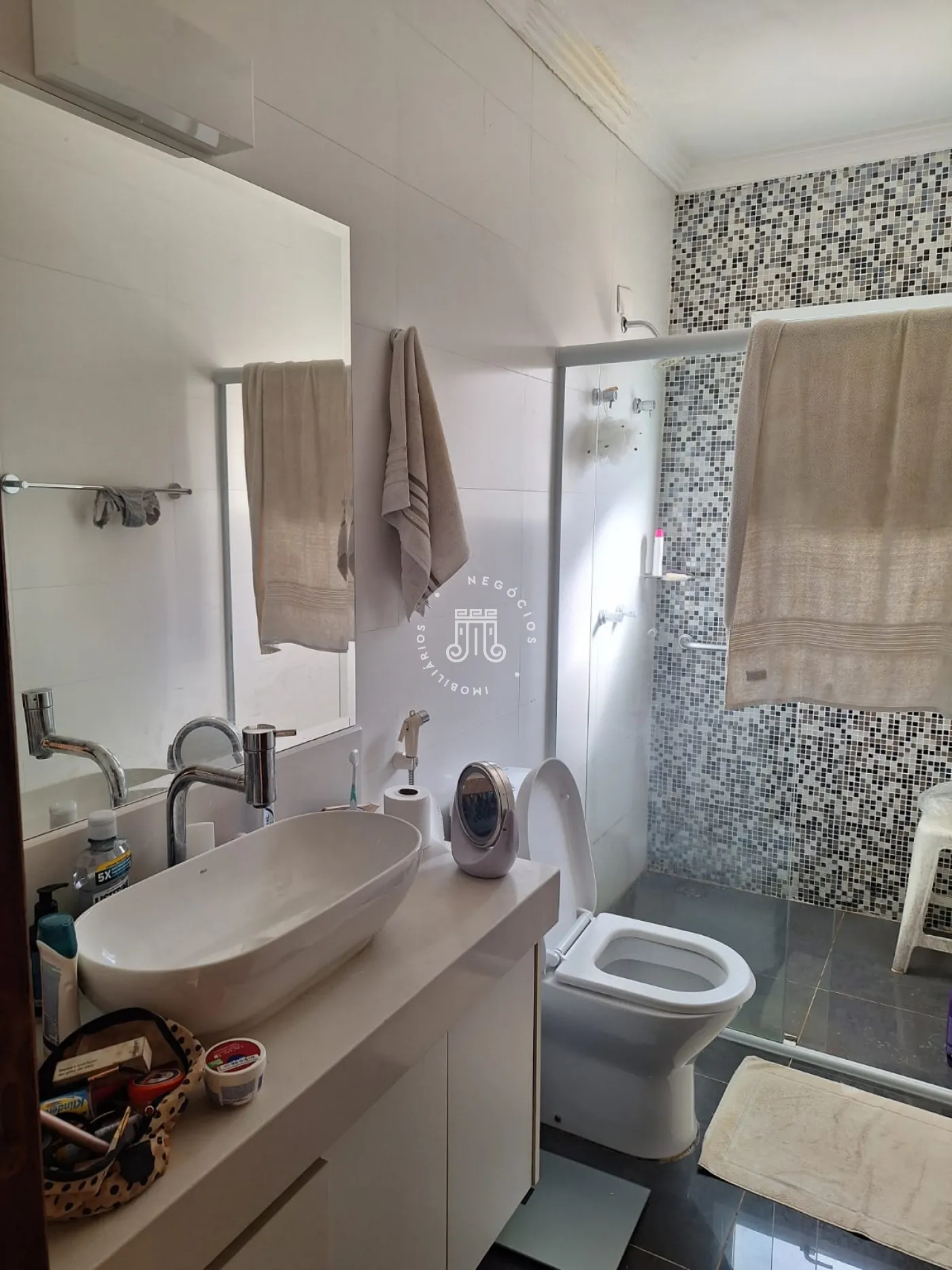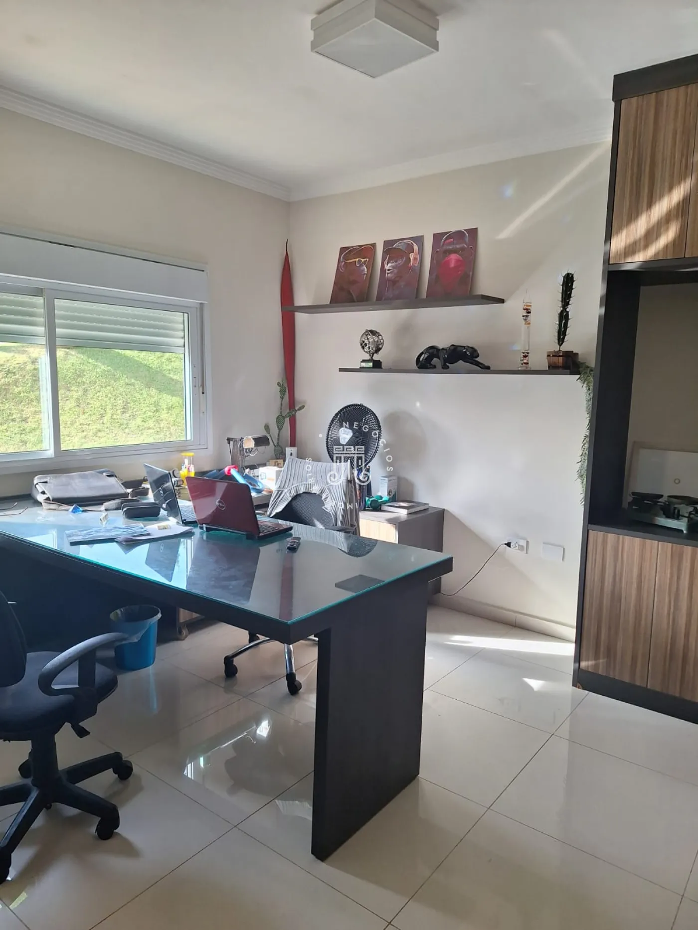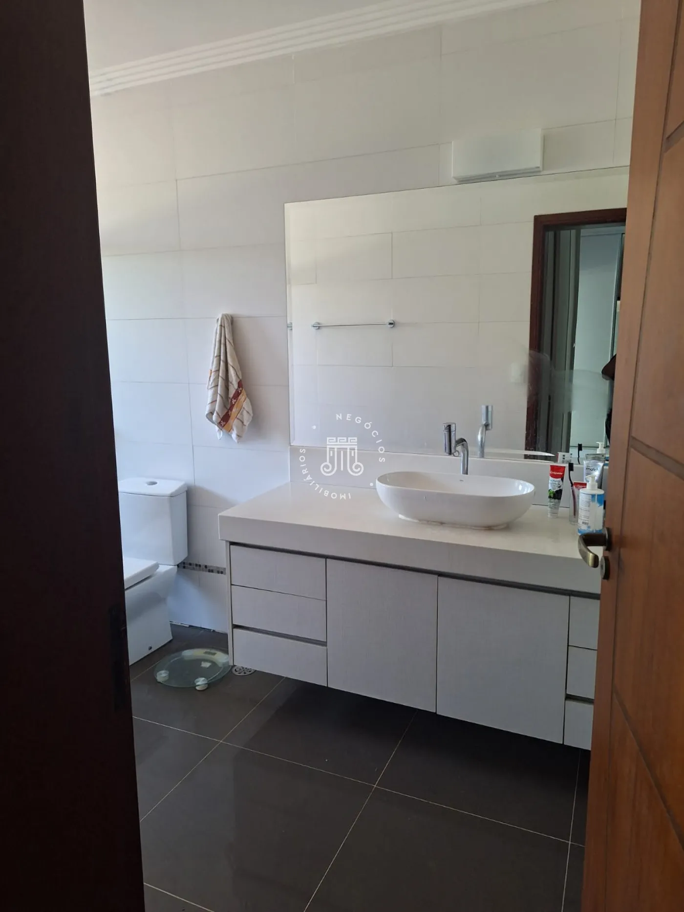 A área de lazer inclui espaço gourmet, piscina e ofurô em uma ampla área externa. No andar superior, há uma sala íntima e uma suíte com closet. O imóvel possui ar-condicionado nos dormitórios e janelas automatizadas.