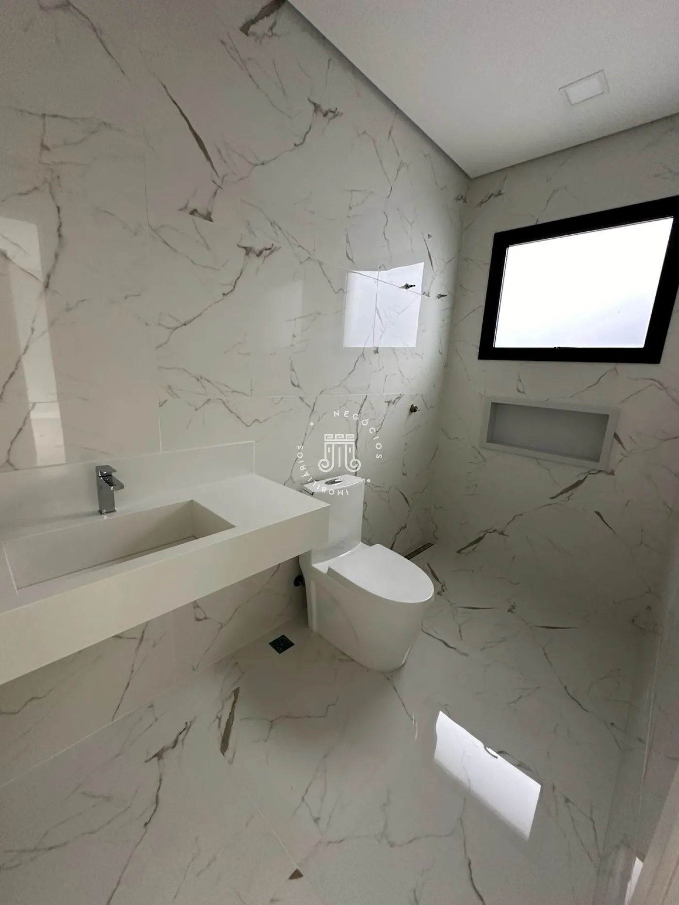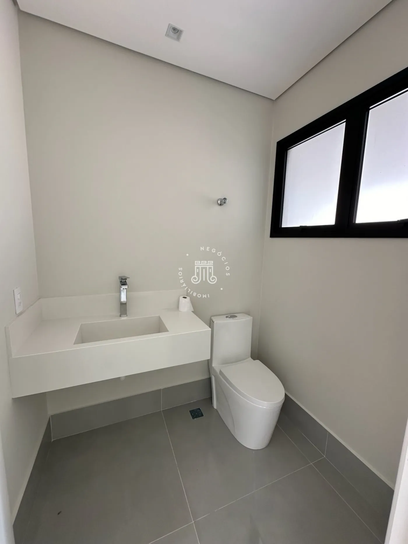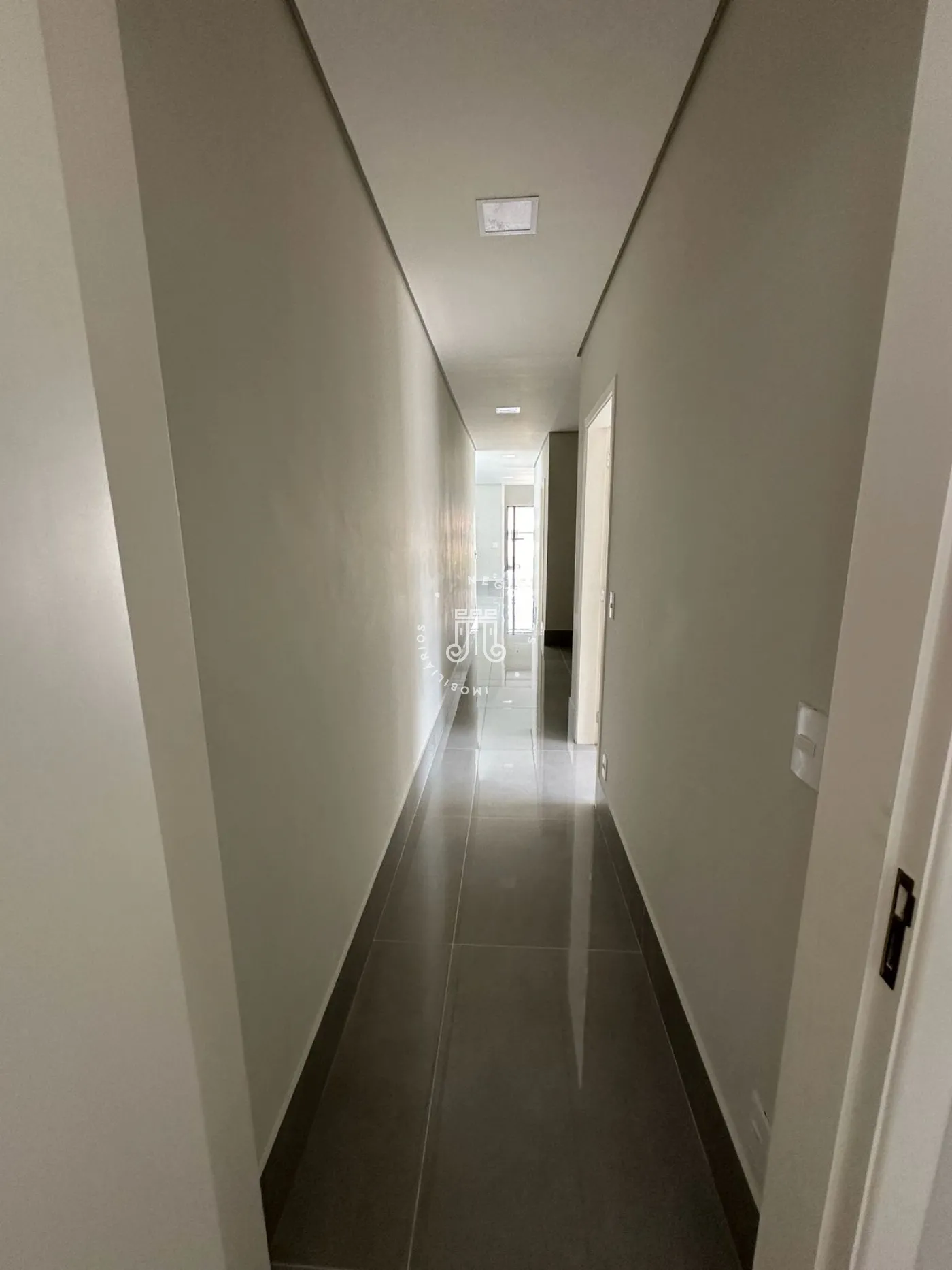 A área íntima é composta por três suítes, sendo uma suíte master com closet e duas suítes adicionais. Há ainda um lavabo. A garagem tem capacidade para dois veículos. O imóvel dispõe de infraestrutura para ar-condicionado e persianas elétricas nos quartos.