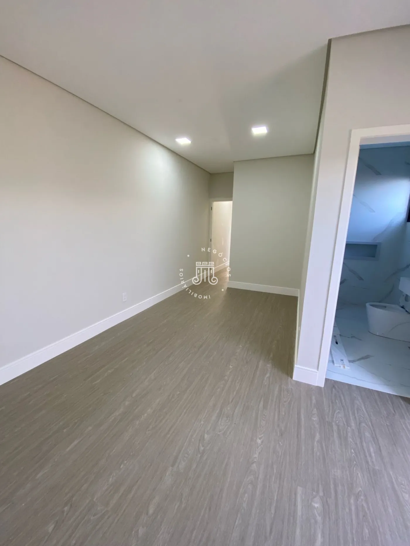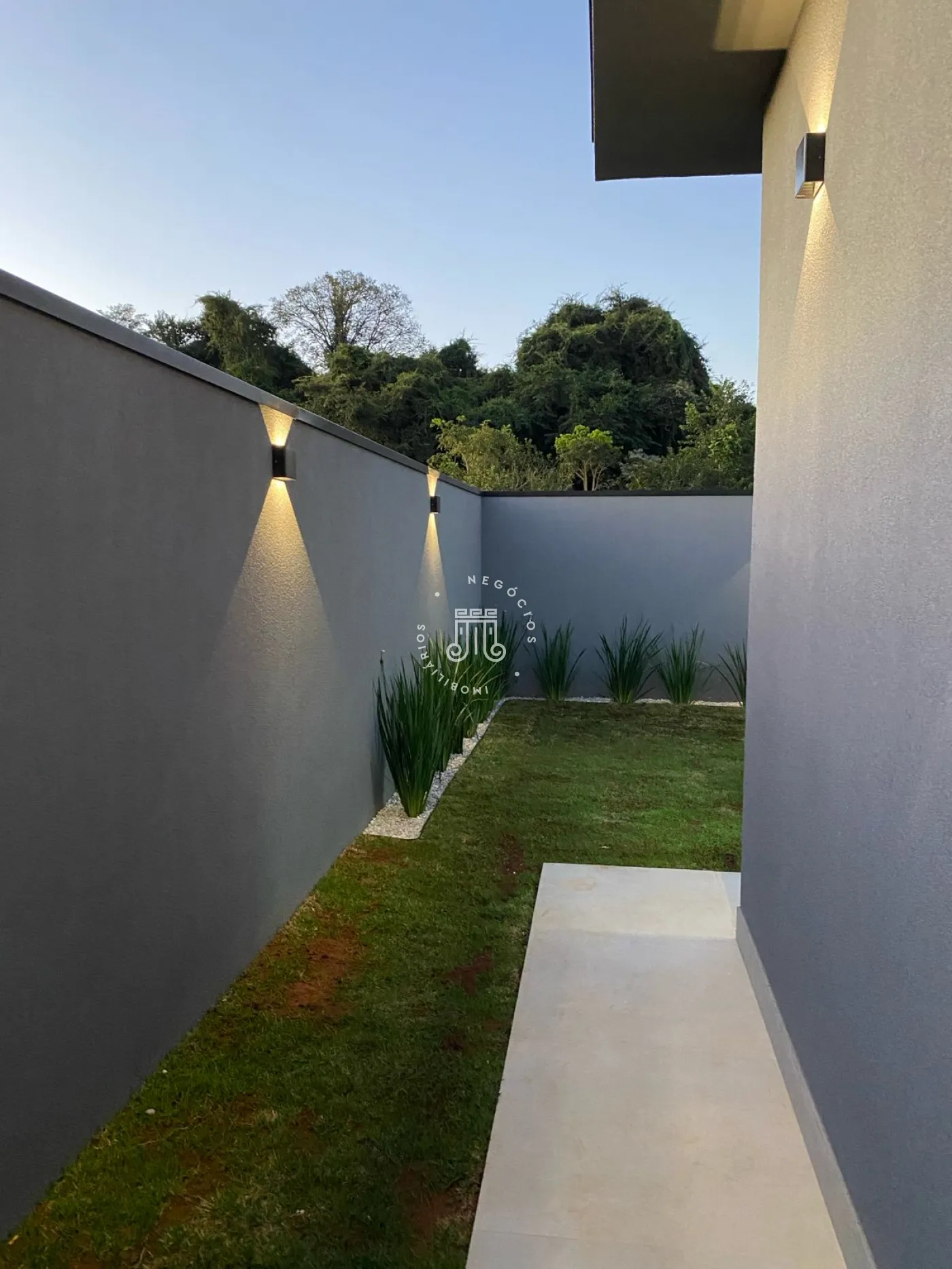 A garagem tem capacidade para dois veículos e conta com fachada com viga metálica e forro de madeira. O imóvel dispõe de sistema de aquecimento solar, infraestrutura para ar-condicionado e persianas elétricas nos quartos.