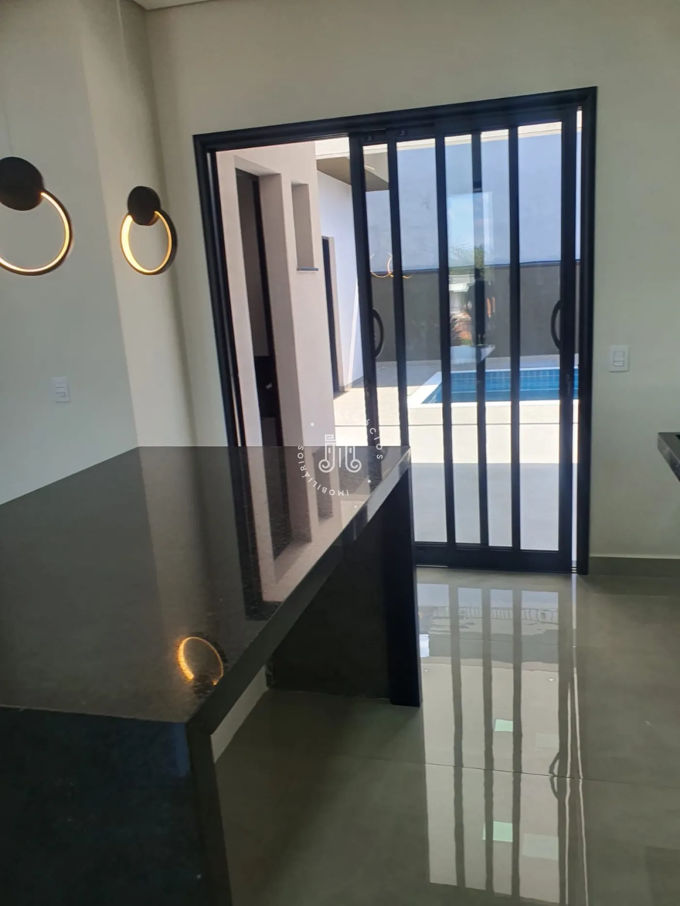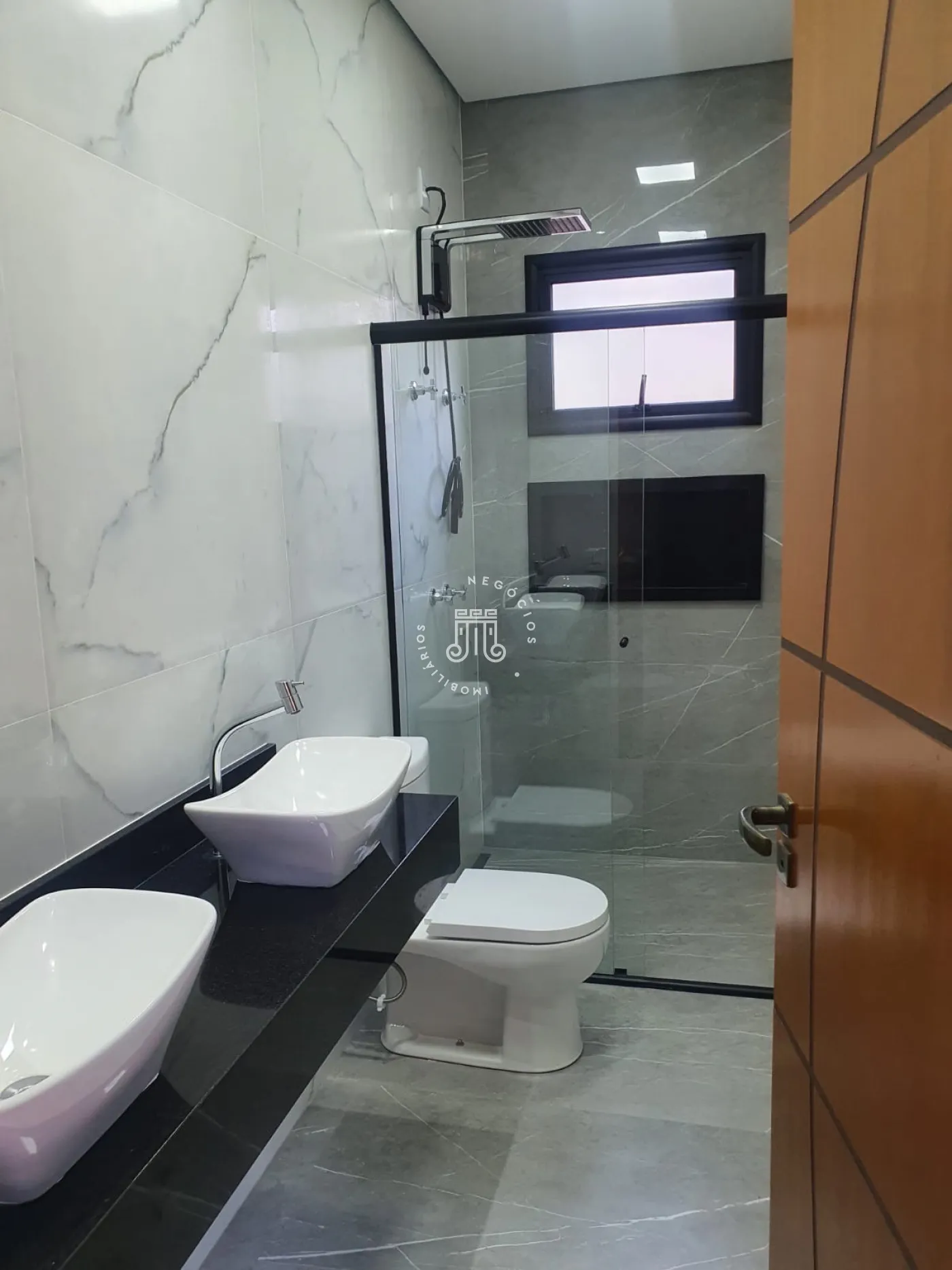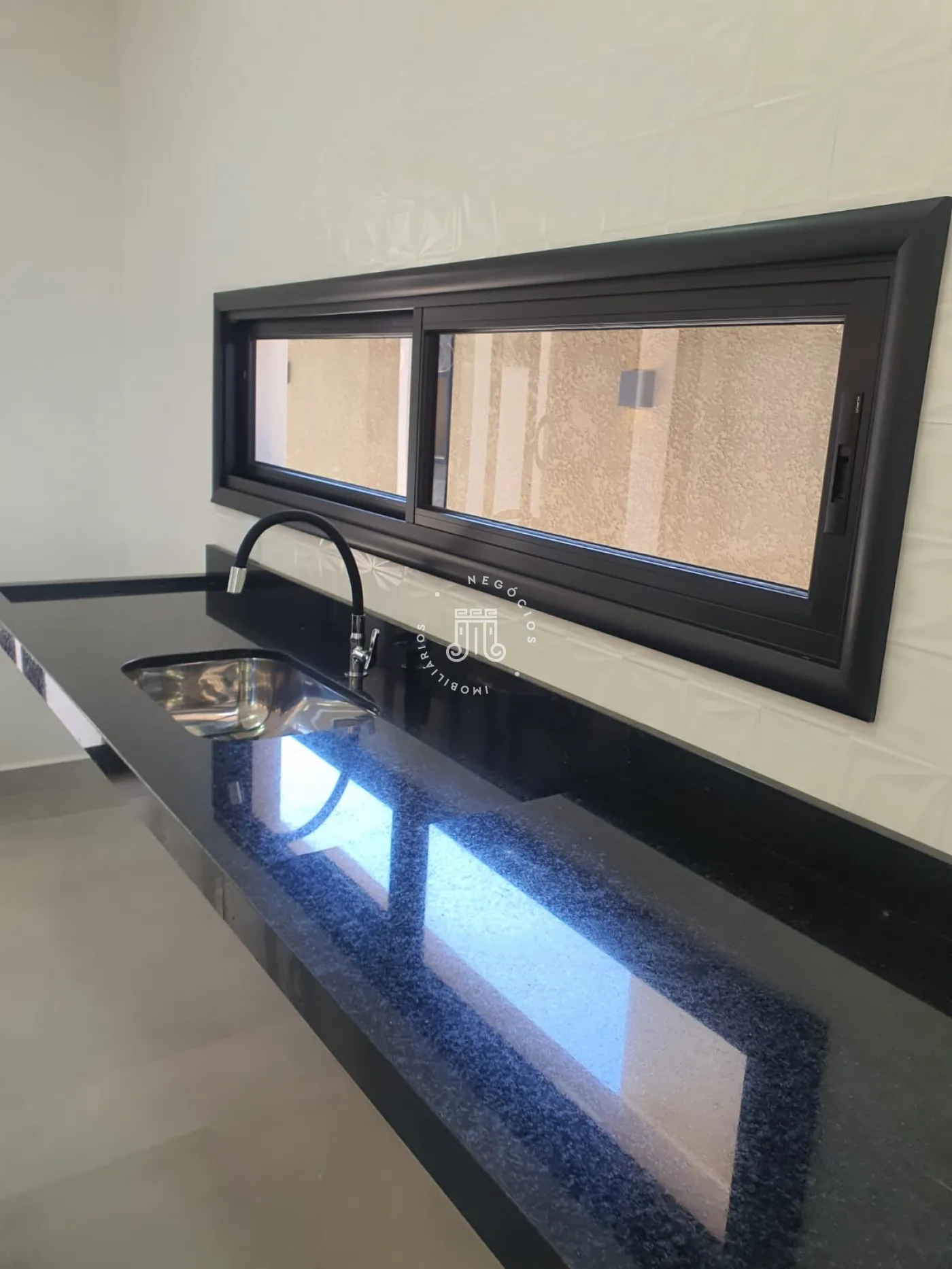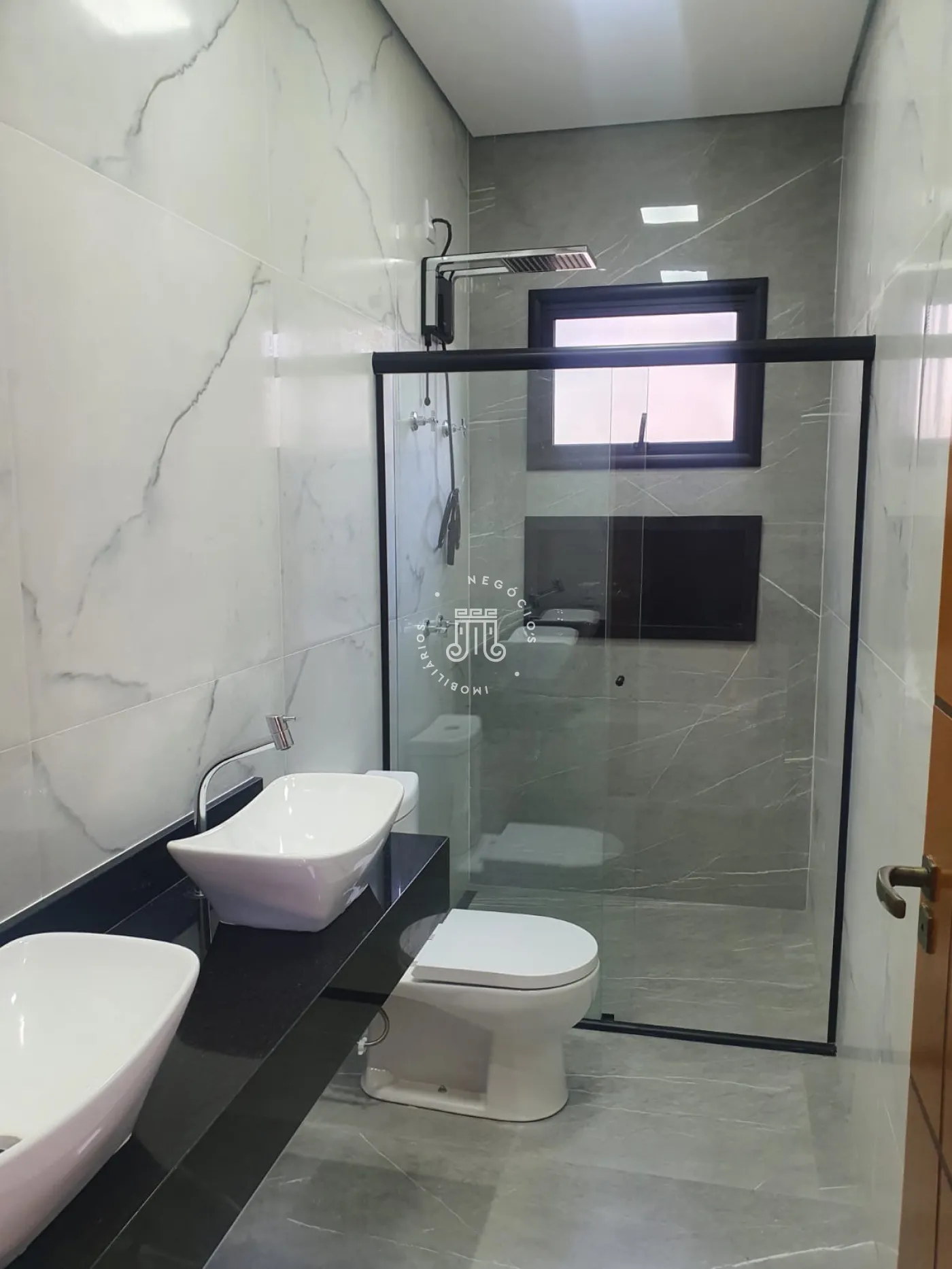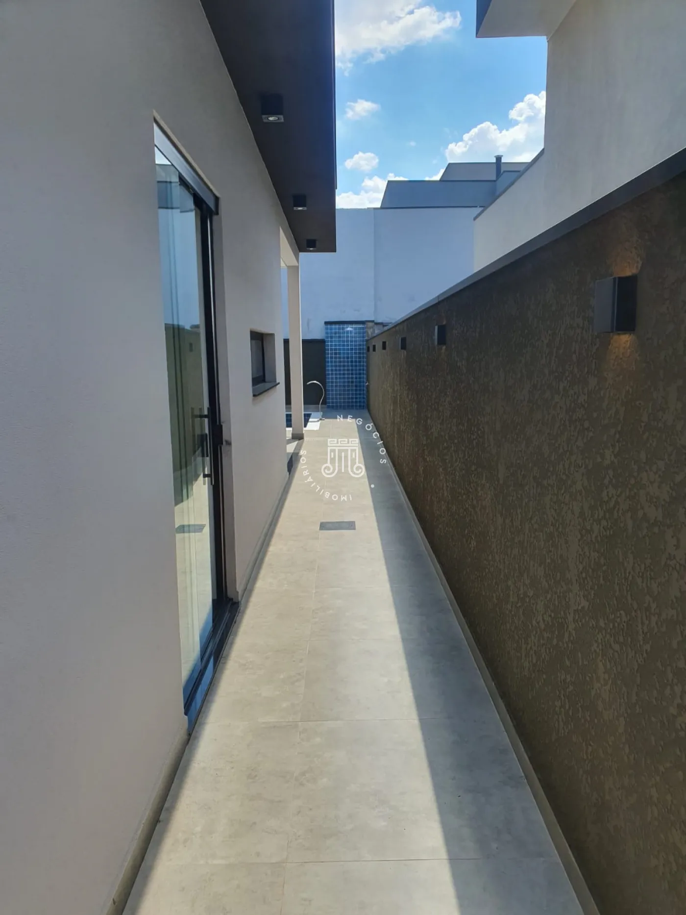 O imóvel conta com 3 quartos, sendo os 3 suítes com box de vidro nos banheiros, sala, cozinha com ilha, área de serviço, área gourmet com churrasqueira e piscina com aquecimento solar e cascata, vaga para 2 carros e um corredor lateral que da acesso ao fundo da casa.
