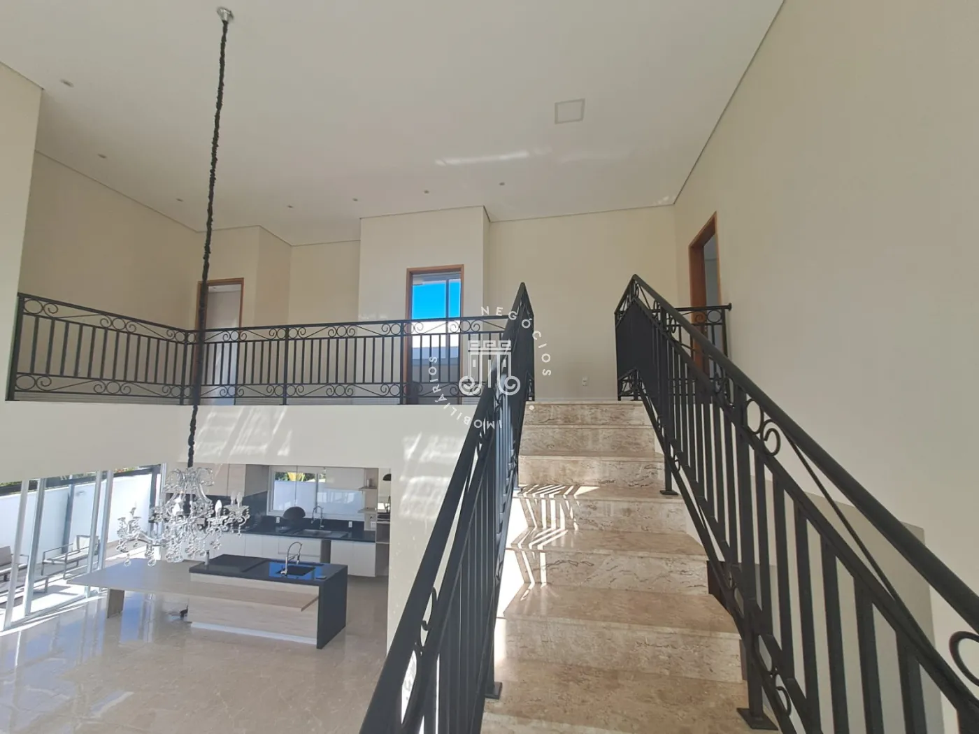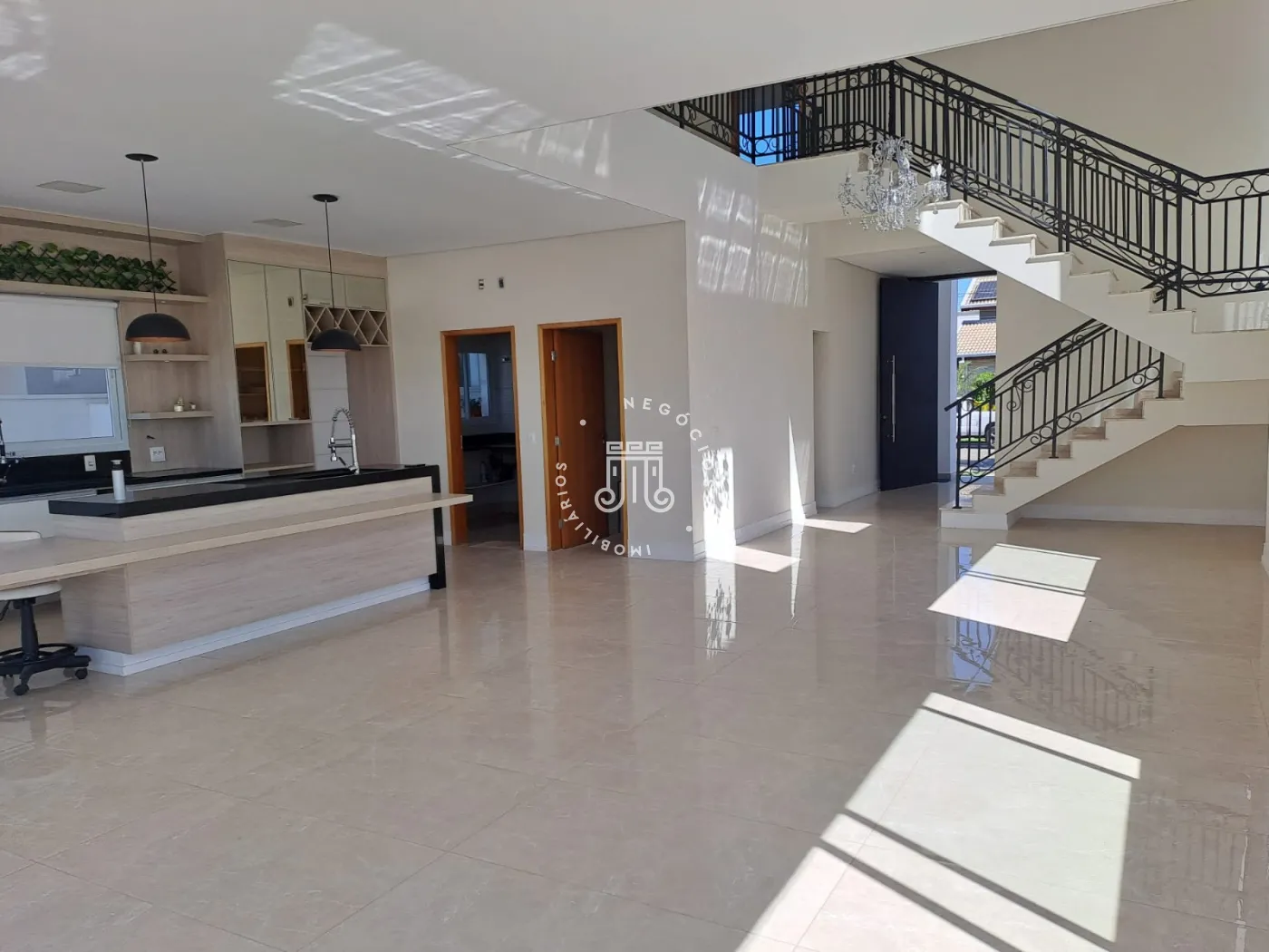 Sala ampla com dois ambientes e pé direito duplo, que valoriza a iluminação natural e a sensação de amplitude