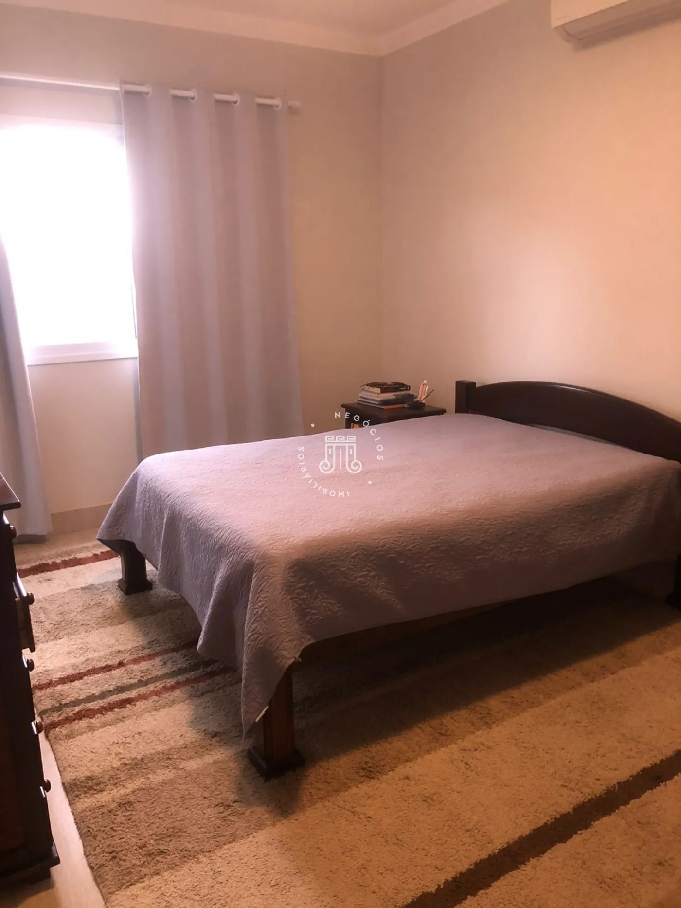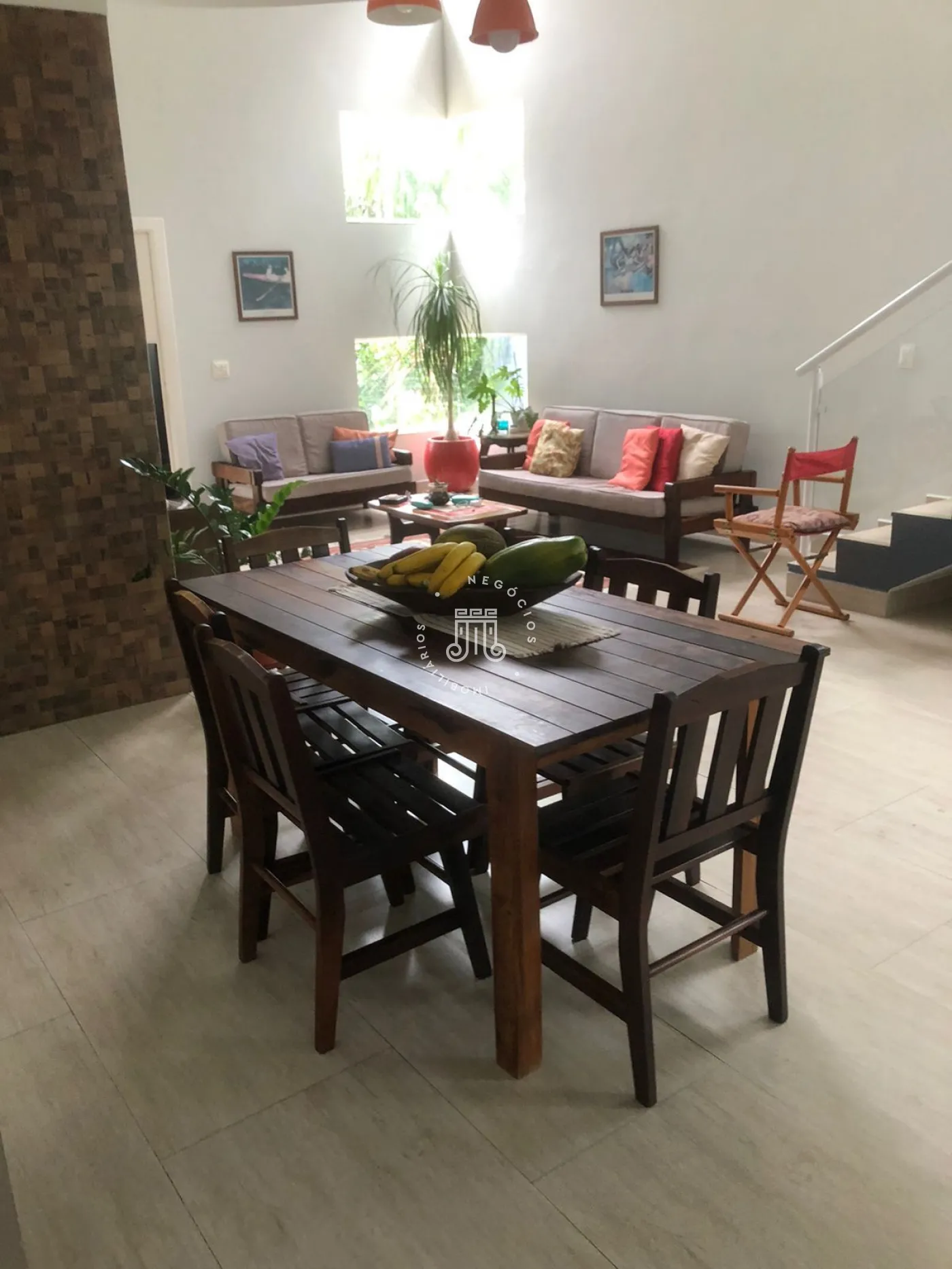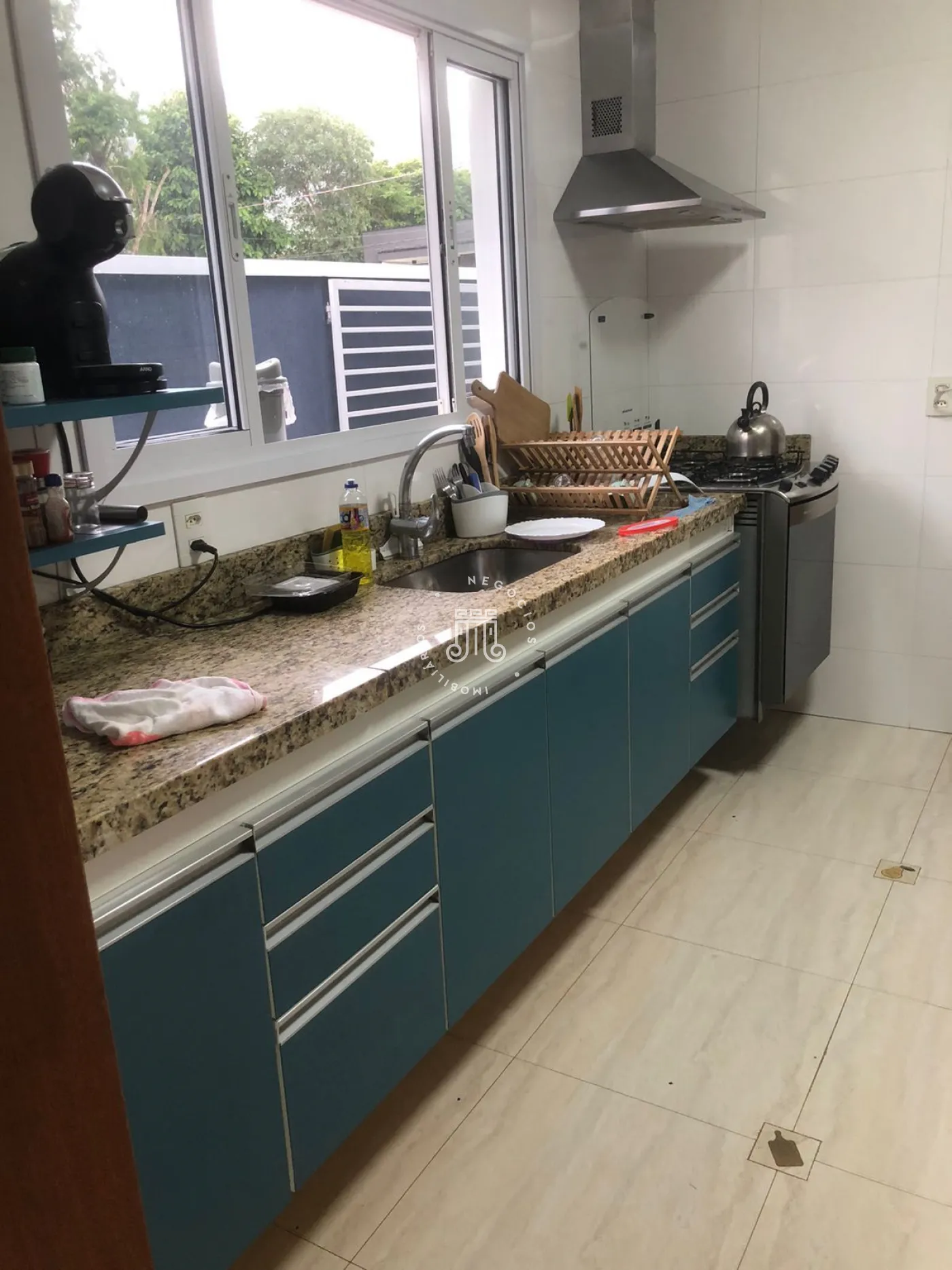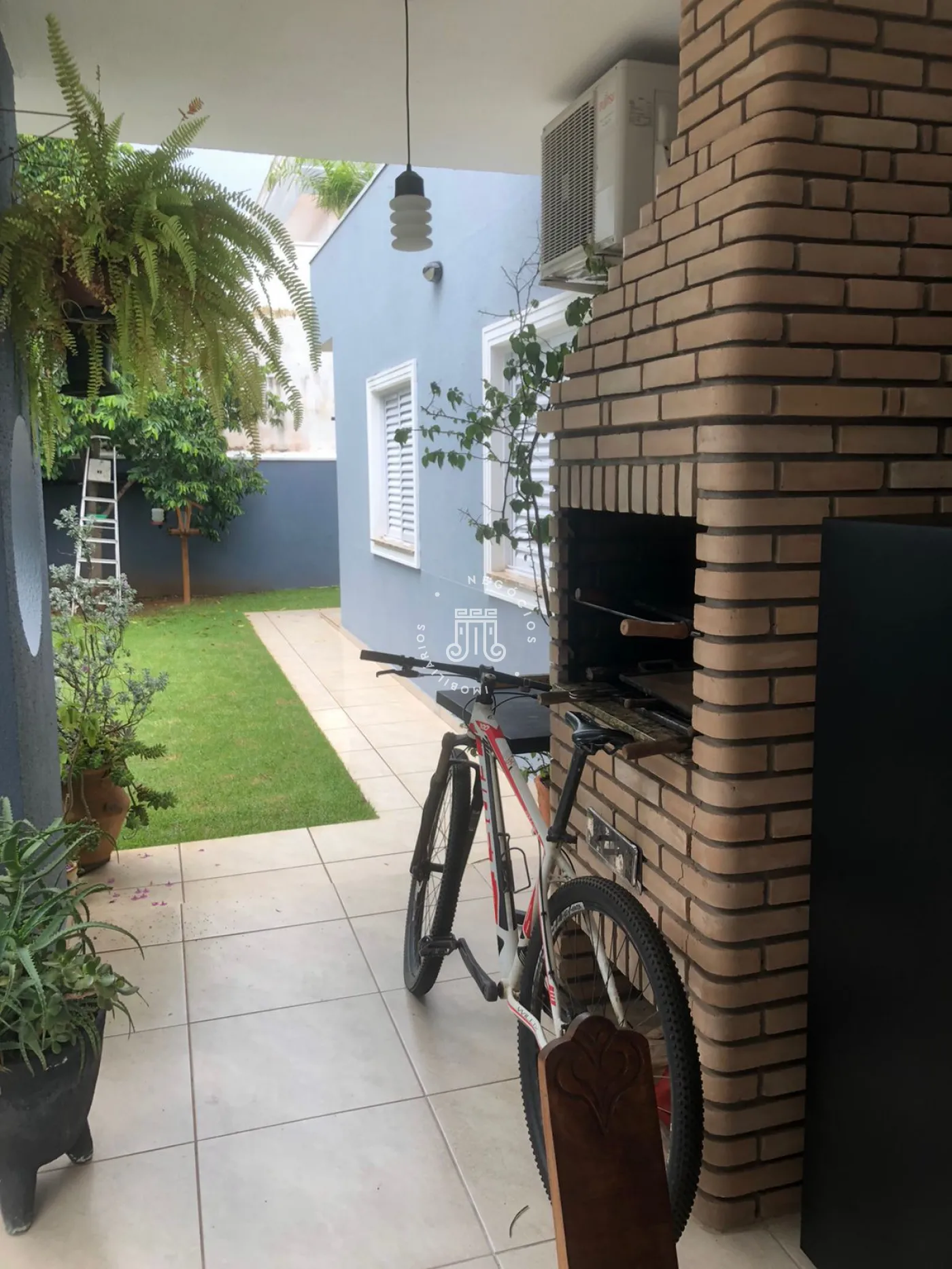 O imóvel conta com três quartos, sendo um deles uma suíte com closet. A sala possui pé-direito duplo e é integrada à cozinha, que dispõe de uma despensa. A área externa inclui churrasqueira, jardim, quintal com árvore frutífera, terraço e gramado.