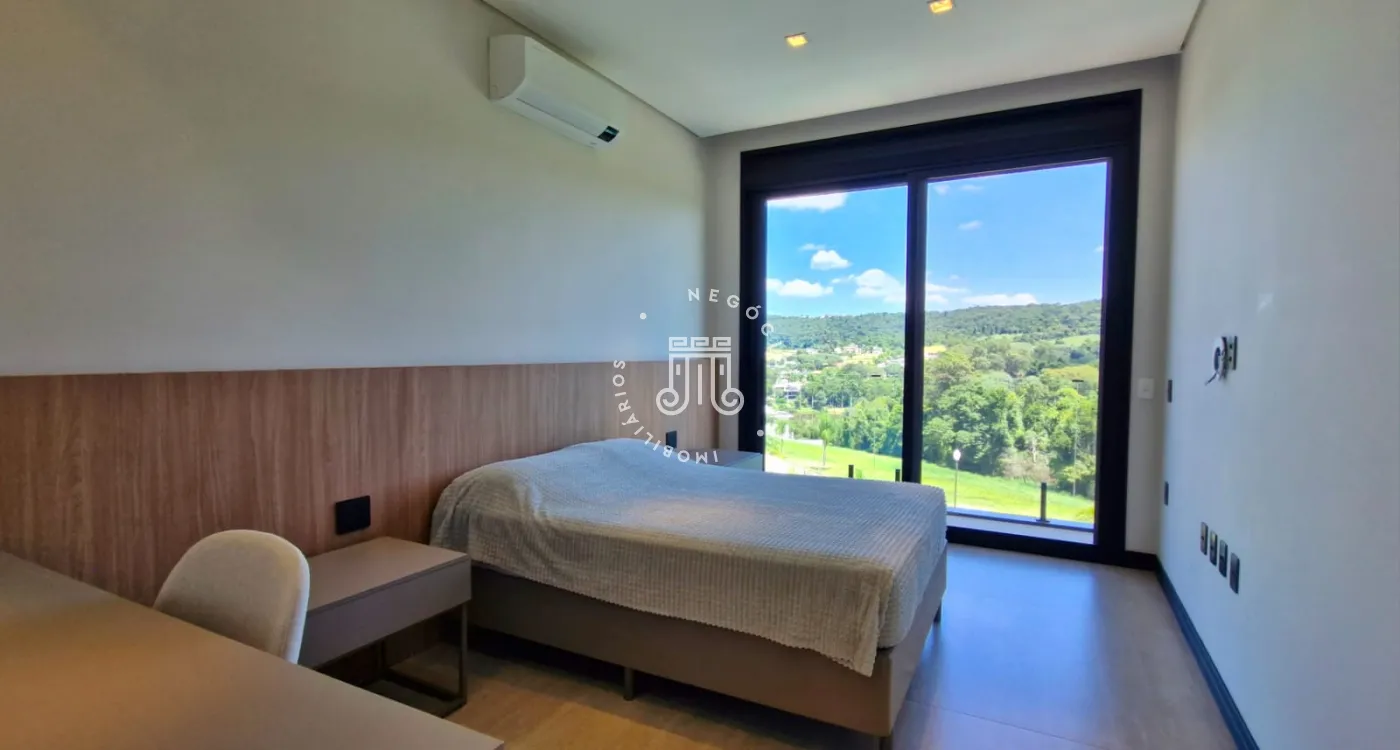 - 4 suítes, sendo 1 suíte master com closet grande, hidromassagem esculpida e varanda com estar externo e vista para a mata e lago do condomínio