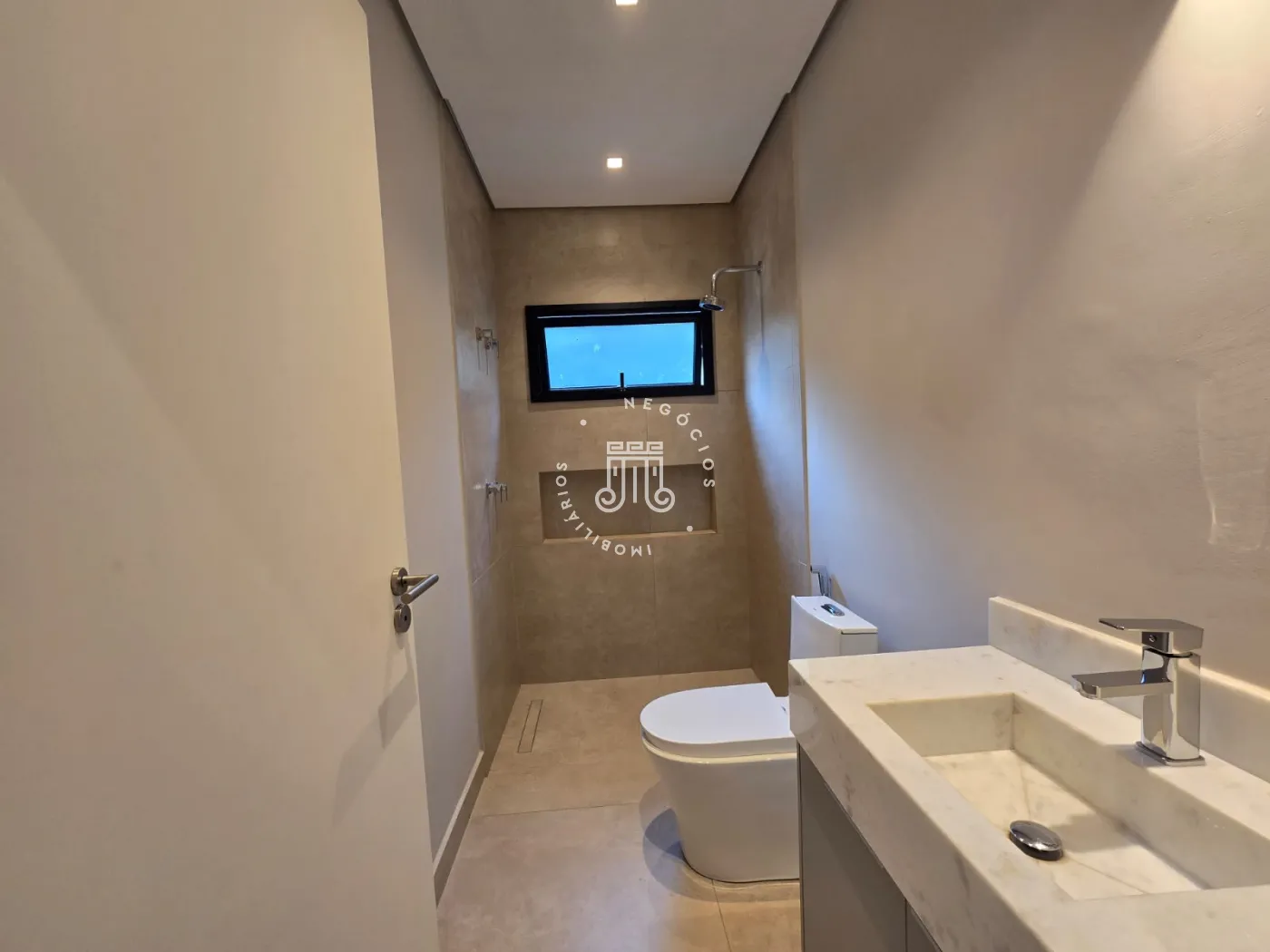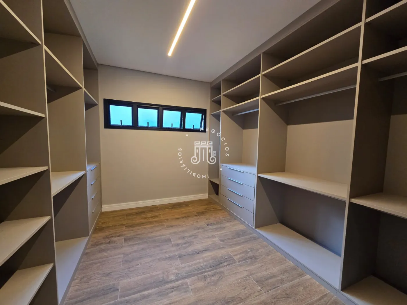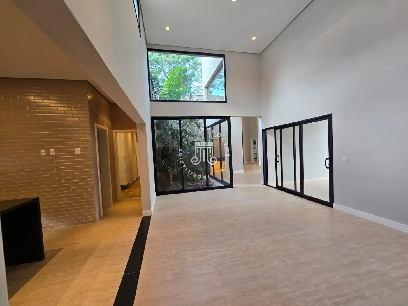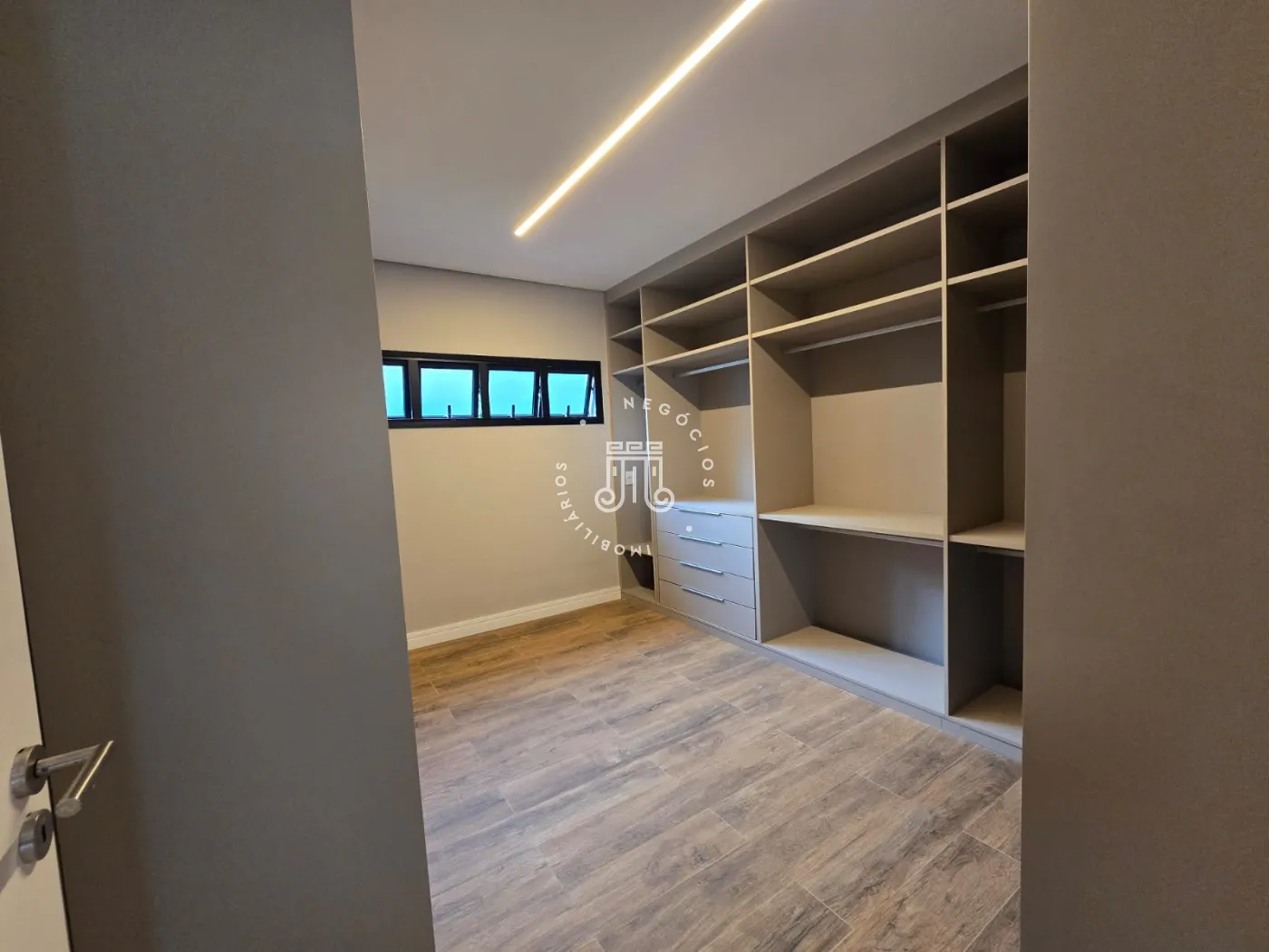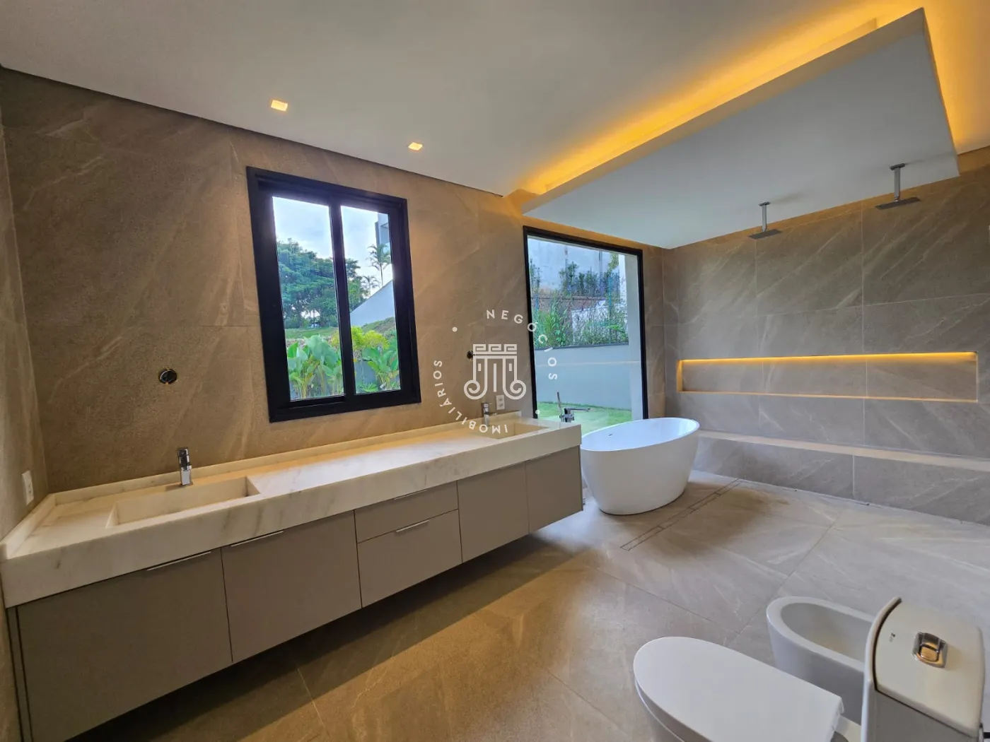 Um projeto moderno, funcional e acabamento de alto padrão. O imóvel conta com 5 suítes (sendo 1 master com banheira e closet), além de suíte para funcionário, totalizando 7 banheiros. Ambientes integrados e bem distribuídos, com sala de estar e jantar com pé-direito duplo, escritório, cozinha americana, jardim de inverno, lavanderia, despensa e depósito. Na área externa, destaque para a piscina de 4,5 x 15 metros, espaço gourmet integrado ao deck, ampla área gramada e pit fire, ideal para lazer e recepção. Infraestrutura completa com foco em eficiência: boiler com apoio elétrico e a gás, preparação para aquecimento solar (casa e piscina), pronta para energia fotovoltaica e iluminação 100% LED. Garagem coberta para 3 veículos.