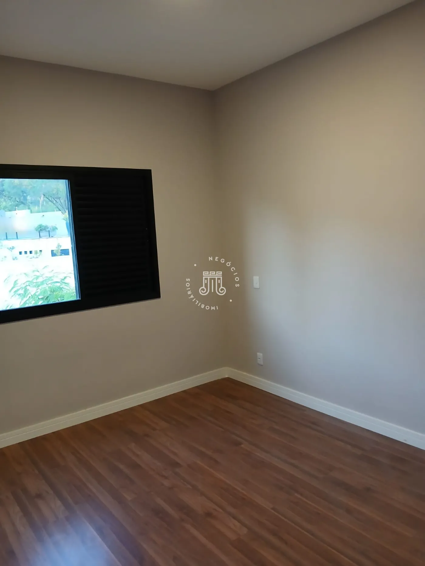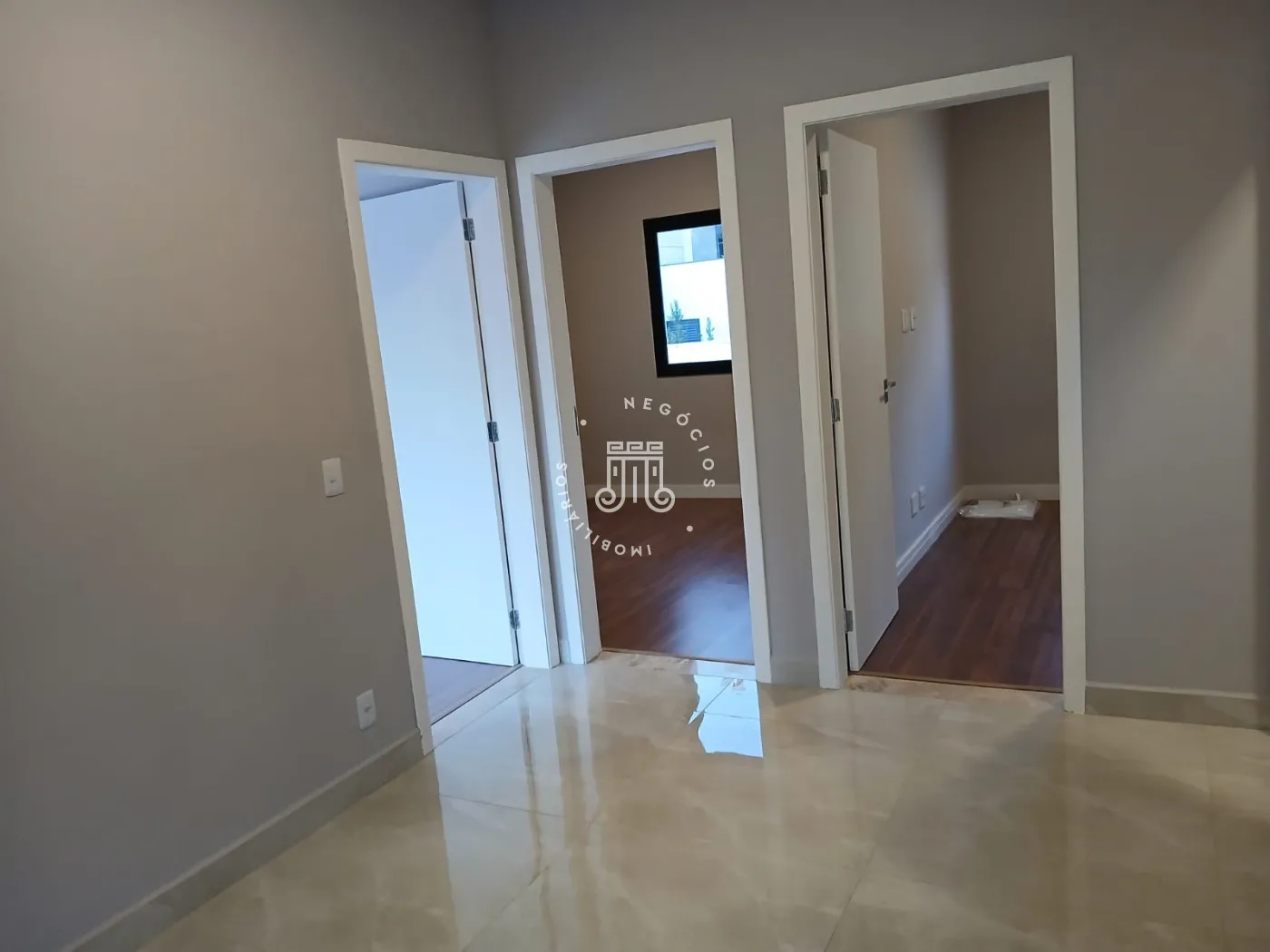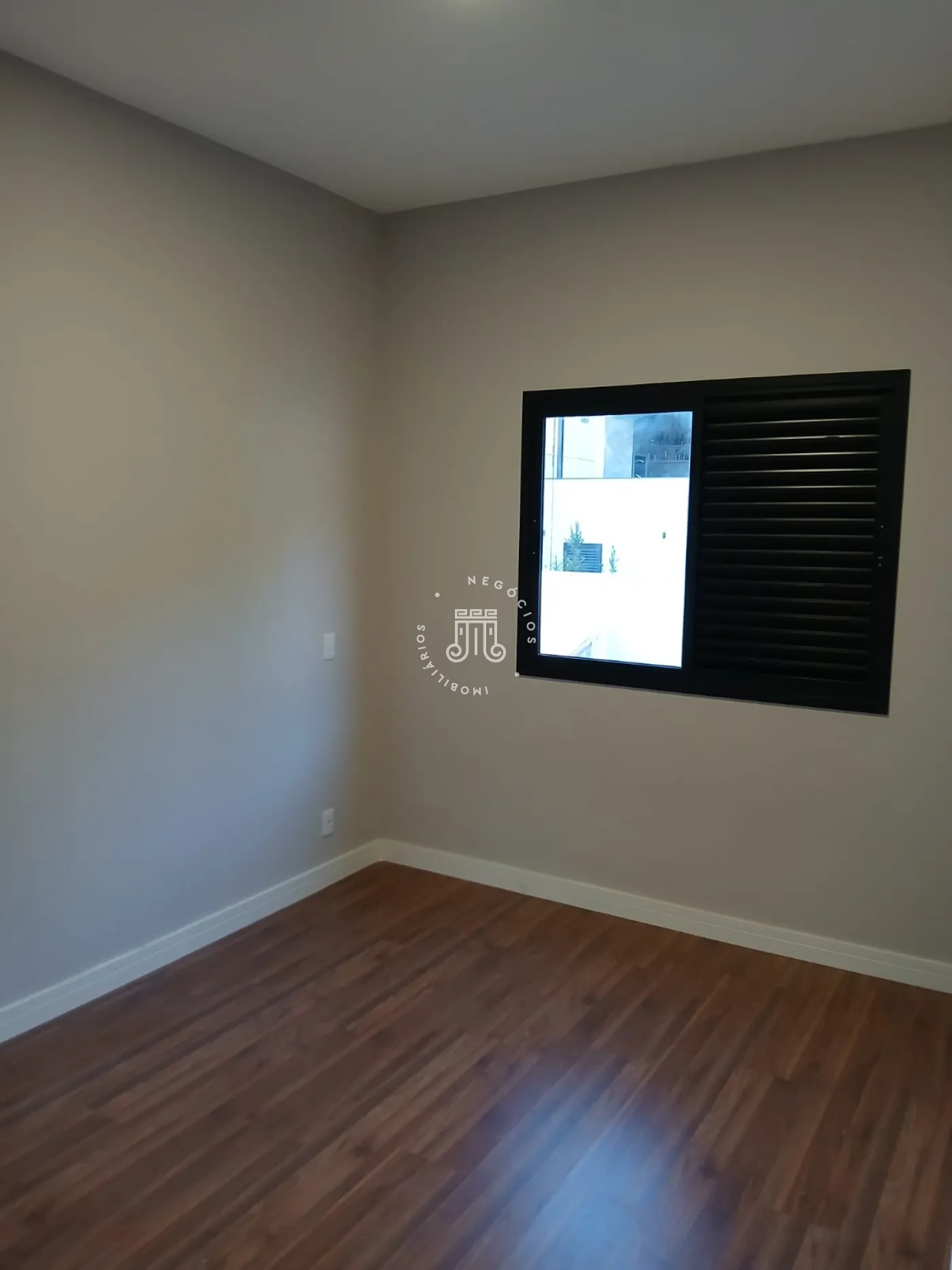 No piso superior, há três quartos, sendo um deles suíte com varanda, além de um banheiro social com box de vidro e uma área entre os quartos. No piso inferior, a sala é distribuída em dois ambientes com pé-direito duplo e integrada à cozinha americana. O espaço também conta com lavabo, área gourmet e duas vagas de garagem cobertas.
