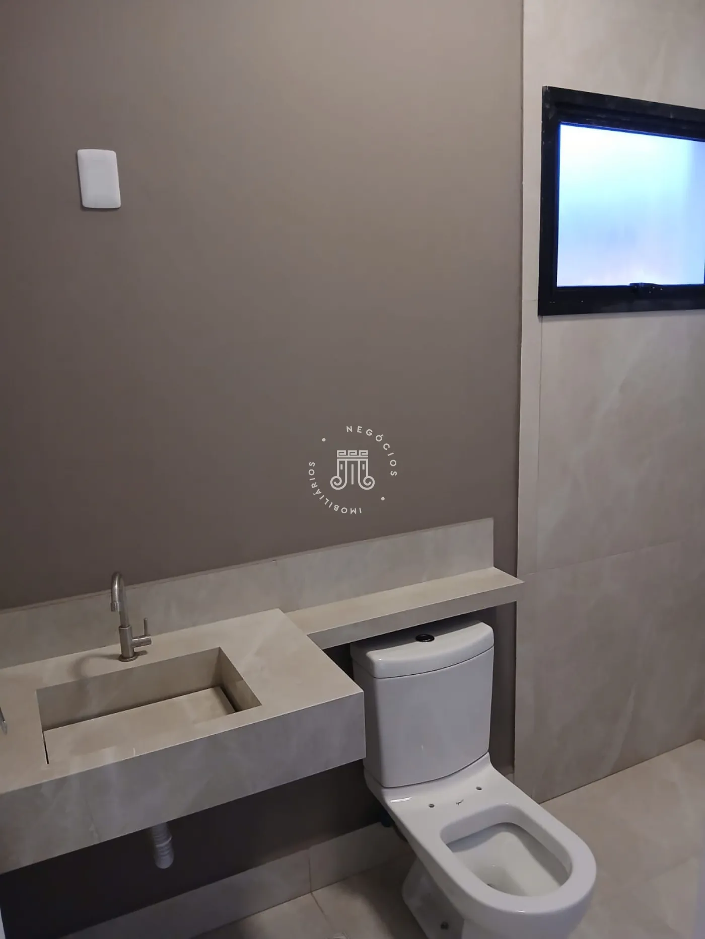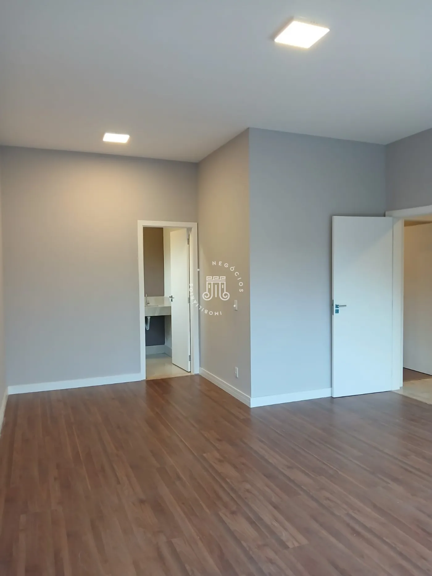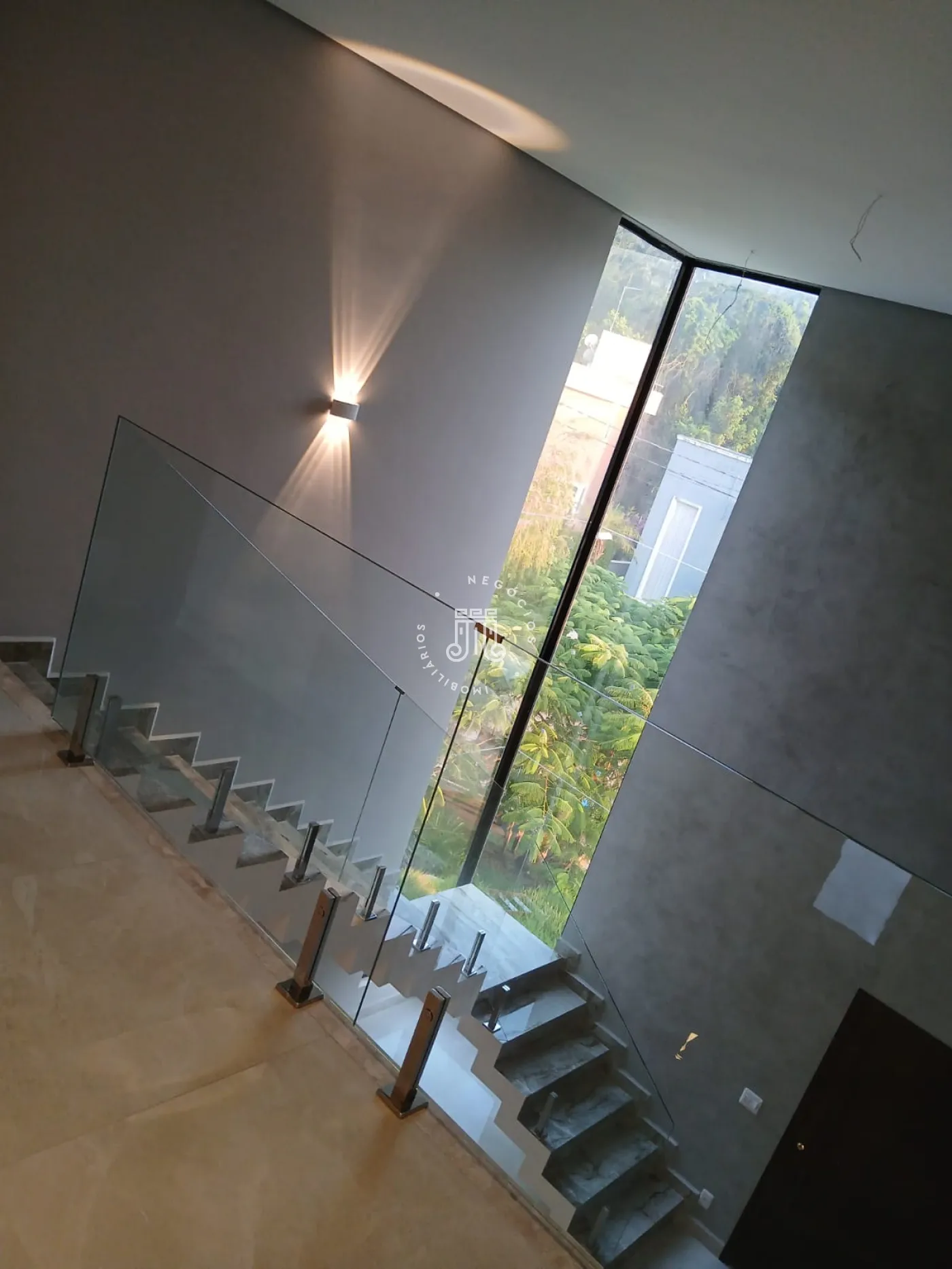 No piso superior, há três quartos, sendo um deles suíte com varanda, além de um banheiro social com box de vidro e uma área entre os quartos. No piso inferior, a sala é distribuída em dois ambientes com pé-direito duplo e integrada à cozinha americana. O espaço também conta com lavabo, área gourmet e duas vagas de garagem cobertas.