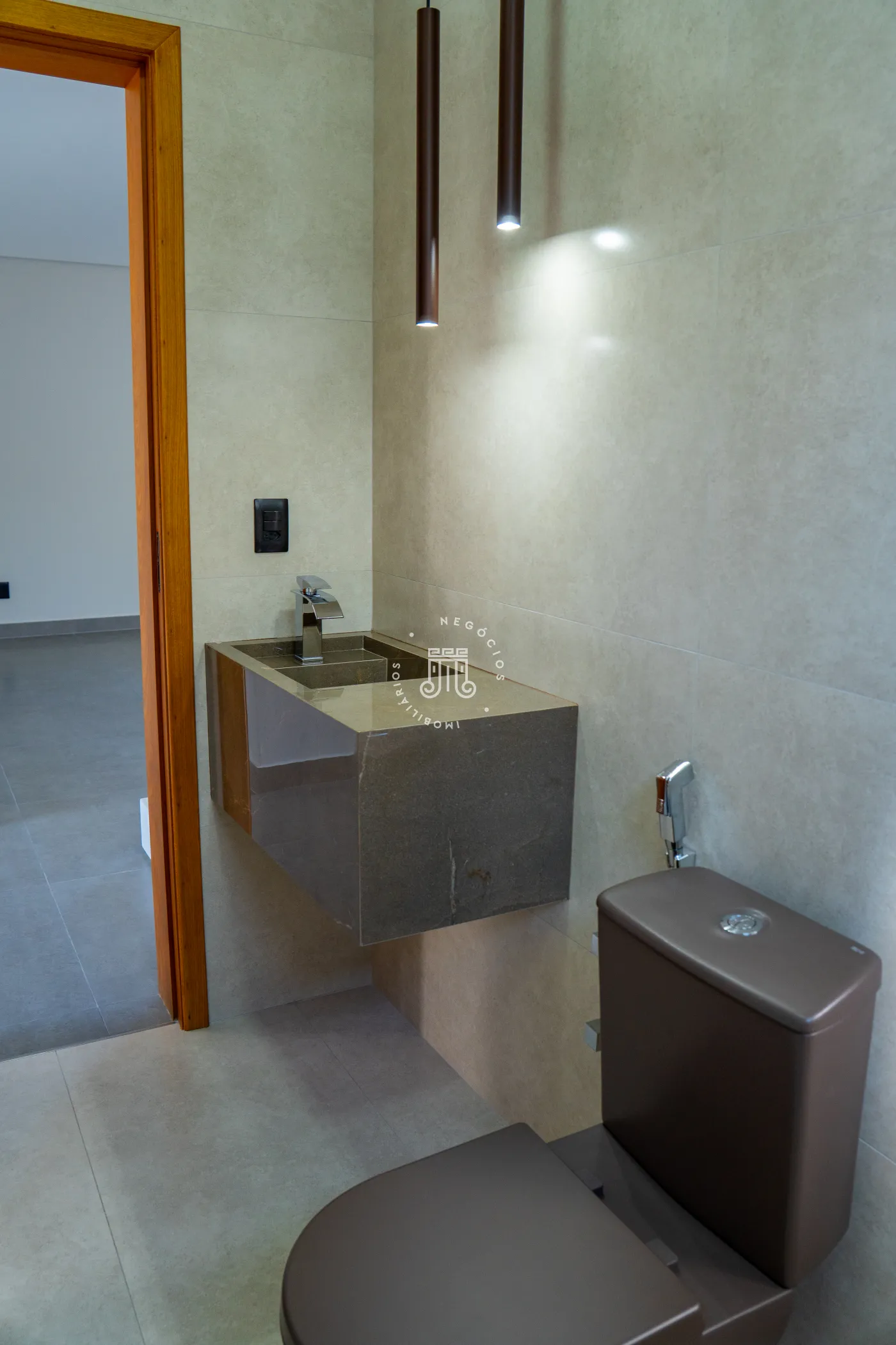 No piso inferior, localiza-se um quarto reversível, com possibilidade de uso como escritório ou sala de TV. Ainda neste pavimento, encontram-se um banheiro que também pode servir como lavabo, uma despensa, sala de estar, sala de jantar, cozinha, lavanderia, área gourmet, piscina, banheiro de apoio à piscina e à área gourmet, além de um quarto destinado a despejo.