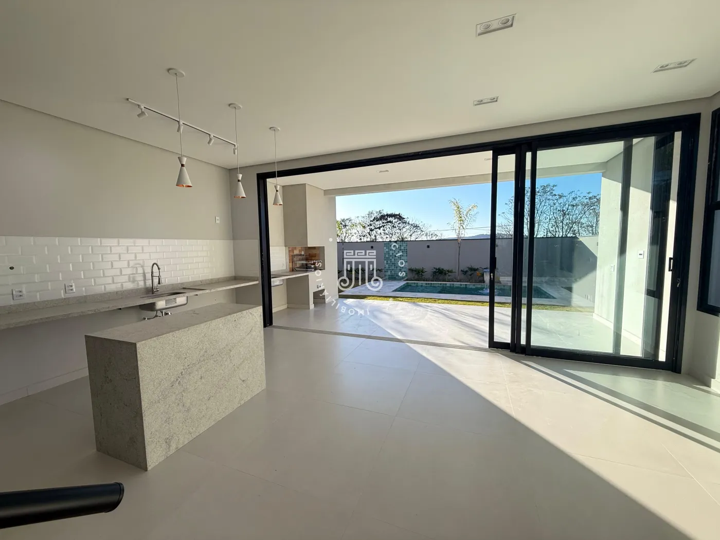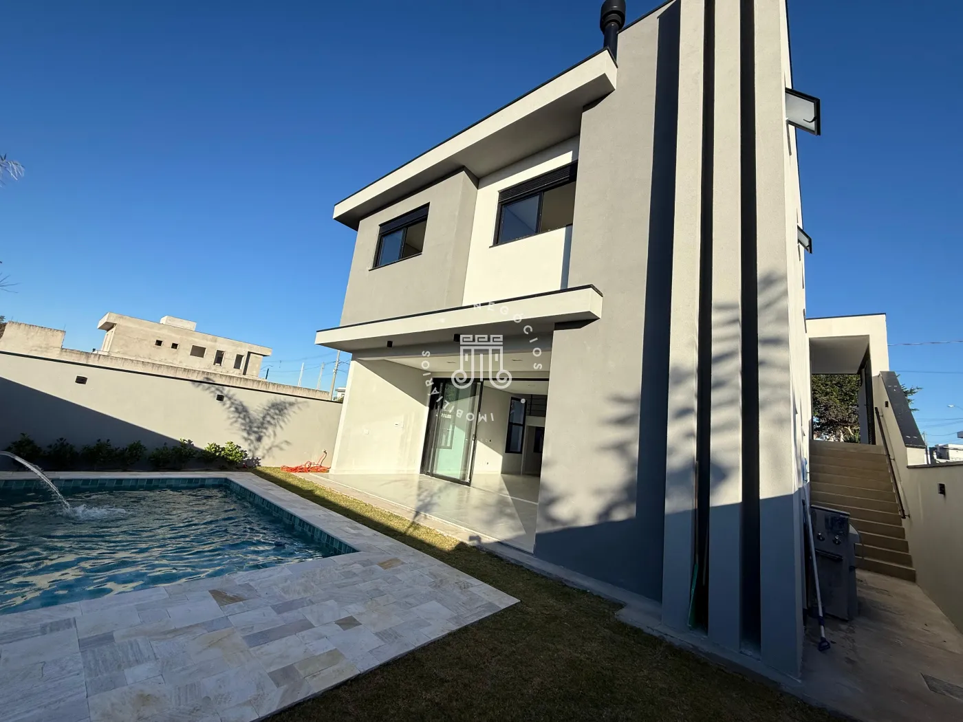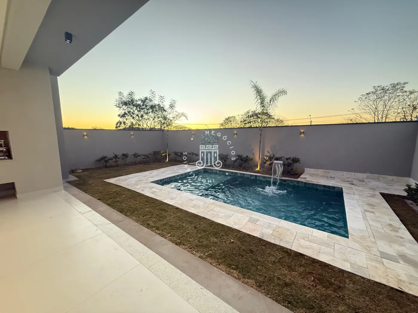Área externa com piscina, churrasqueira, varanda coberta e quintal.