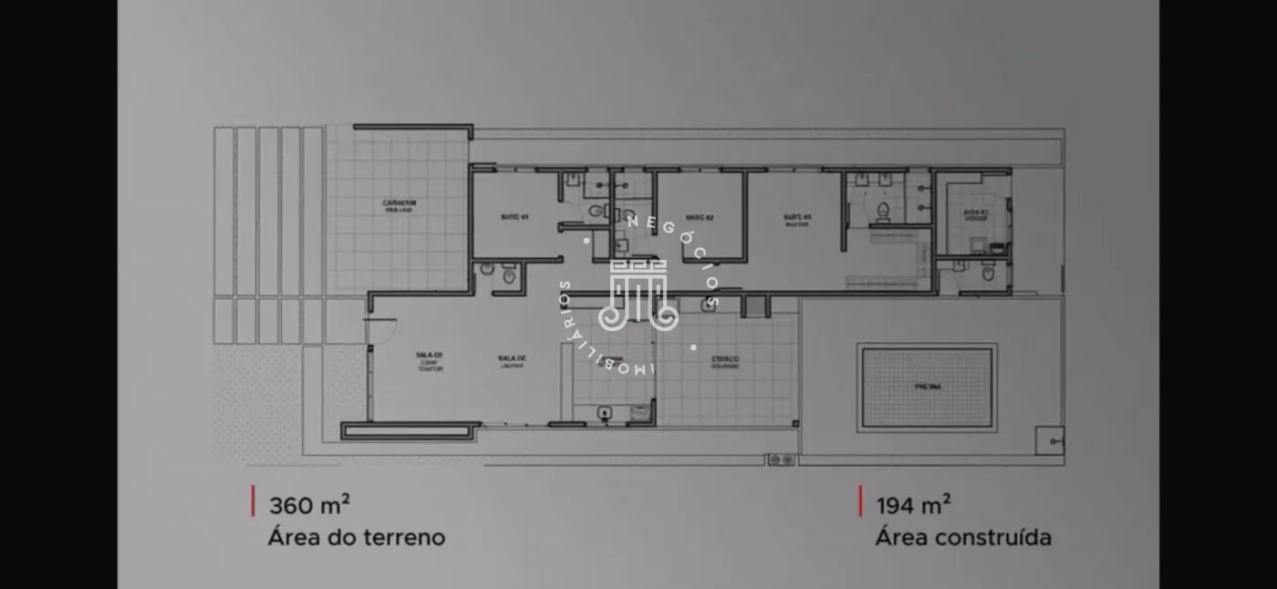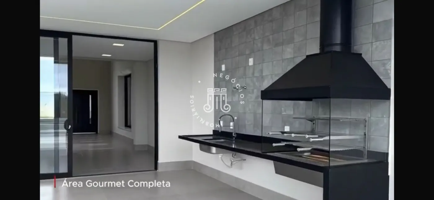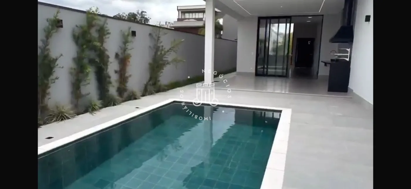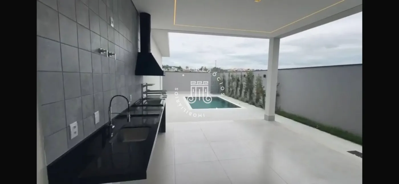 O imóvel possui três suítes, sendo um suite master com janelas automatizadas, sala e cozinha integrada, cozinha com cooktop, lavabo, área de serviço, espaço gourmet com piscina e churrasqueira. Garagem para 4 veículos (2 cobertos).