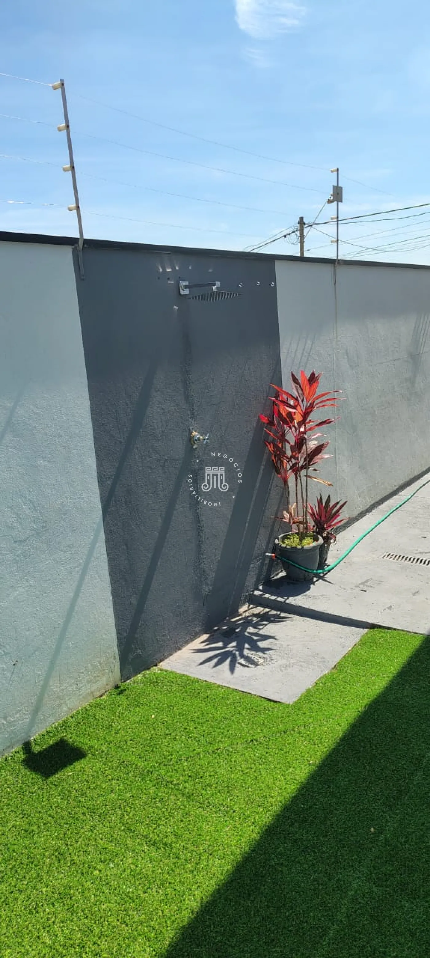 Área externa com churrasqueira, grama sintética e chuveiro.