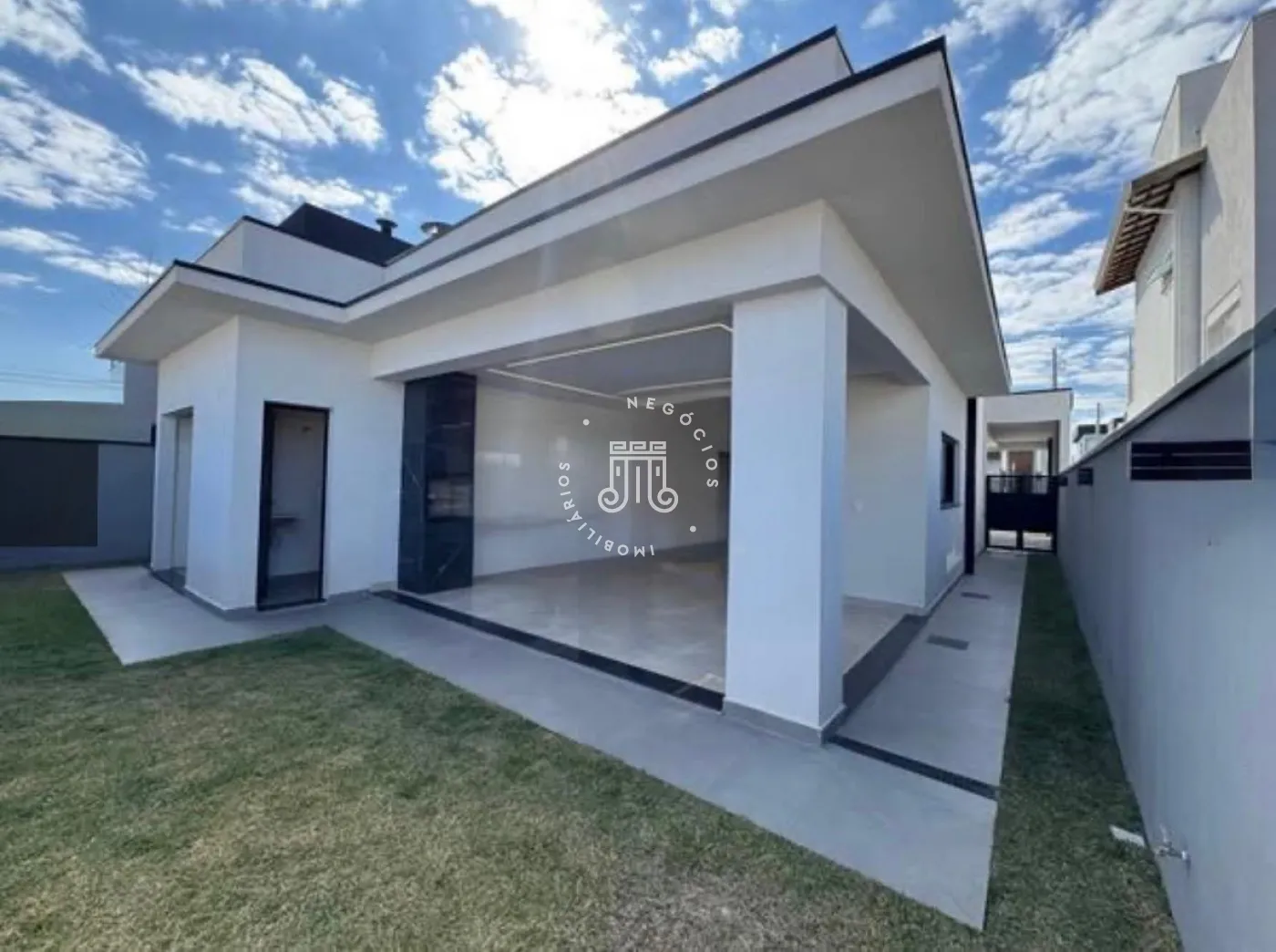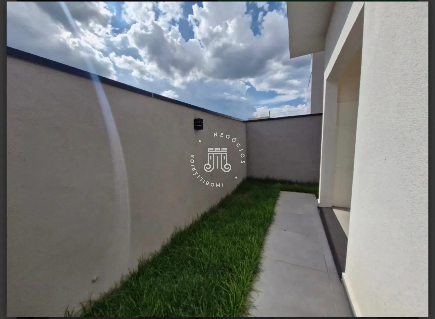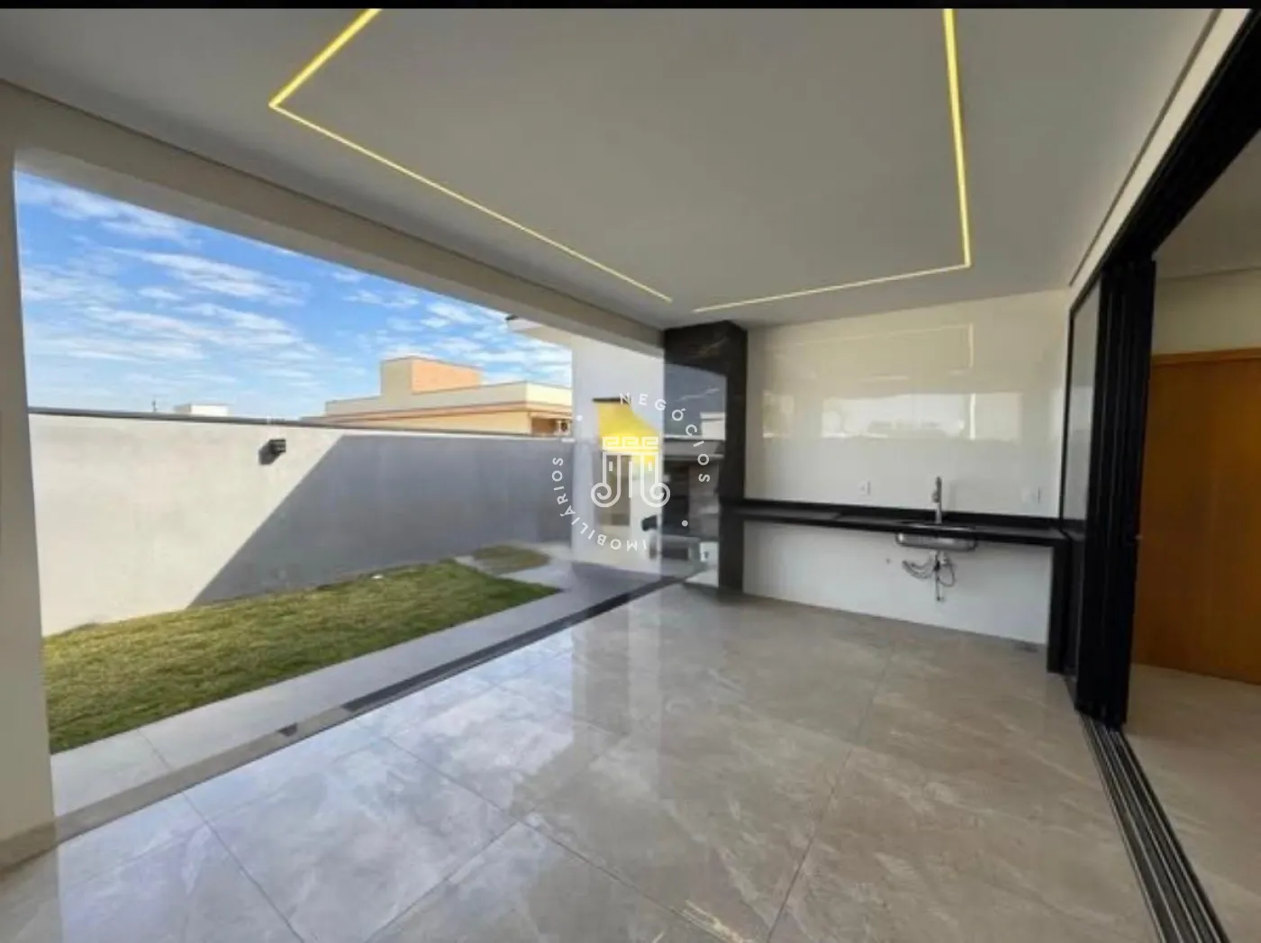 A residência conta com três dormitórios, sendo duas suítes, uma delas com closet, além de dois banheiros sociais. A cozinha é integrada à sala de jantar e à sala de estar. Dispõe de lavanderia , espaço gourmet conta com bancada, churrasqueira e cobertura integrada. Possui acesso direto ao jardim, permitindo integração com a área externa com churrasqueira ,e garagem para quatro veículos, sendo duas vagas cobertas. O imóvel possui instalação preparada para boiler.