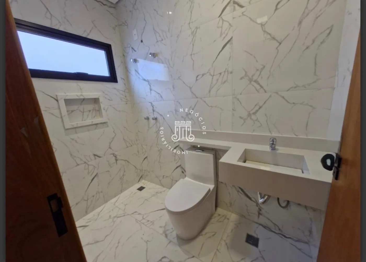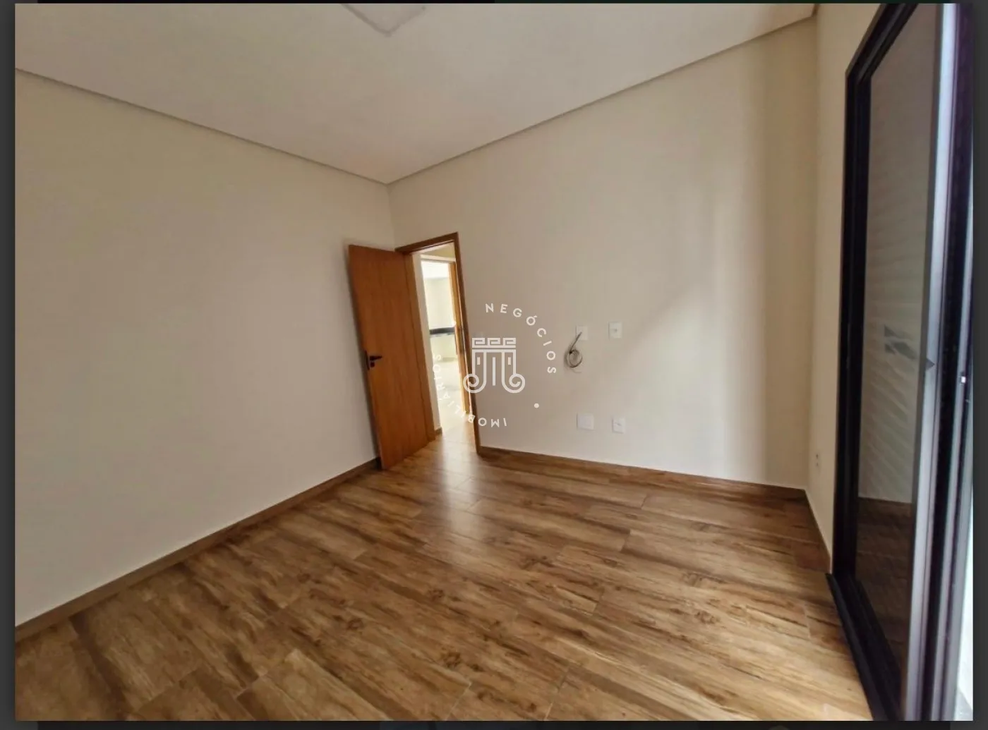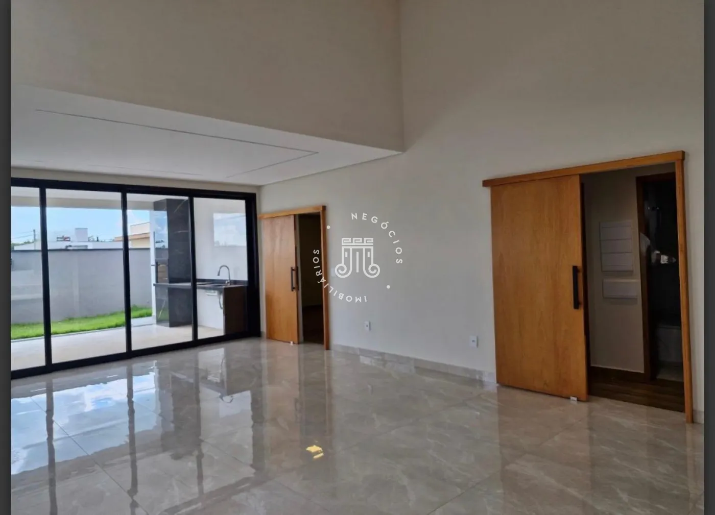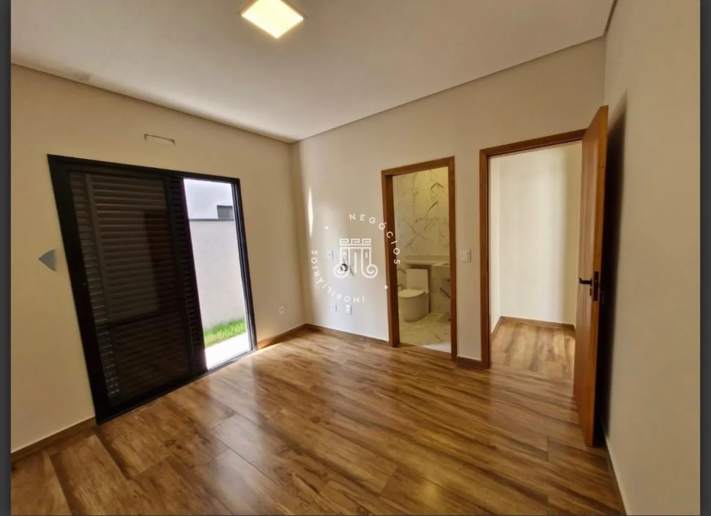 A residência conta com três dormitórios, sendo duas suítes, uma delas com closet, além de dois banheiros sociais. A cozinha é integrada à sala de jantar e à sala de estar. Dispõe de lavanderia , espaço gourmet conta com bancada, churrasqueira e cobertura integrada. Possui acesso direto ao jardim, permitindo integração com a área externa com churrasqueira ,e garagem para quatro veículos, sendo duas vagas cobertas. O imóvel possui instalação preparada para boiler.