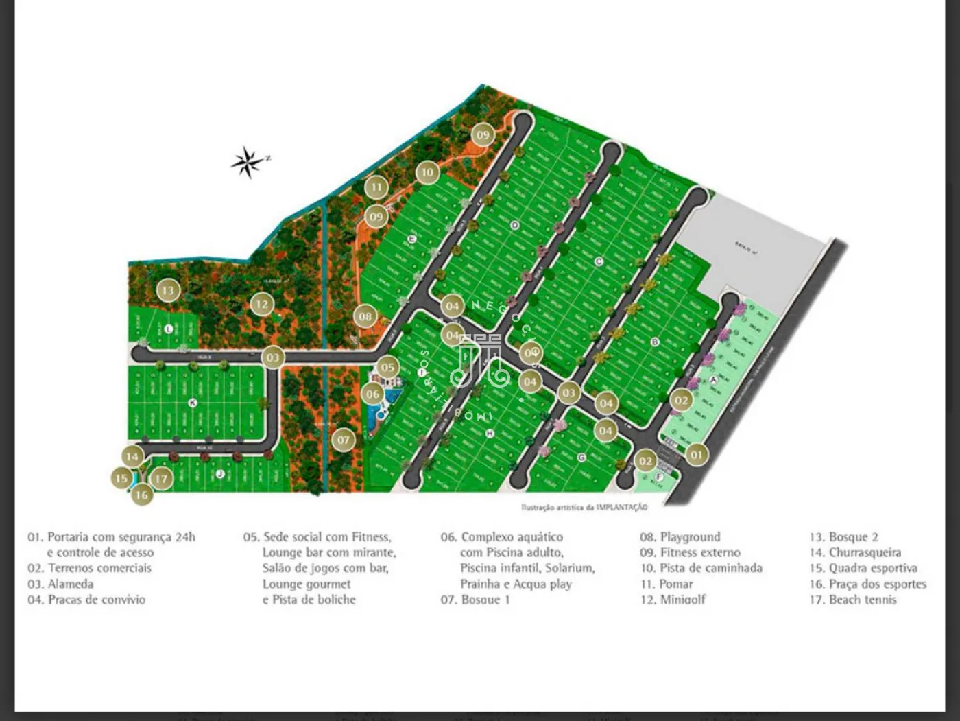 Condomínio com 167 lotes e lazer completo: Praça de convívio, sede social com: fitness, longe bar com mirante, salão de festas com bar, longe gourmet e pista de boliche, complexo aquático, bosque, playground, fitness externo, pomar, minigolf, churrasqueira, quadra esportiva, beach tennis.
