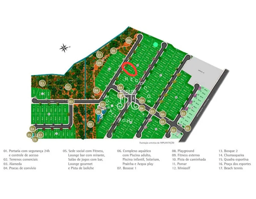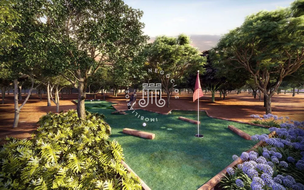 Condomínio completo com complexo aquático, quadra esportiva, praça dos esportes, beach tênis, churrasqueira, Lounge gourmet, Lounge bar com mirante, mini golf, pista de caminhada, pomar, playground, academia, salão de jogos com bar e pista de boliche.